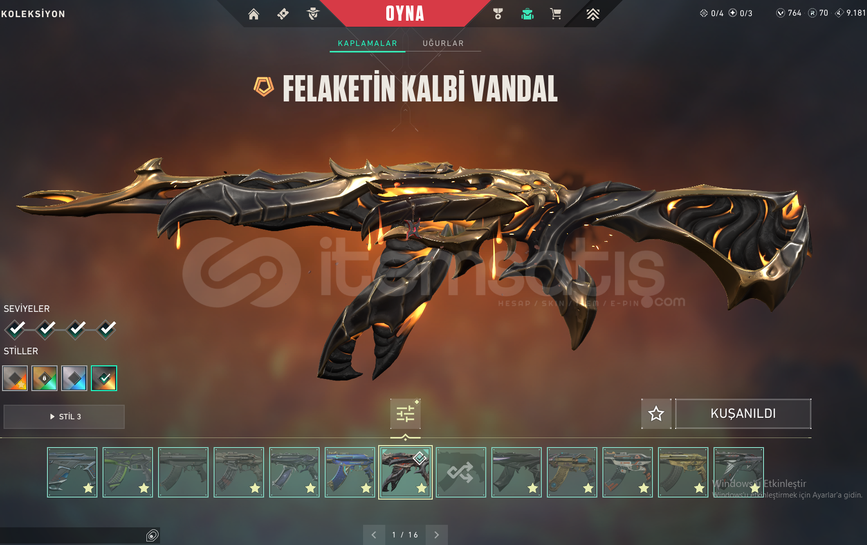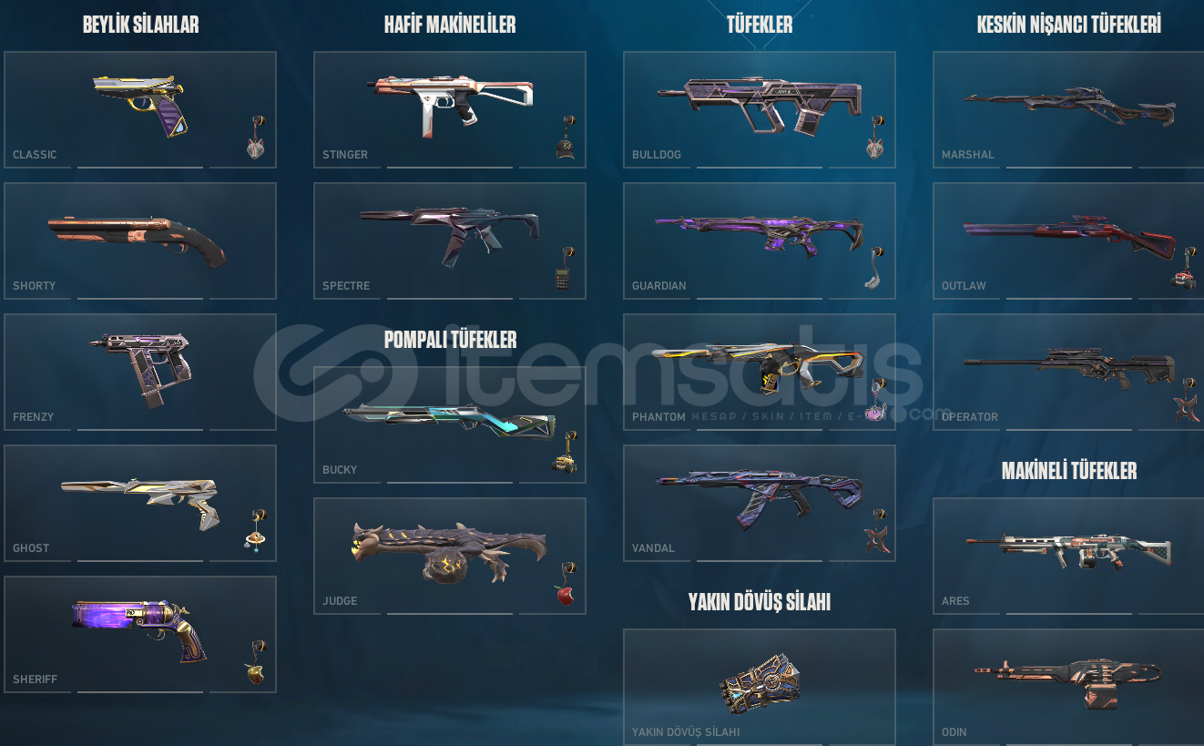 WANDAL - Kaos - Yağmacı - Faz - Arcane - Anomali - Felaketin Kalbi - Ebedi - Kuronami - RGX -PHONTOM - Seri Tetik - Anomali - Asil - Champıons - SpectrumGHOST - Anomali - Yağmacı - Ulu PençeSHERIFF - Seri Tetik - AnomaliBIÇAKLAR- VTC Karambit - Anomali - Arcane Eldivenleri - Obsidyen - Onımaru Kunıtsına - RGX Kelebek
