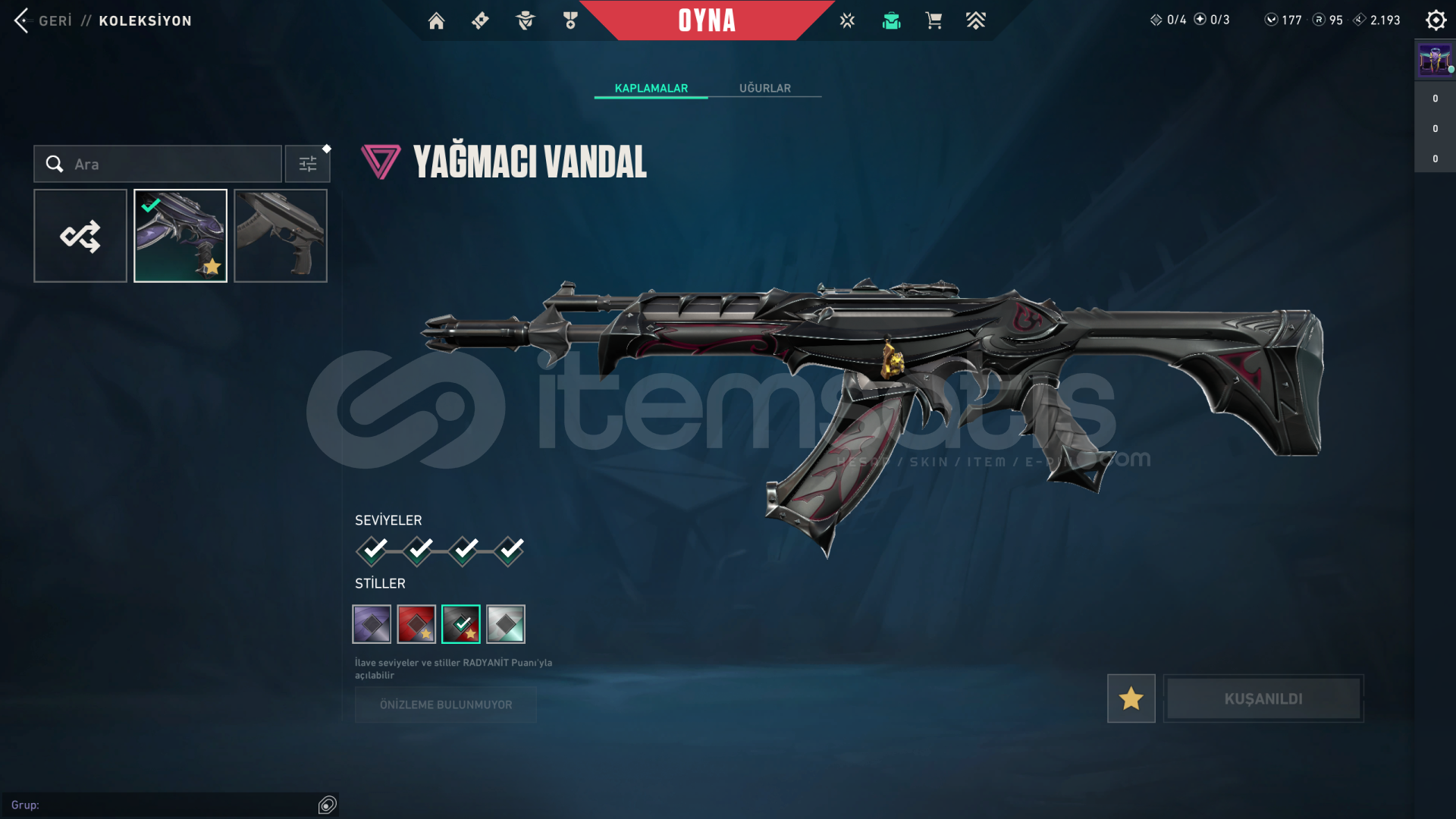 Hesapta sadece Yağmacı Vandal var, tüm renk ve efektler açık, 177 VP ve 95 Radyanit puanı vardır, Sorularınız için mesaj atınız