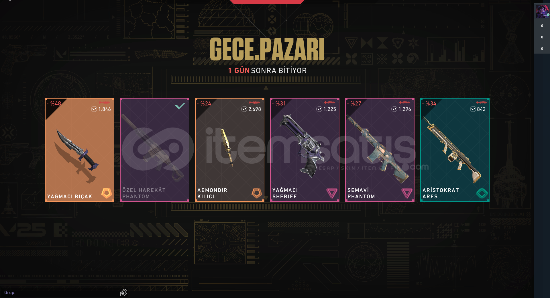 Hesapta yağmacı vandal ve ozel harekat phantom bulunmaktadırgece pazarında ucuza yağmacı bıcak vardırhesapta kesinlikle calınma riski yokturmail benim uzerimedirbi sıkıntı olursa ilgilenirimpazarlık az da olsa vardır