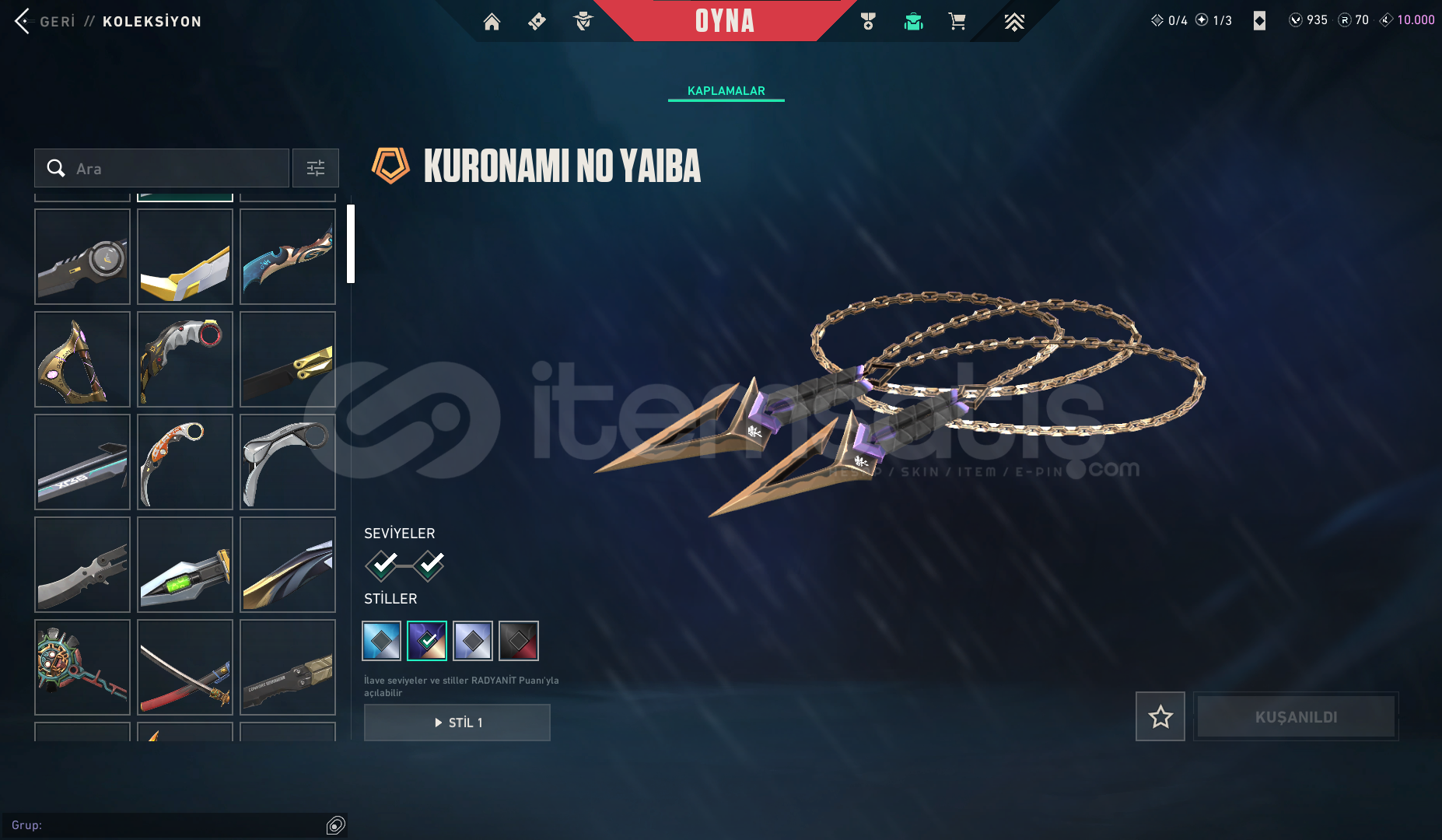 BIÇAK: ONİ KATANA, İYON KARAMBİT, AY YADİGARI, CHAMPİONS 2021 KARAMBİT, CHAMPİONS 2022 KELEBEK, RGX KATANA, RGX KELEBEK, ÖZEL HAREKAT KELEBEK, KARABORSA KELEBEK, UZAYLI AVCISI BIÇAĞI, VCT LOCK İN MERHAMET BIÇAĞI, YAĞMACI BIÇAK, YAĞMACI KARAMBİT, YİTİK RİTÜEL BIÇAĞI, KURONAMİ BIÇAĞI, ASİL2.0 KARAMBİT