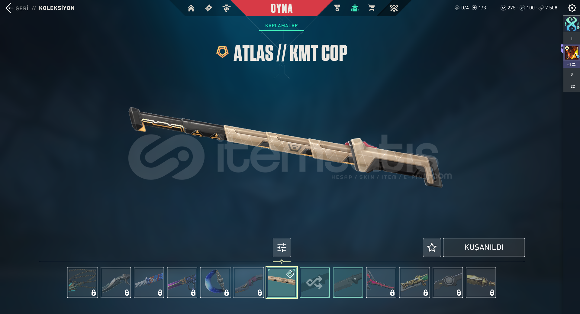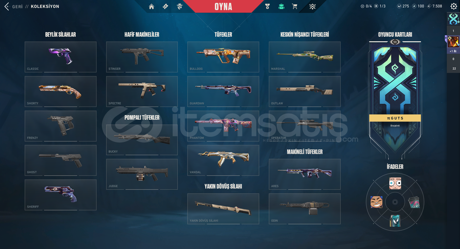 HESAP SEVİYESİ: 50RANK: GÜMÜŞ 1 (SİLVER)KİNGDOM KREDİSİ: 7508RADYANİT: 100VP: 275CLASSICLERGALAKSİ MUHAFIZI CLASSICATLAS // KMT CLASSICSHORTYLERSÜKUNET SHORTYSHERİFFLERUZAYDELEN SHERİFFSPACTRELARATLAS // KMT SPACTREBULLDOGLARSÜKUNET BULLDOGGURADIANLARUZAYDELEN GURADIANVANDALLARYİTİK VANDALATLAS // KMT VANDALPHANTOMLARSÜKUNET PHANTOMMARSHALLARSÜKÜNET MARSHALOUTLAWLARATLAS // KMT OUTLAWARESLERUZAYDE...