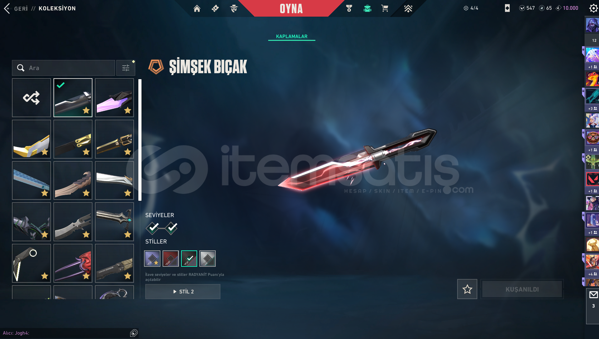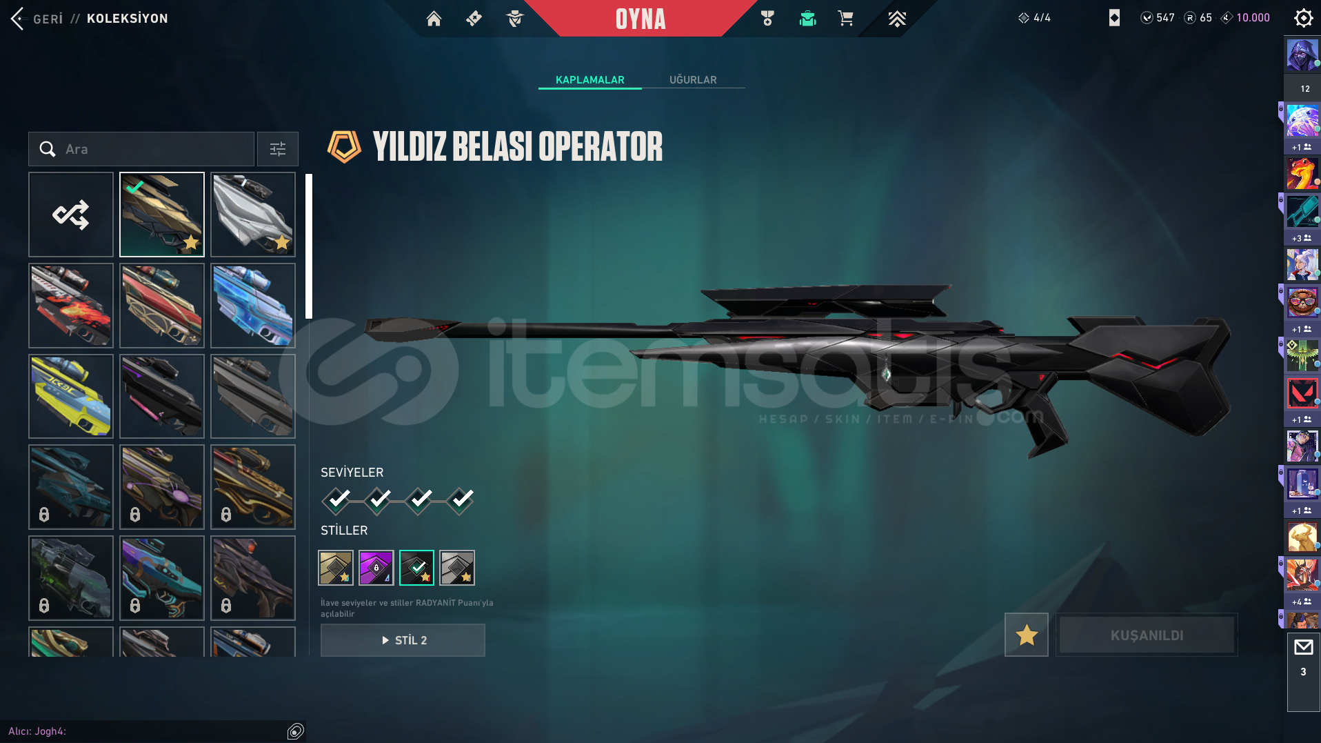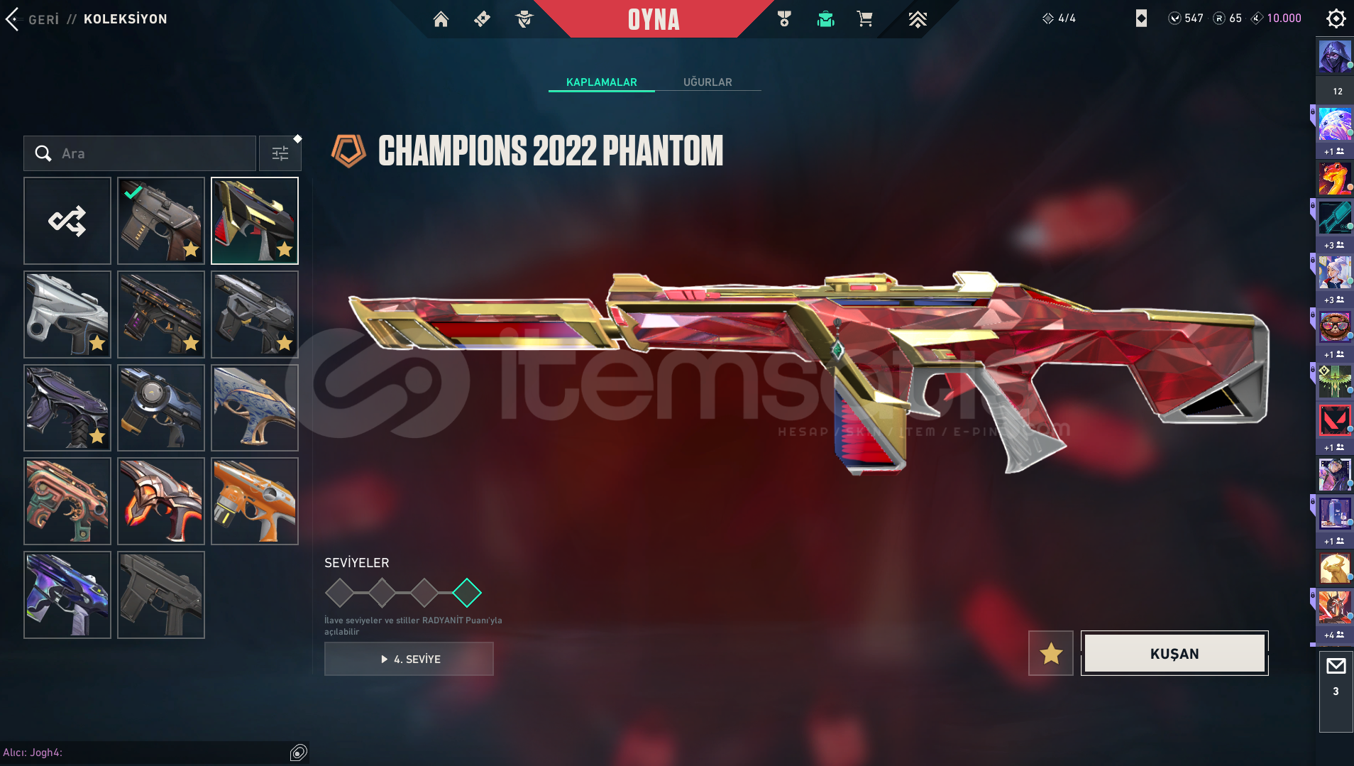 içindeki skinlerSherif:KaosZamanın ötesiAnomaliyağmacıbattlepasslarVandal:Asilaomendiryağmacızamanın ötesiulu pençeyıldız belasıchampions 2025ışık muhafızıfaz koruyucuyitikPhantom:seri tetikchampions 2022iyonkaosyağmacıprotokolspectre:kronomibalsticOperatöriyonyıldızbelasıbıçaklar:karaborsa kelebekchampion 2025 kelebekchampions 2022 kelebekrgx katanaasil karambi...