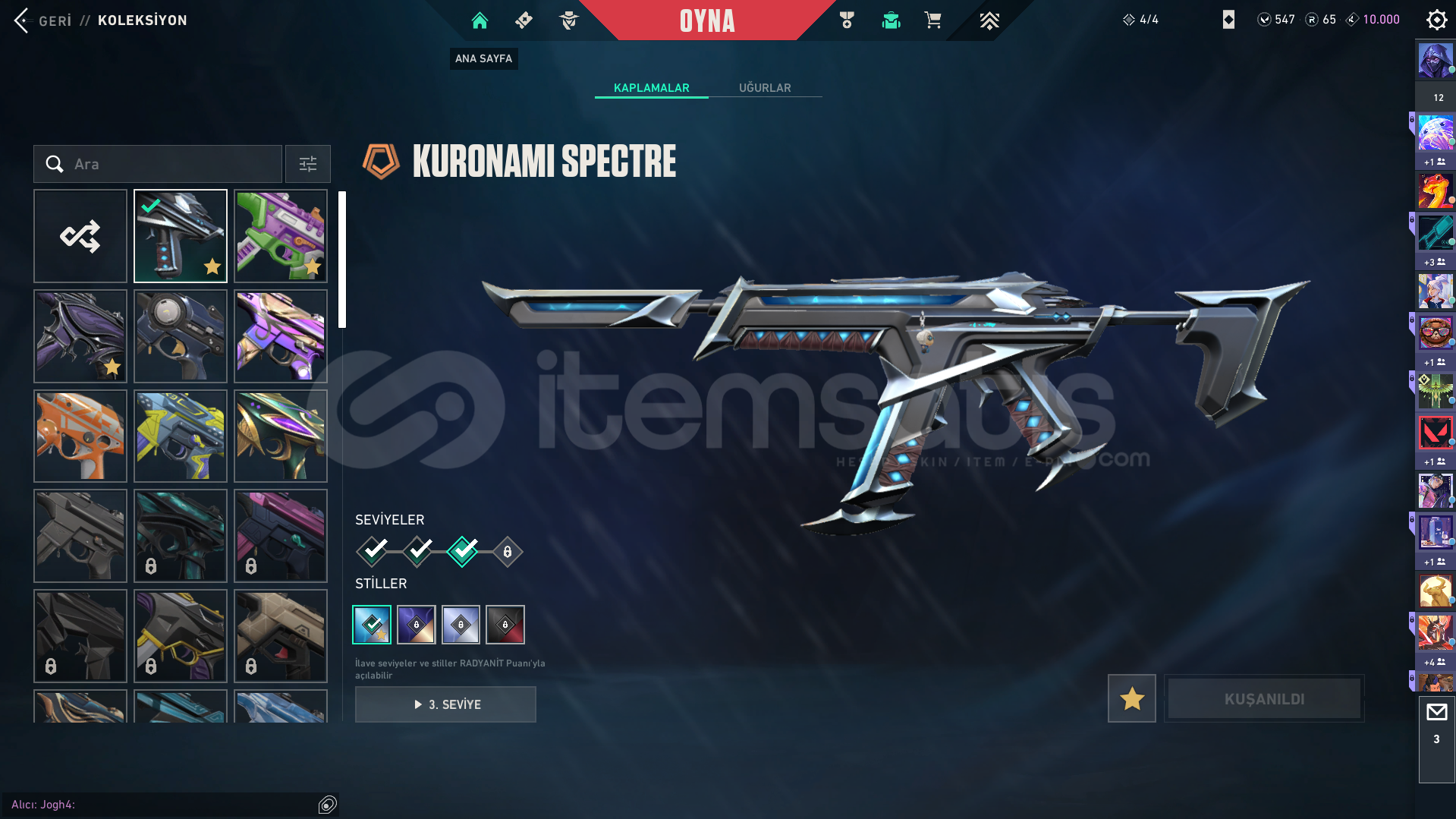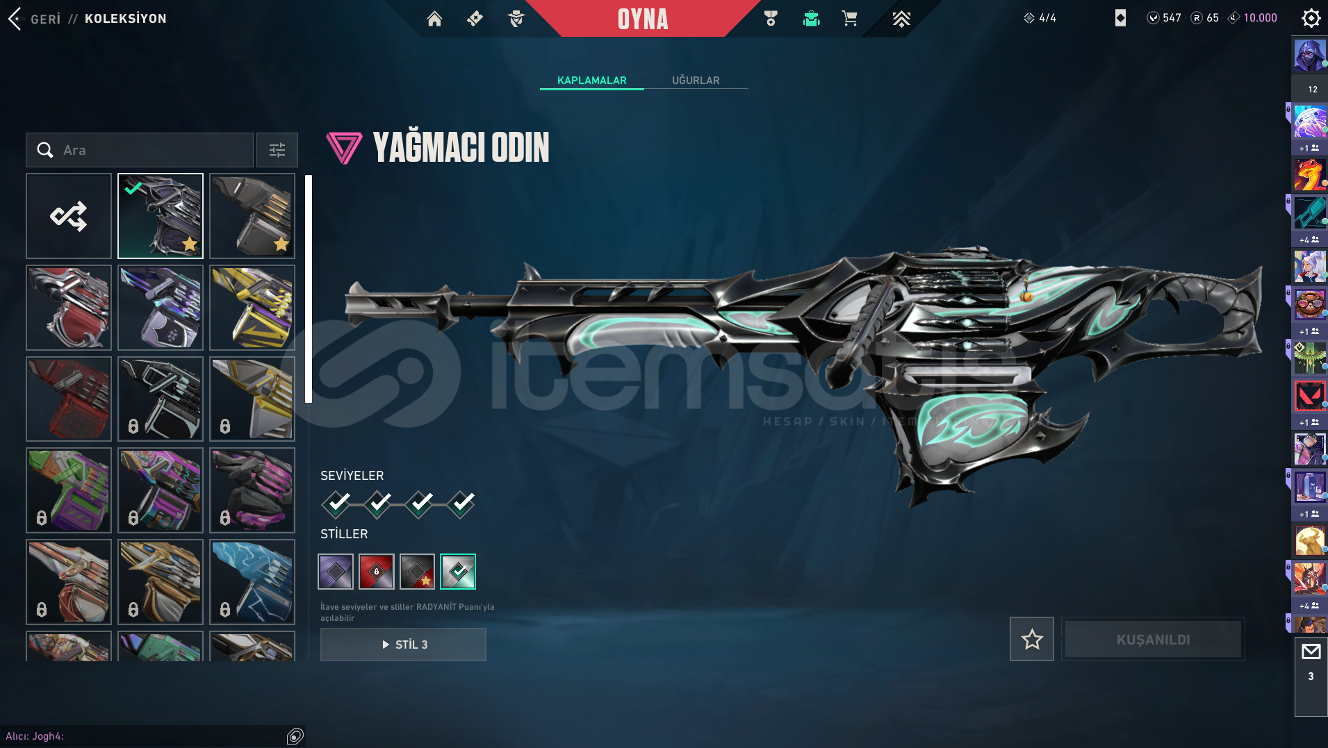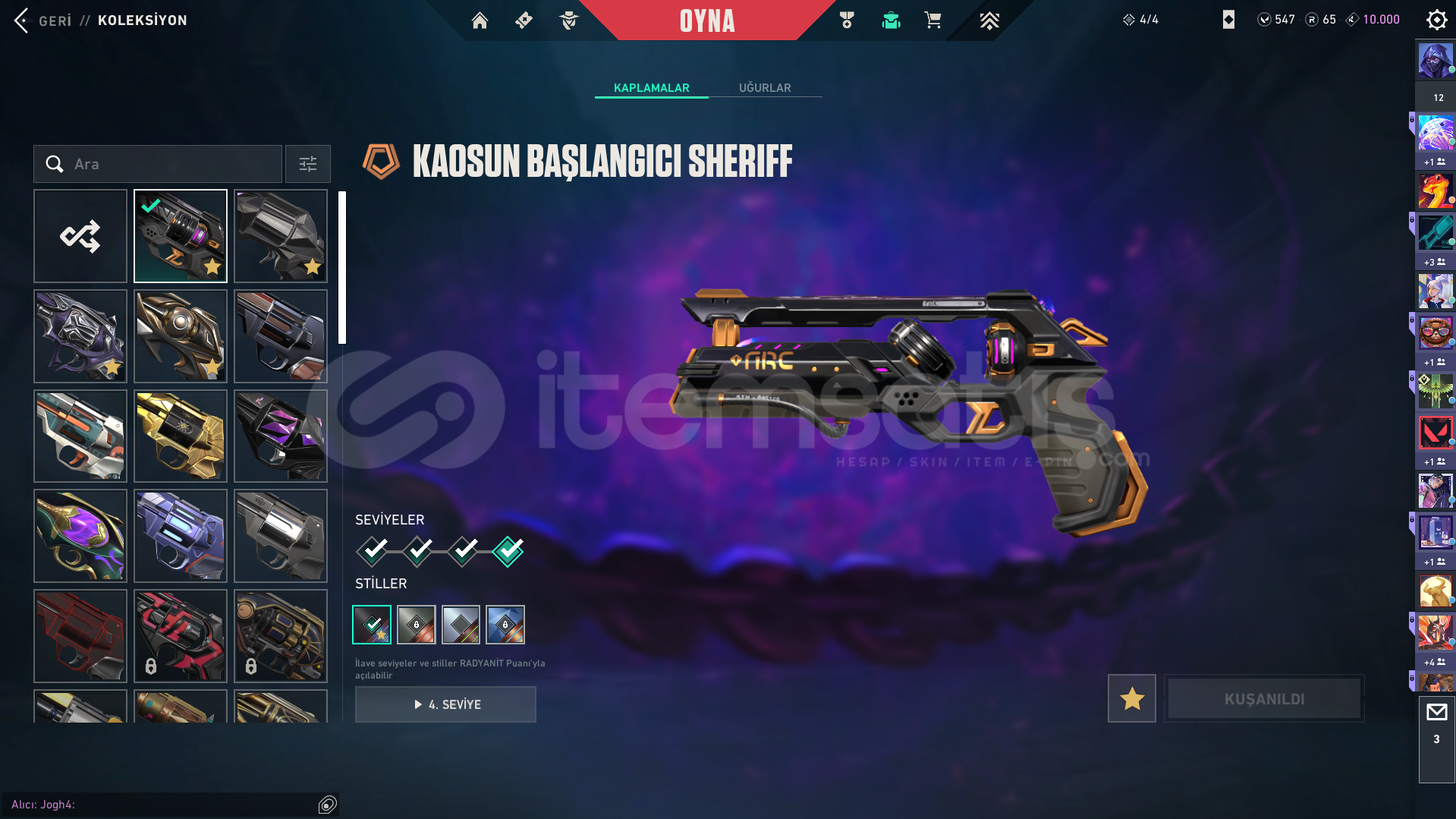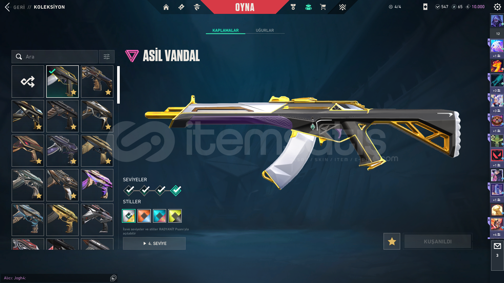 içindeki skinlerSherif:KaosZamanın ötesiAnomaliyağmacıbattlepasslarVandal:Asilaomendiryağmacızamanın ötesiulu pençeyıldız belasıchampions 2025ışık muhafızıfaz koruyucuyitikPhantom:seri tetikchampions 2022iyonkaosyağmacıprotokolspectre:kronomibalsticOperatöriyonyıldızbelasıbıçaklar:karaborsa kelebekchampion 2025 kelebekchampions 2022 kelebekrgx katanaasil karambi...
