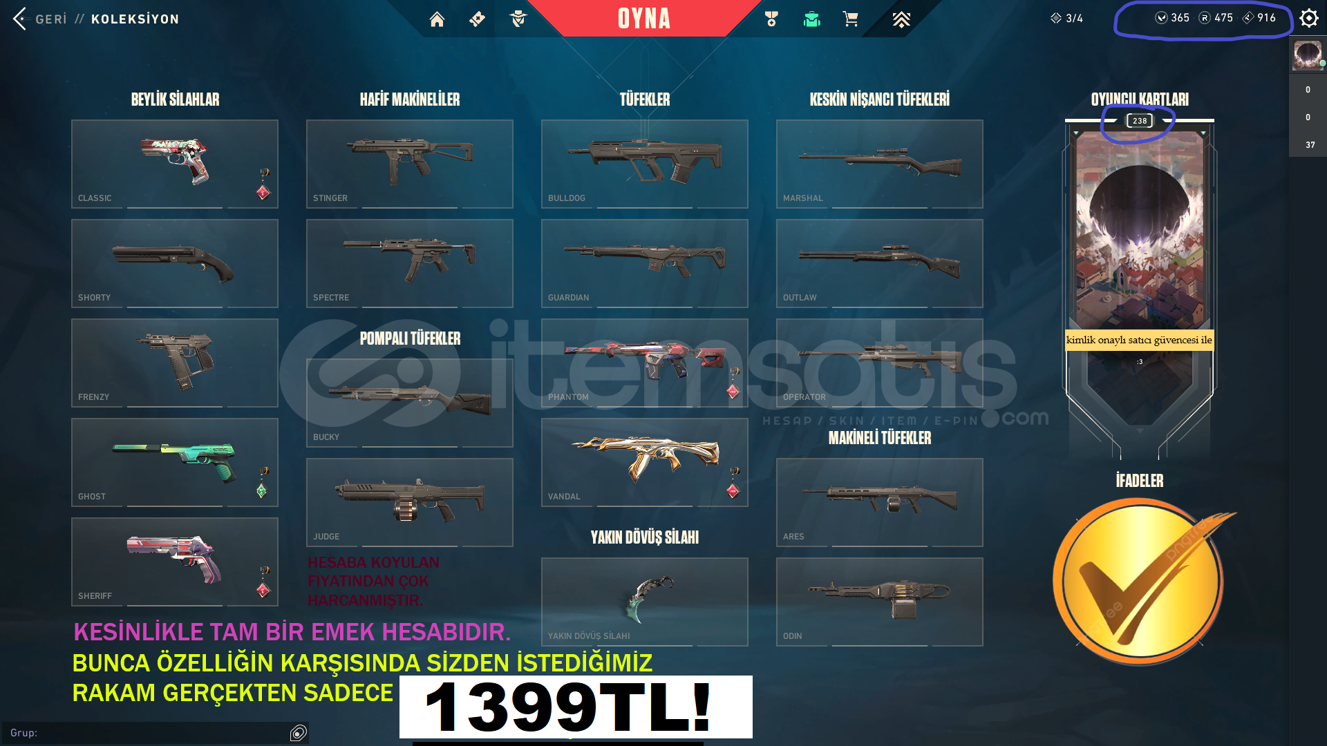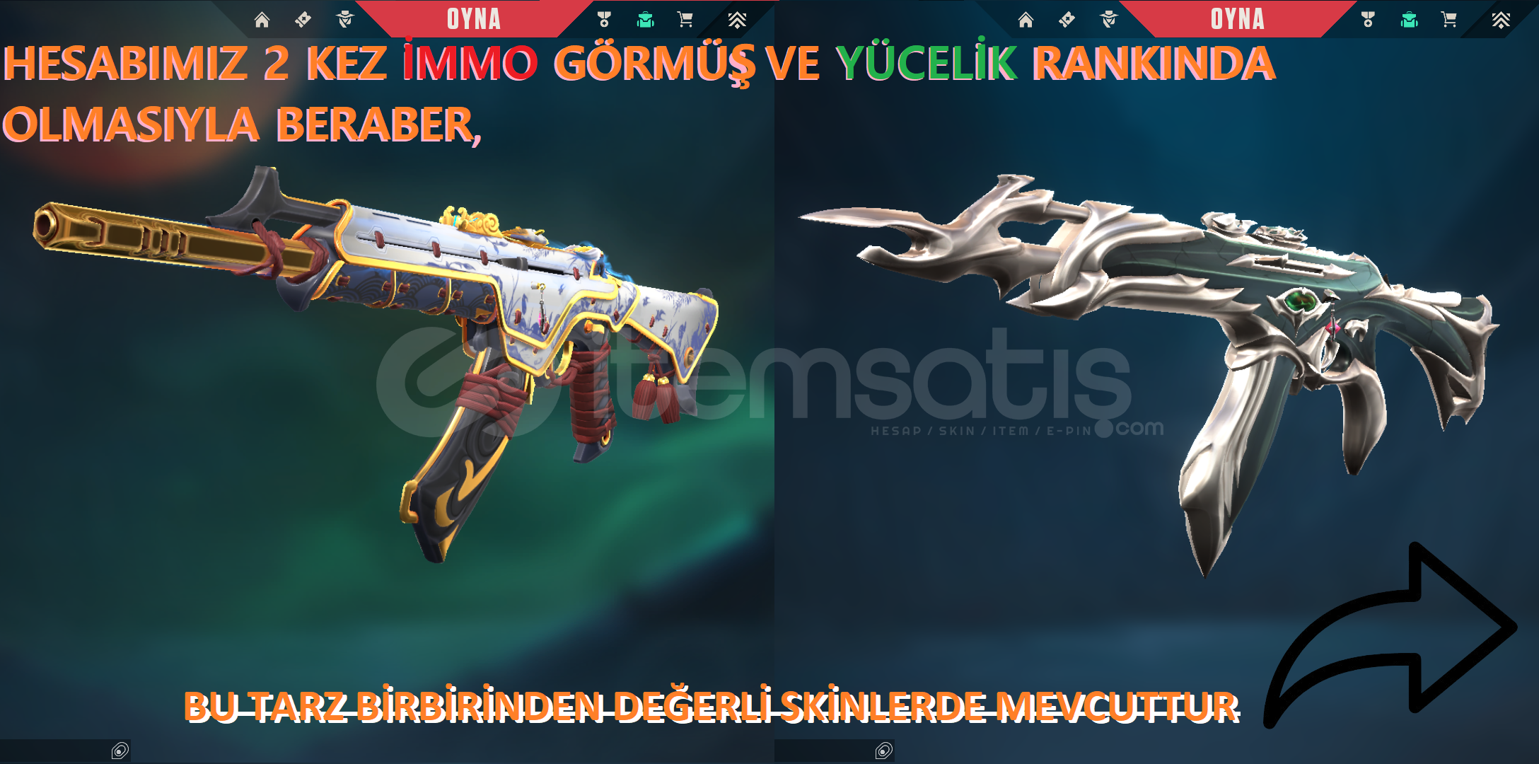 SORULARINIZ İÇİN DM GELEBİLİRSİNİZ :)HESABIMIZIN ÖNE ÇIKAN ÖZELLİKLERİ:=Hesabımızda yağmacı karambit , oni vandal gibi üst seviye skinler bulunmaktadır=Hesabın asıl önemli olan kısmı çoğu sezonu yücelik ile bitirmiş olup güncel rankı yücelik olması ve 2 Kez İmmortal olması.=Hesapda resimlerde g&oum...