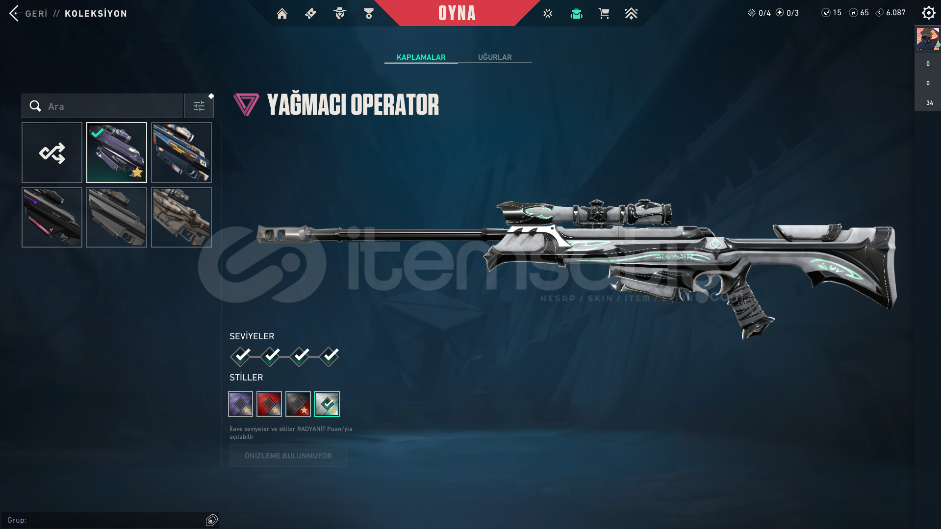 KAOS VANDALYAĞMACI VANDALRGX VANDALULUPENÇE VANDALEJDER VANDALONİ PHANTOMASİL PHANTOMOPERATÖR YAĞMACIRGX OUTLAWBLASTX SPECTREGAİA GHOSTYAĞMACI GHOSTİYON SHERİFFRGX SHERİFFİYON KARAMBİTRGX KARAMBİTYAĞMACI HANÇERHESABI BAYA BİR SÜREDİR KULLANMIYORUM. HESABIN TOPLAM MALİYETİ 9500TL DİR. ESKİ ELOSU PLAT OLUP OYNAMADIĞIMDAN DOLAYI GÜMÜŞ ELOYA DÜŞTÜ....