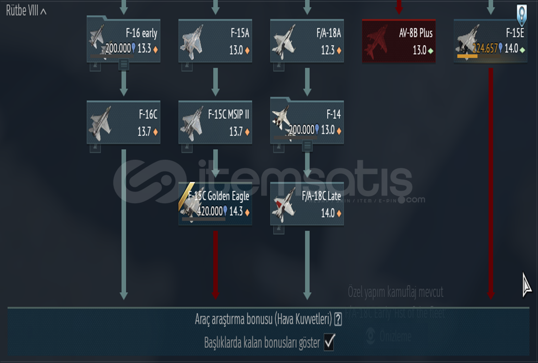 Her şey resimde gözüktüğü gibi. Sadece Japon ve Çin ağacı tier 3 ve 4e kadar araştırılı onları koyma gereği duymadım resim koyma sınırı var. Amerika full zaten. 1 tane de gaijin parasıyla alınan araç var.
