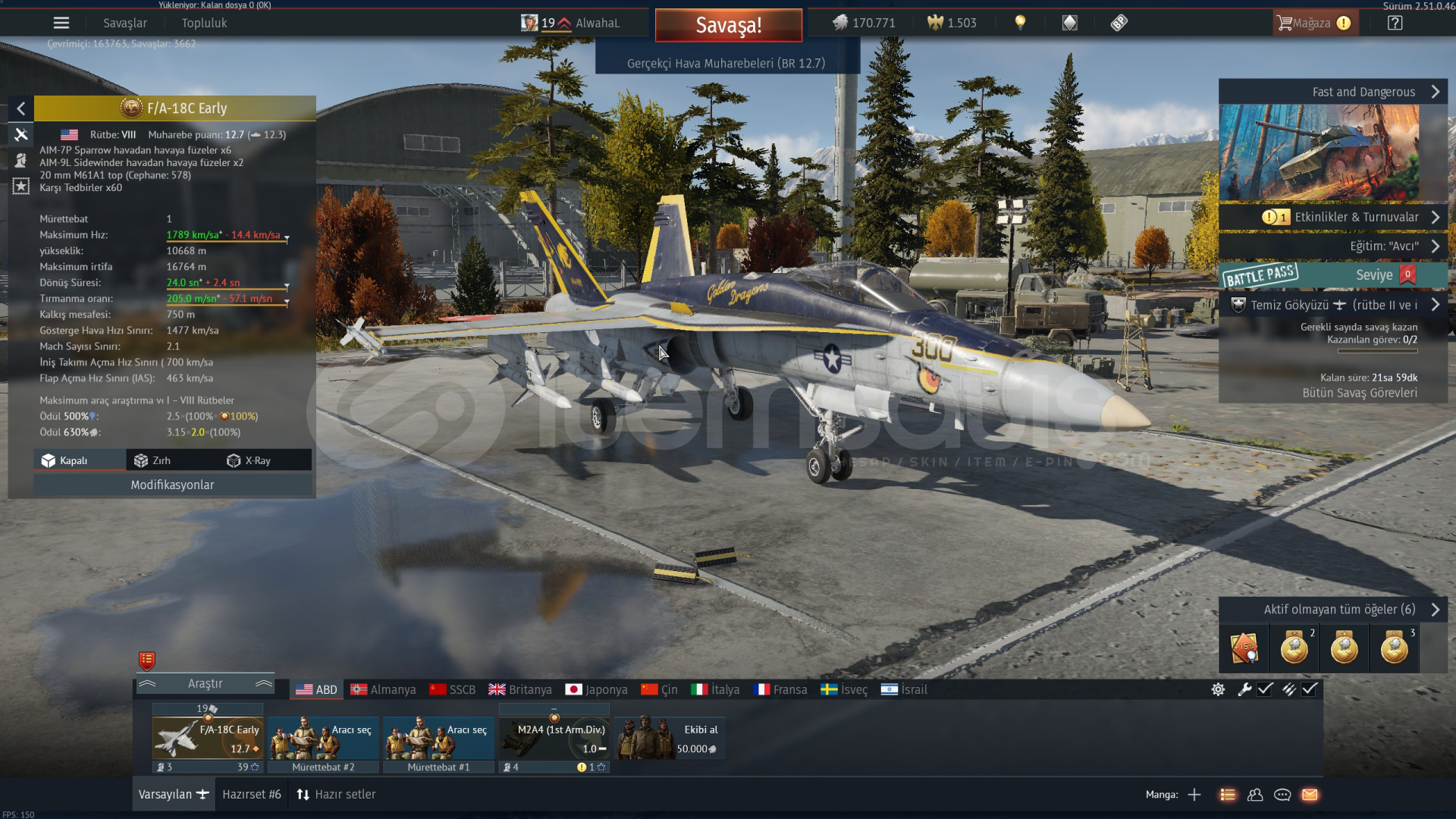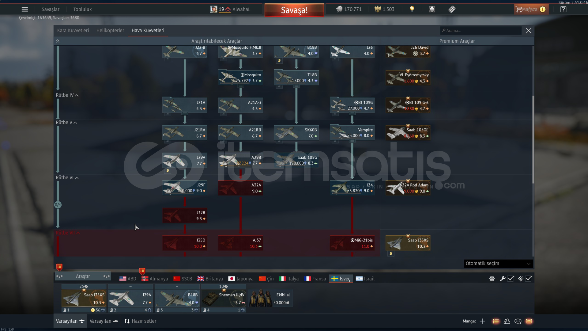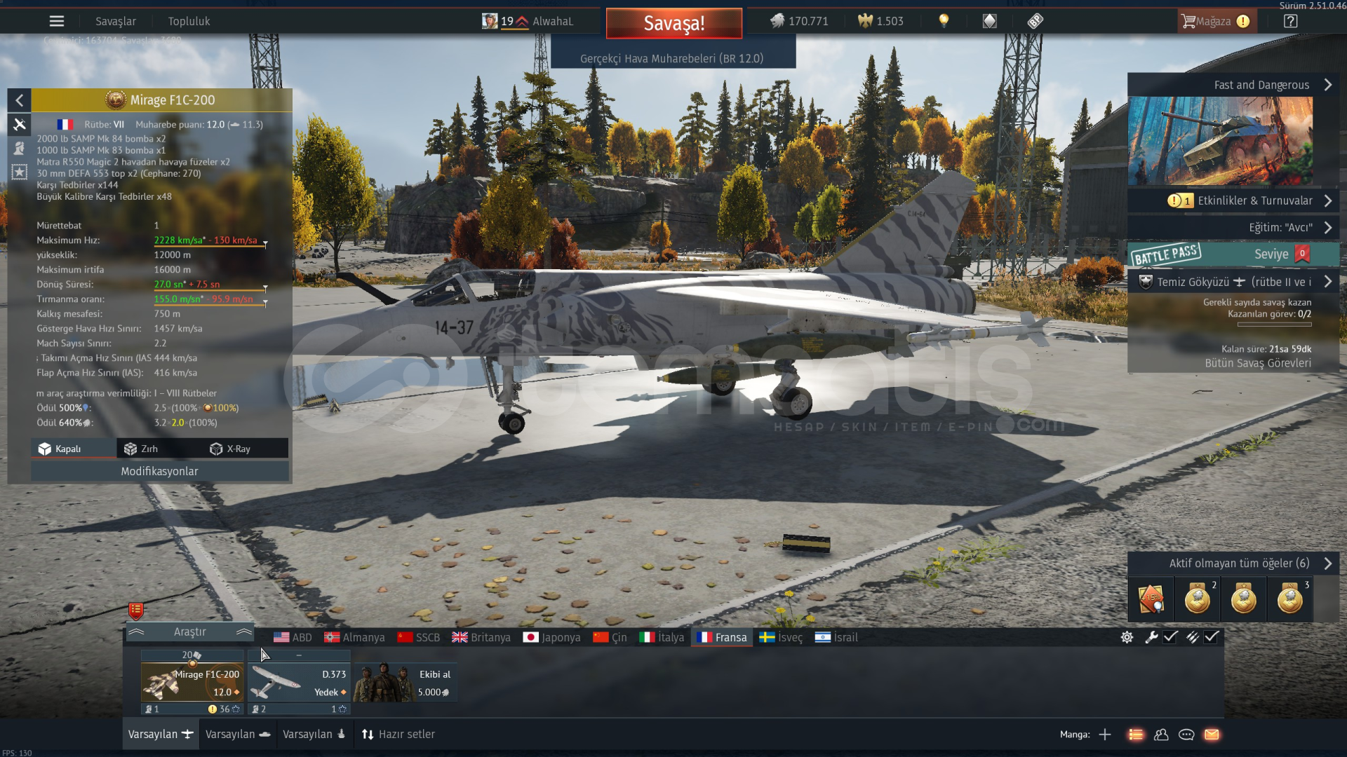 Mirage F1C-200Type 90B 'Fuji' Saab J35XSF/A-18С Early (US)Araçları mevcuttur. Mail adresi bendedirOyun sarmadığı için hesabımı satıyorum.