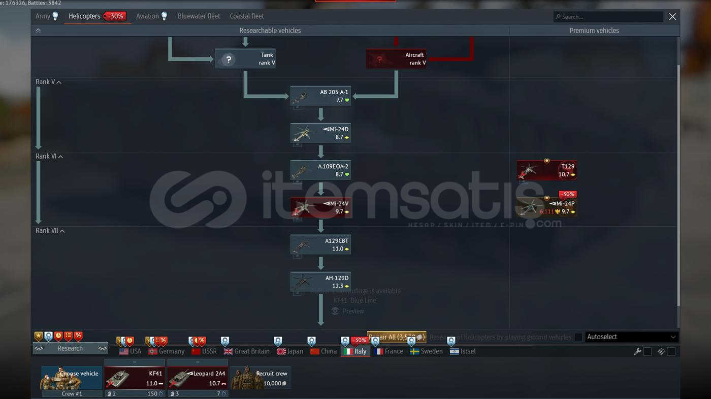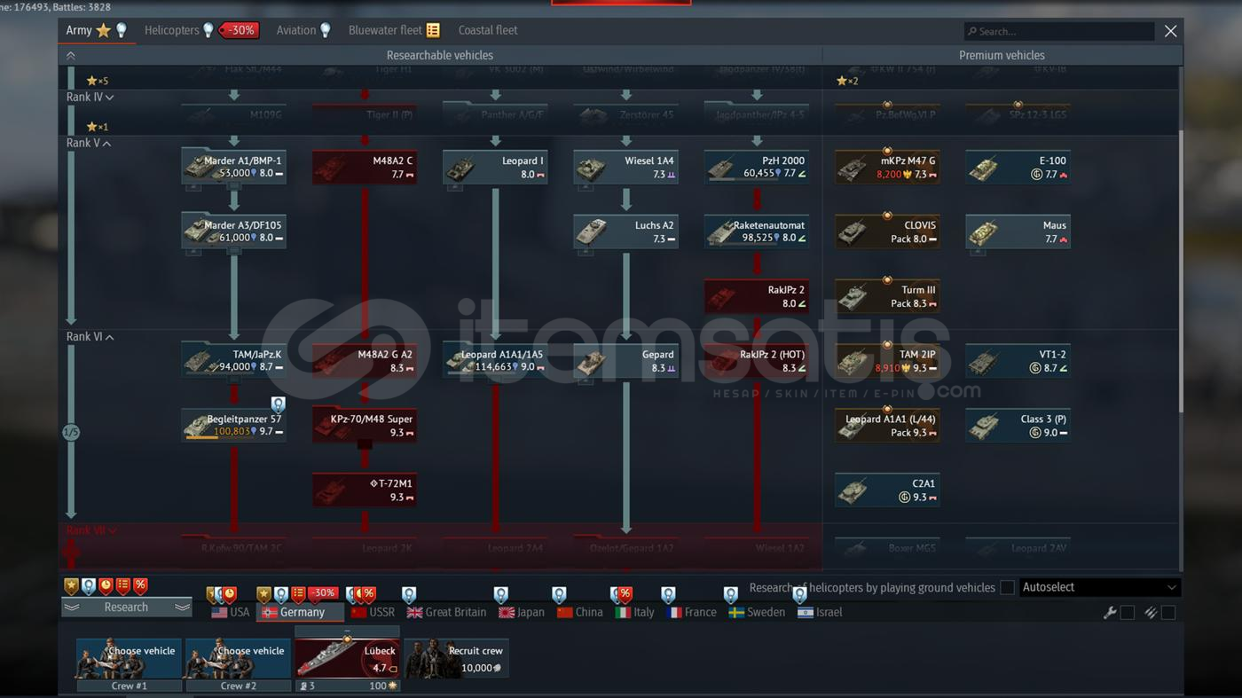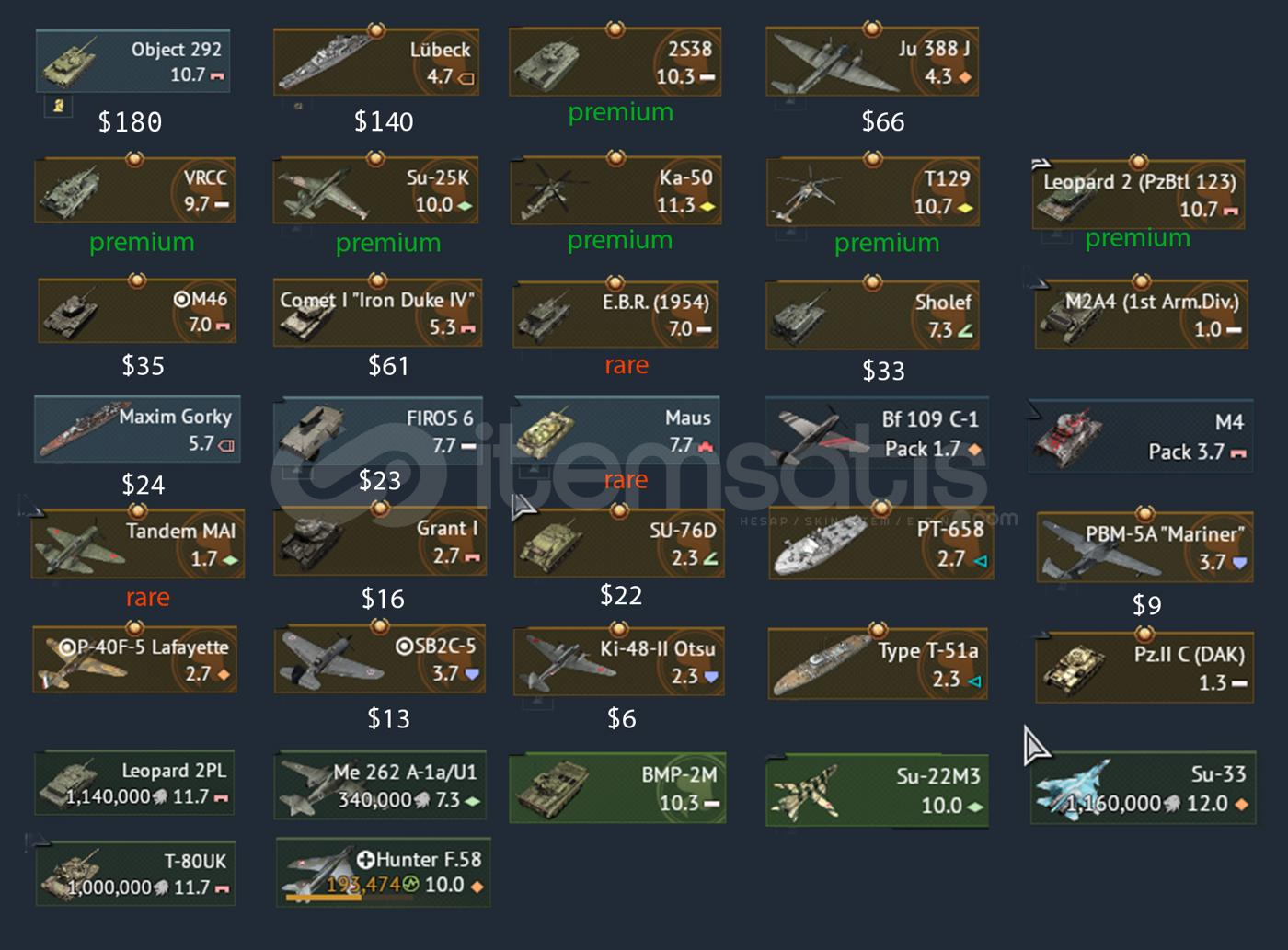 Bir çok ülkede, bir çok premium ve nadir araç mevcut. Canınızın sıkılması mümkün değil :)Kişisel hesabımdır, ekonomik durumlardan dolayı satıyorum.Hesap LVL: 100Gümüş Aslan: 5.8mPremium Gün: 27Pazarlık payı vardır