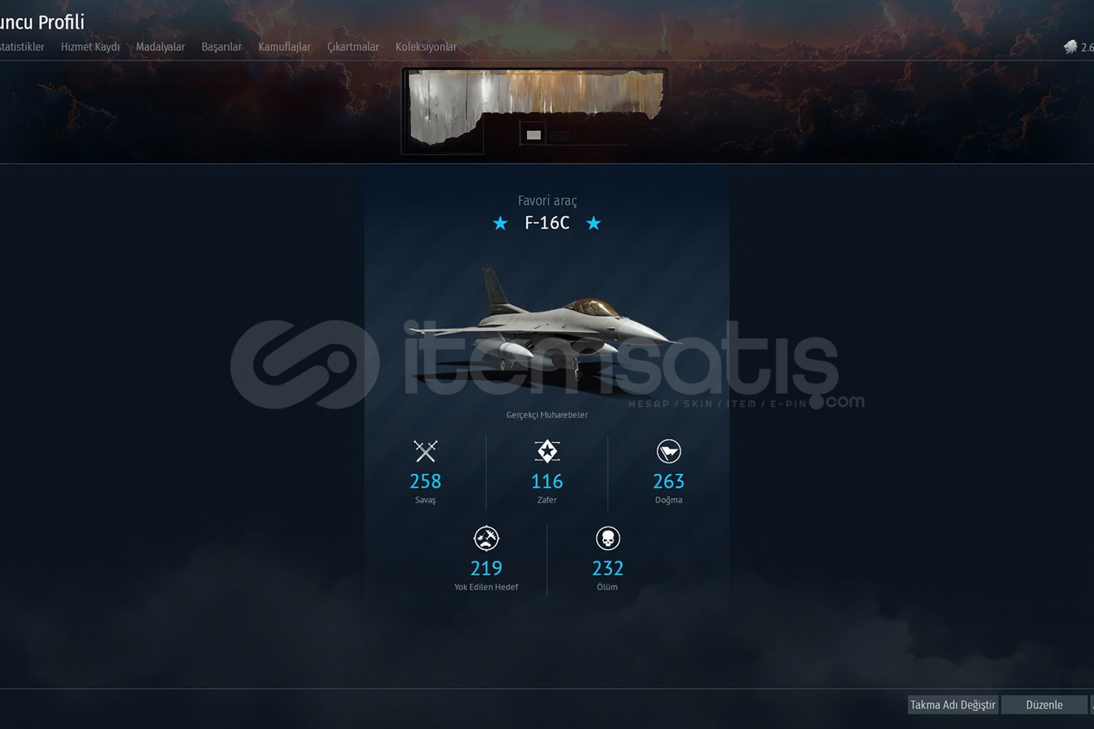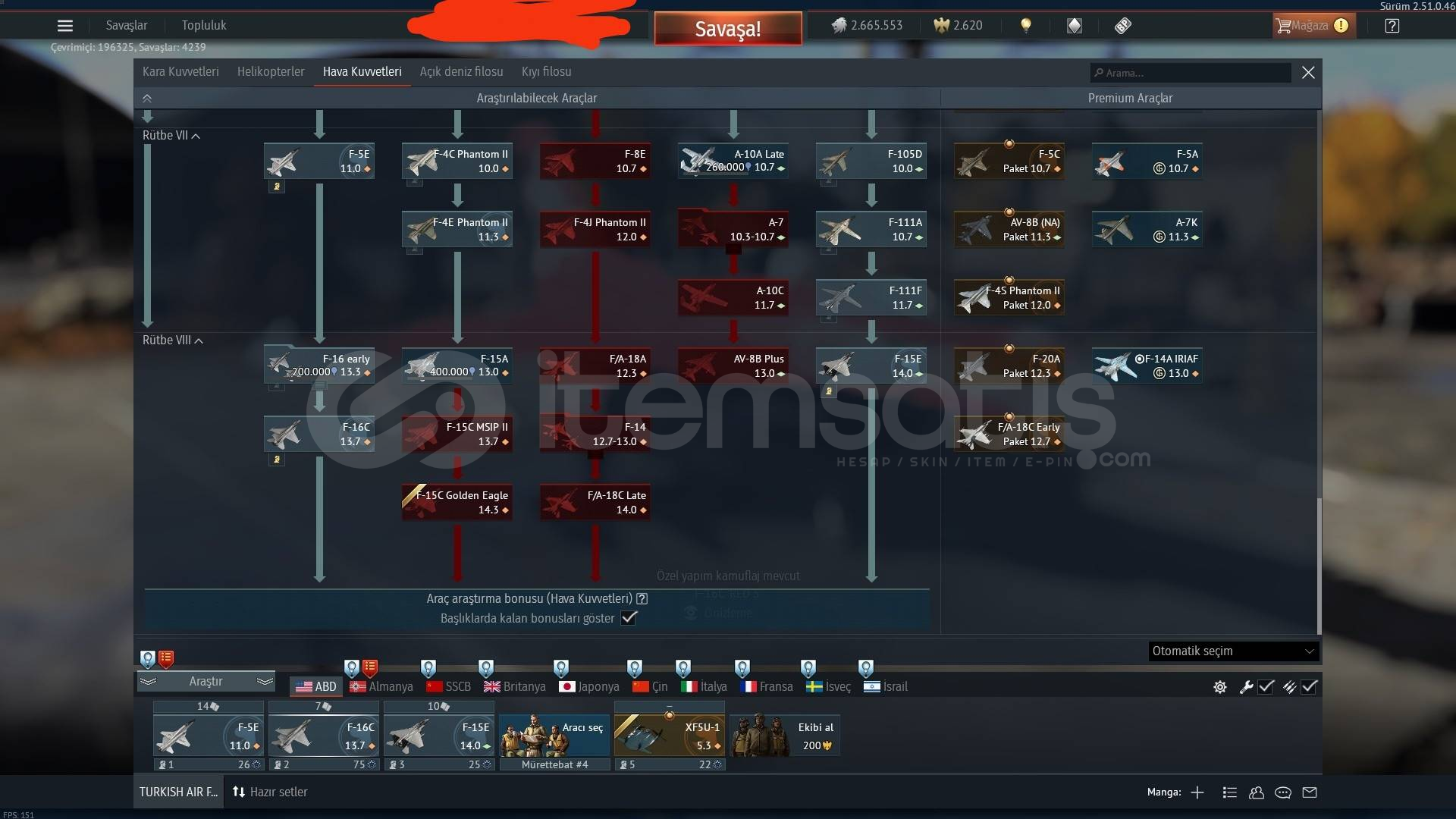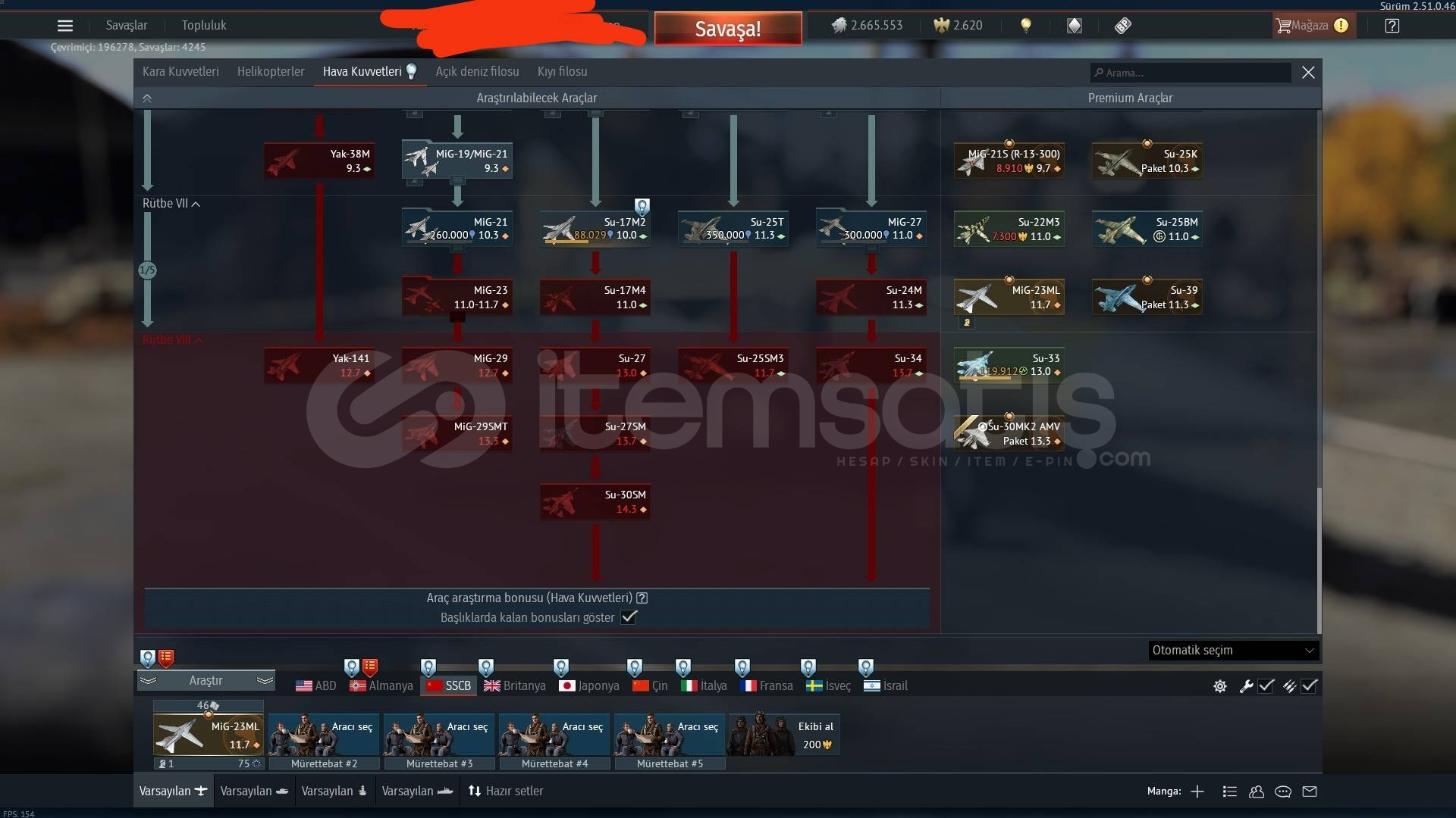 RUSYA VE ABD HAVA TOPTIER PREMIUM ARAÇLAR : MIG23ML P51 XF5U TOPTIER F16C F15E , F14 F18 SU34 SU30 S27SM MIG29 Kolayca kasılabilir 82 LV , 2.6M Gümüş Aslan , 2620 Altın Kartal Hesap tamamen bana aittir Hesapta altın kartal mevcut olduğu için premium gün alıp rusya ağacını kolay bir şekilde bitirebilirsiniz amerika ağacınıda F-16C ye indirimlerde tılsım çekerek tamamlayabilirsiniz