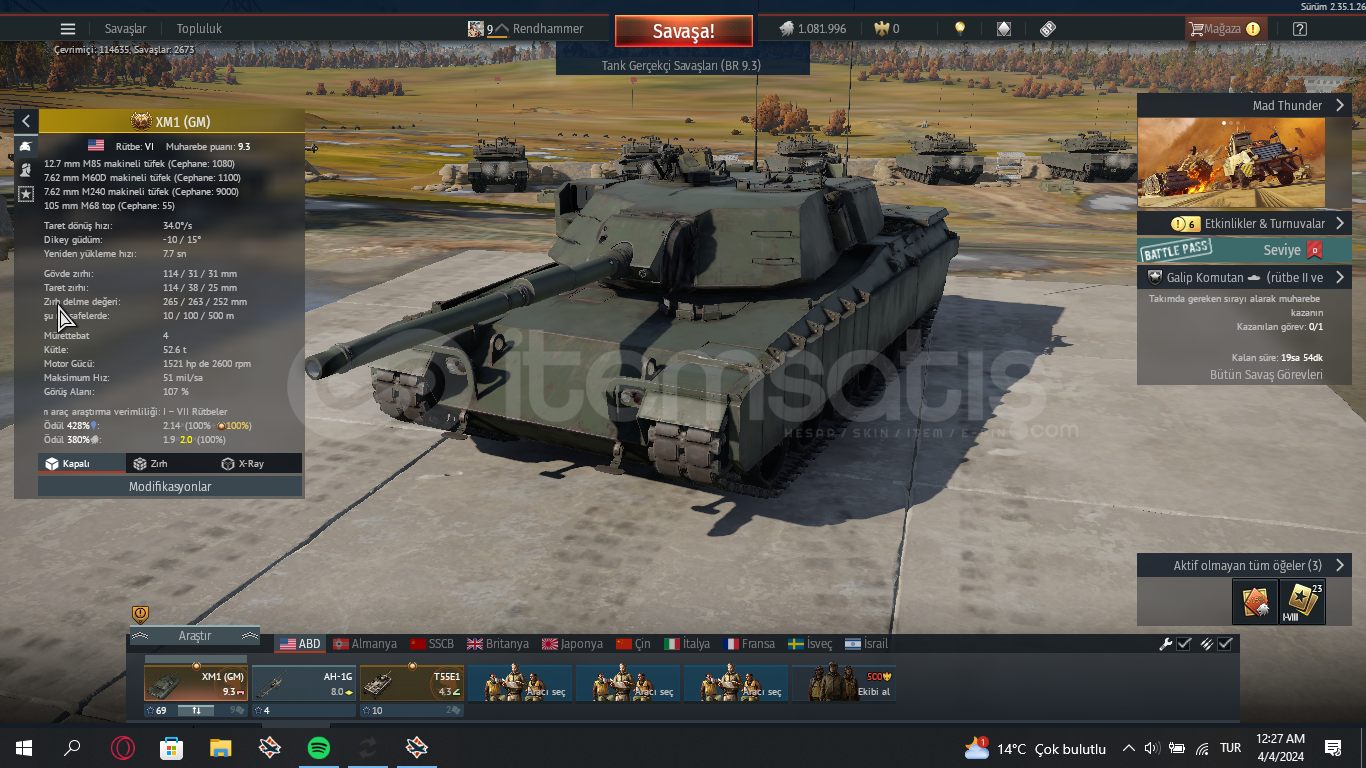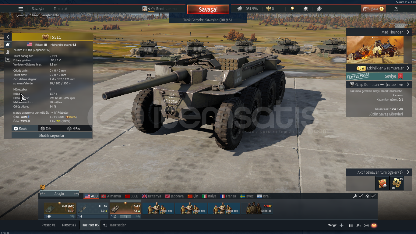 hesabımızda xm1 gmve t55E1 adlı en nadirpremium tanklardan varırbr9.3çevrimiçi olmasam dahi alabilirsiniz oto teslşmattırgaranti yoktur şifre değişirse değişim olur