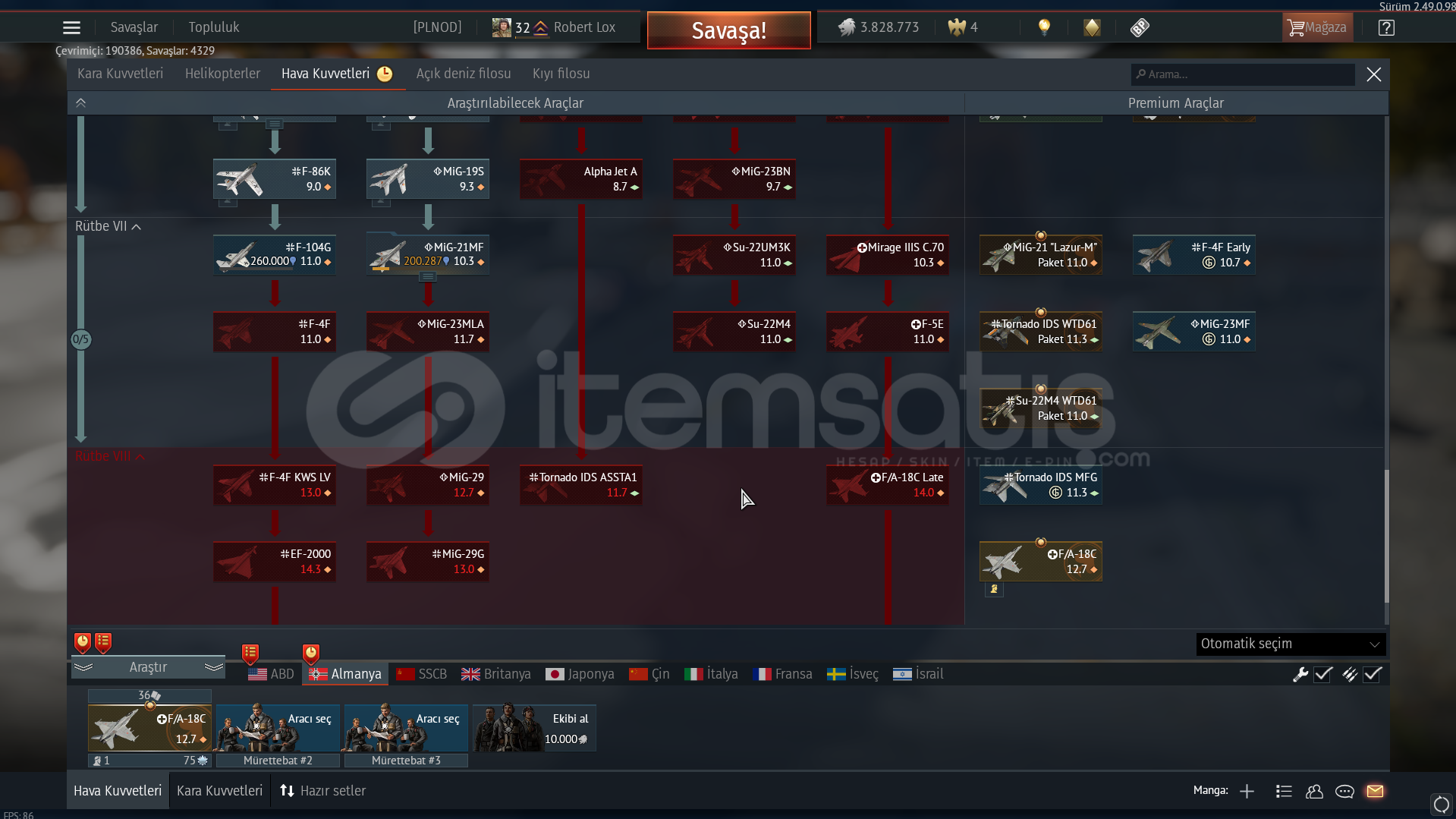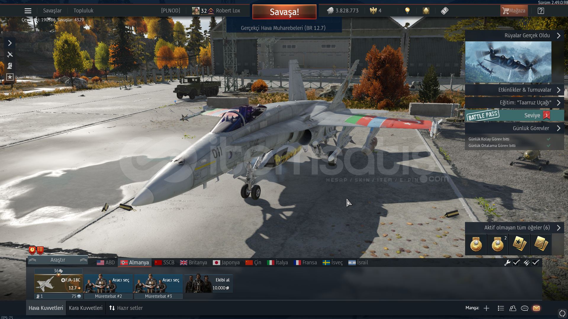 almanya toptier premium f/a-18c varalmanya hava rütbe 7 açıkMAİL DEĞİŞTİREBİLİRSİNİZ (MAİL DEVREDİLMEZ HESABI ALDIKTAN 30 GÜN SONRA KENDİ MAİLİNİZE AKTARABİLİRSİNİZ)KENDİ ŞAHSİ HESABIMDIR ZAMANIM OLMADIĞI İÇİN OYNAYAMIYORUM