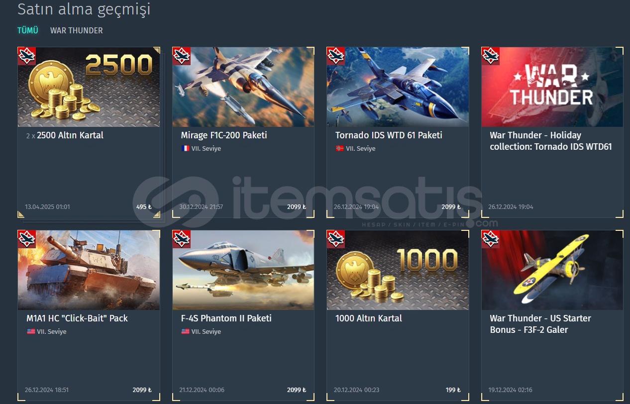 4 ADET PREMİUM ARAÇ VARDIRMİRAGE F1C-200TORNADO IDS WTD 61M1A1 CLİCK BAİTF4S PHANTOM IIAMERİKA HAVA AĞACI %90 KASILIDIR DİREK TOP TİER ARAÇLARLA OYNMA İMKANI VARDIRGÜVENLE TERCİH EDEBİLİRSİNİZ !!!