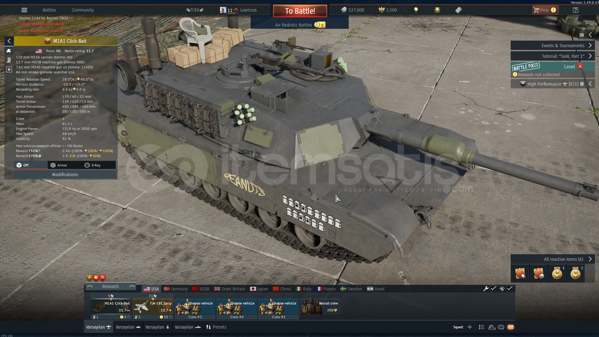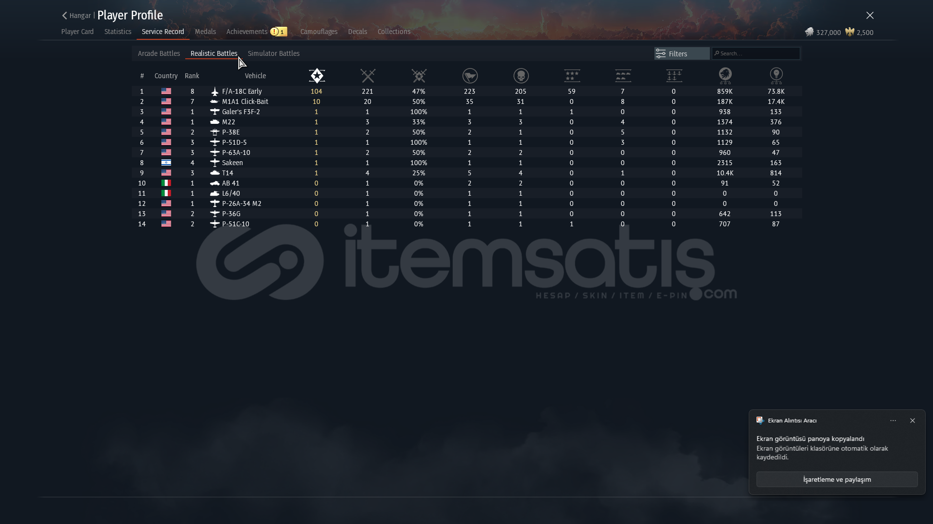 Kişisel hesabımdır, oynamadığımdan dolayı satıyorum ve sürekli satış yapan birisi değilim.Hesap 12 Level olup, içerisinde Premium araç olarak;M1A1 Click-Bait Medium Tank (USA BR 11.7)F/A-18C (Early) Hornet Jet (USA BR 12.7)Bulunmaktadır.Fiyat son fiyattır lütfen aşağısına inmemi rica etmeyiniz zaten iki araca da verdiğim paradan daha az bir fiyata veriyorum.HESABIN BÜTÜN B&...