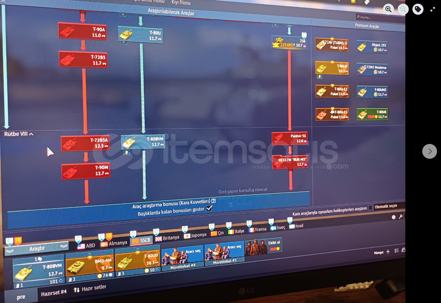 (ACİL) Hesabımı aciliyetten dolayı satıyorum rus karada resimde gördügünüz üzere top tier kısmındayım rus da 2 adet pre tankım var t80ud ve bmd4 m alman kısmında hava(1)kara(1) 2 pre var leaopard 2a4m ve f18 bulunmakdadır hava kısmında rütbe v kara kısmında ıv kısmındadır israilde pre f16 var ve f16d barak açık top tier kısmında. amerikda etkinlik araçı son gelen tank ve uçak bulunmakdadır hesapda 20milyon gümüs aslan ve 67günlük premium var aynı zamanda ilk gmail ile devredilcektir isteyene detaylı foto atabılırım