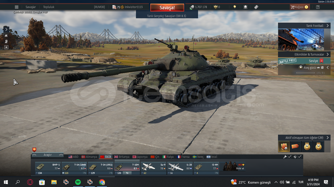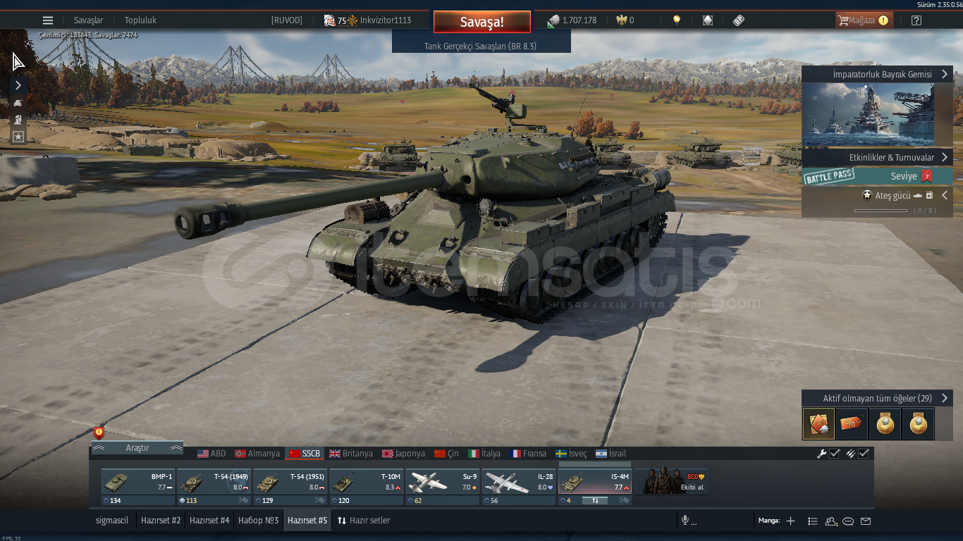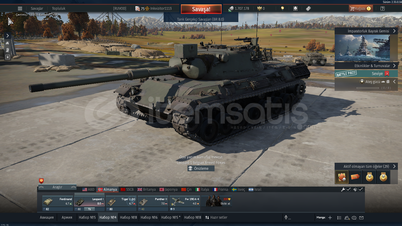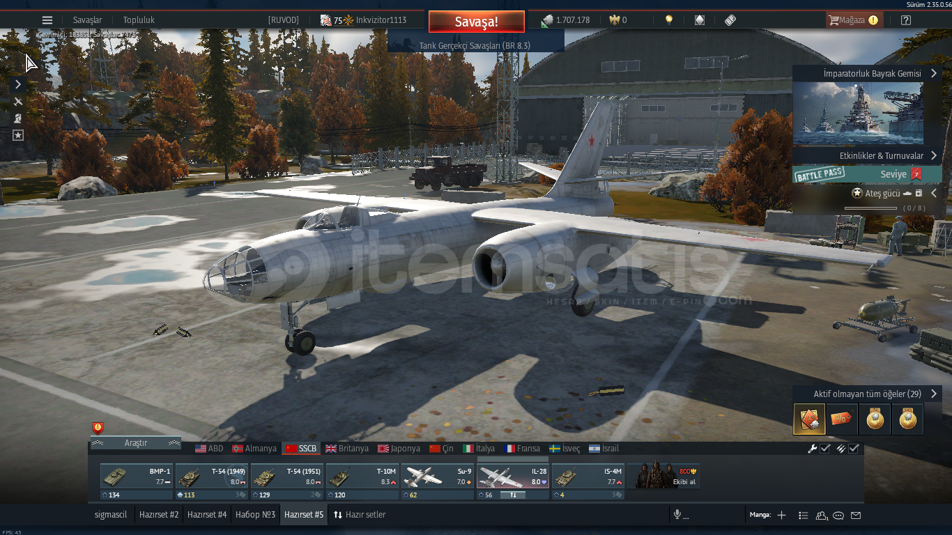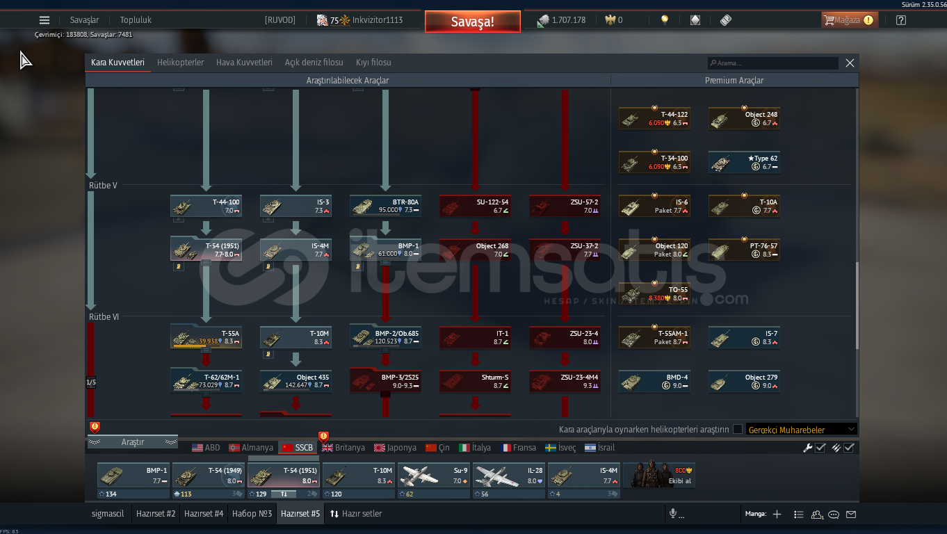 75 lvlrus uçak t5su9 ,ıl28rus tank t6t10m ,t54 ,ıs3 ,ıs4 ,bmpalman uçak t3alman tank t5leopard panther 2 nadir bir araçtır premium sayılırdolu dolu hesap 1.7 milyon gümüş aslanhesabın garantisi vardır şifre değişimi vs olursa yeni hesap verilir