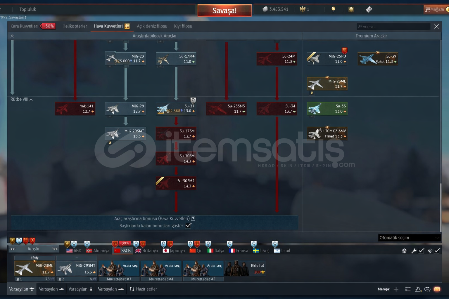 SIFIRDAN EMEKLE KASILMIŞ HESAPTIR RANDOM HESAPLARLA KARIŞTIRMAYINIZ!MAIL UZERINIZE GECIRILECEKTIRRusya ve Amerika ToptierAmerika : F18 F16 F15 F14Rusya : Su34 Su33 Su30 Su27 Mig29 Mig23 Mig253 Milyon gümüş aslan + Mig25 kuponu kasılı + dönüştürülebilir araştırma puanları : 13.331.409Premium araçlar : Mig23ML F5E(TILSIMLI)