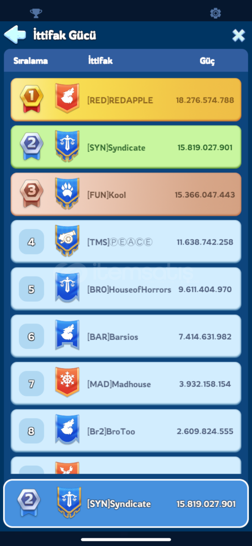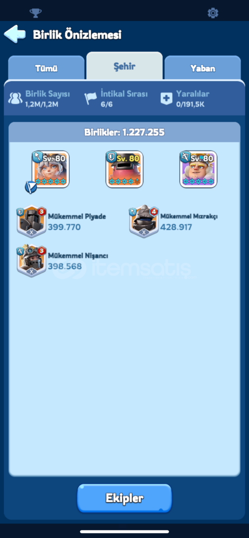 2294 Eyaleti 2. Sırada ki ittifakı SYN de bulunan. 170 milyon gücünde, birikimleri duran hesabım satılıktır. Birikimler kullanıldığında 180-185 m arası bir güce geliyor. Fırın(FC4), piyade, nişancı kampı(FC3) mızrakcı(FC4) aktif eyalet ama ben oyunu bırakıyorum. İstenen tüm bilgiler verilir. Mesaj atmanız yeterlidir, detaylı bilgi için mesaj atın. 05305690074