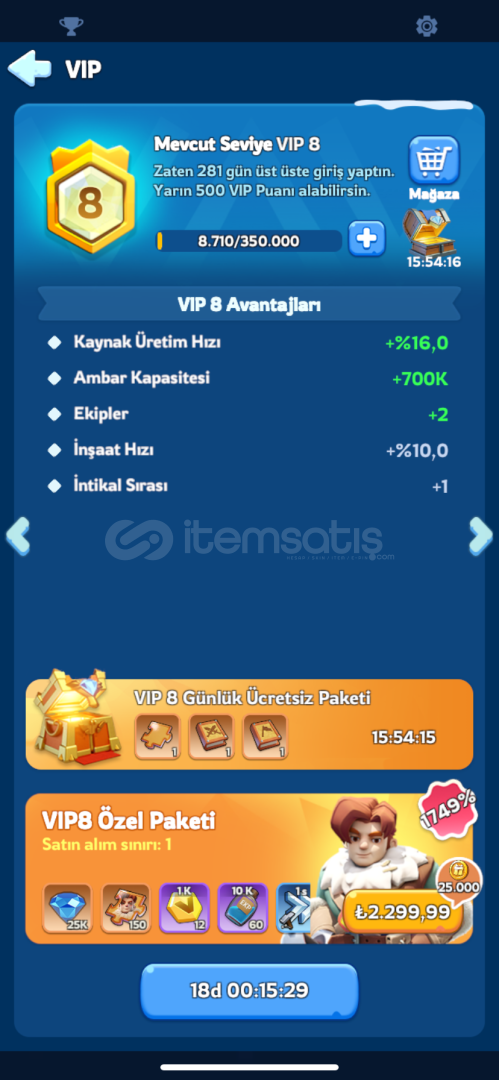 2294 Eyaleti 2. Sırada ki ittifakı SYN de bulunan. 170 milyon gücünde, birikimleri duran hesabım satılıktır. Birikimler kullanıldığında 180-185 m arası bir güce geliyor. Fırın(FC4), piyade, nişancı kampı(FC3) mızrakcı(FC4) aktif eyalet ama ben oyunu bırakıyorum. İstenen tüm bilgiler verilir. Mesaj atmanız yeterlidir, detaylı bilgi için mesaj atın. 053...