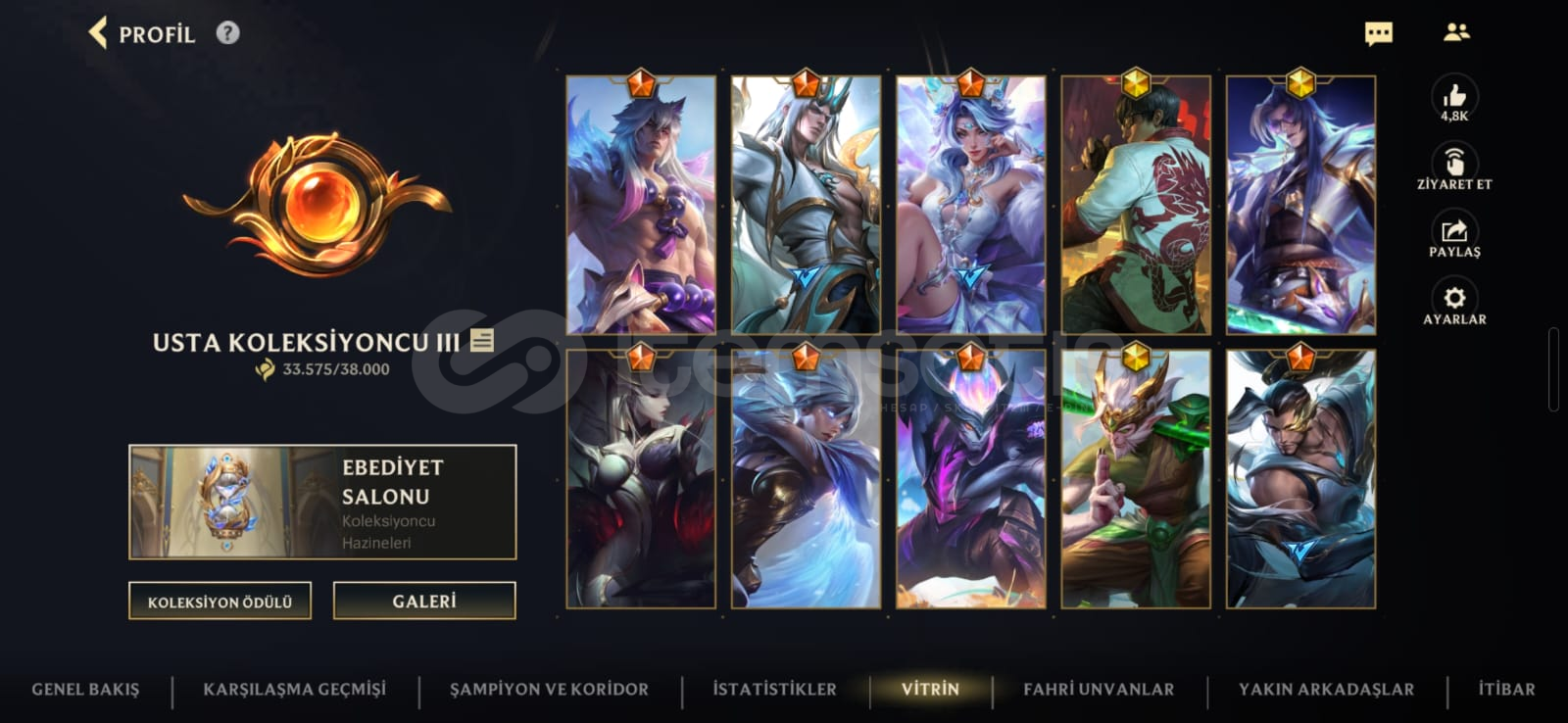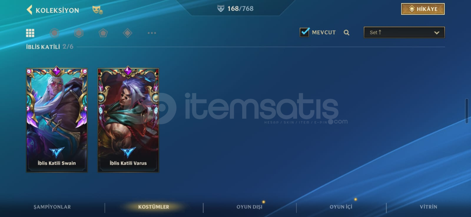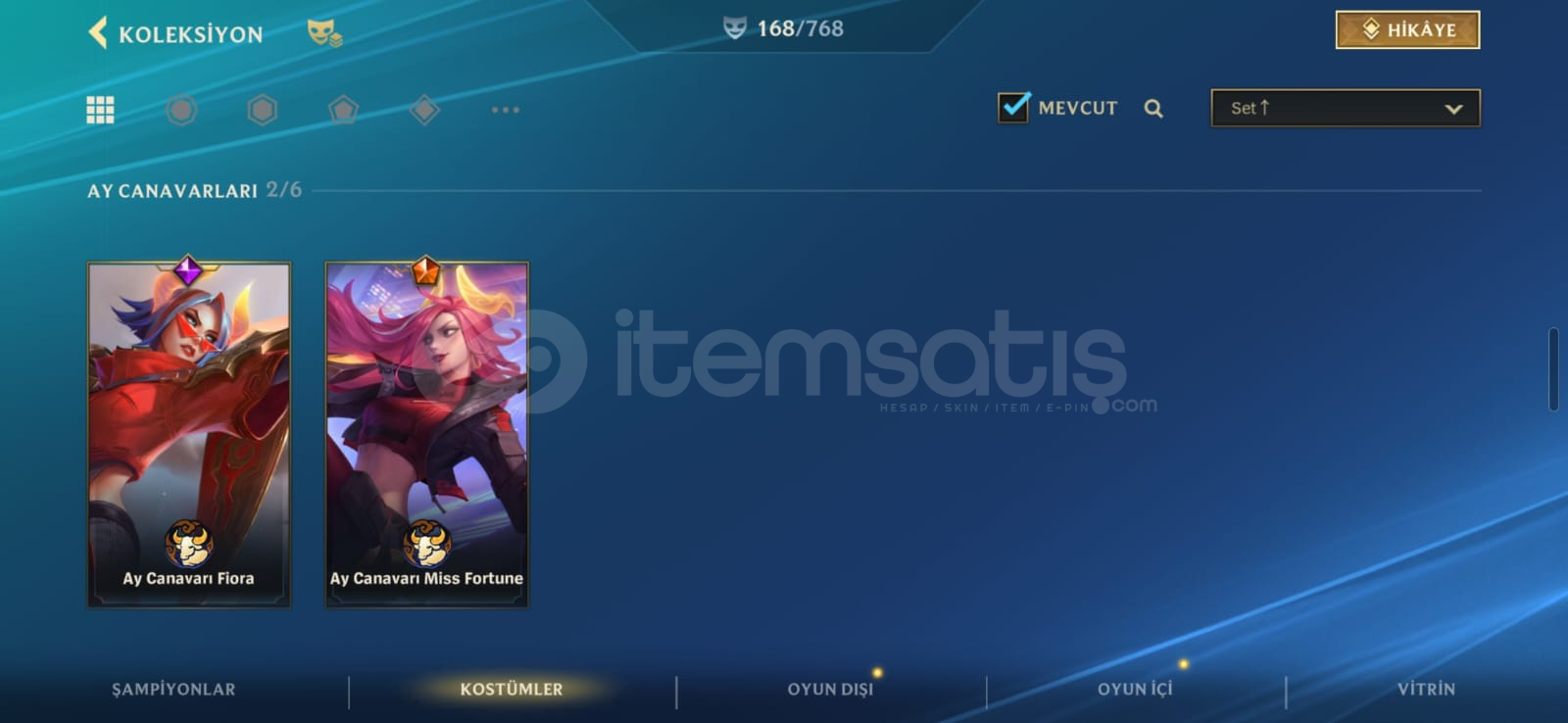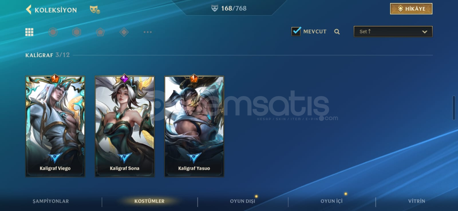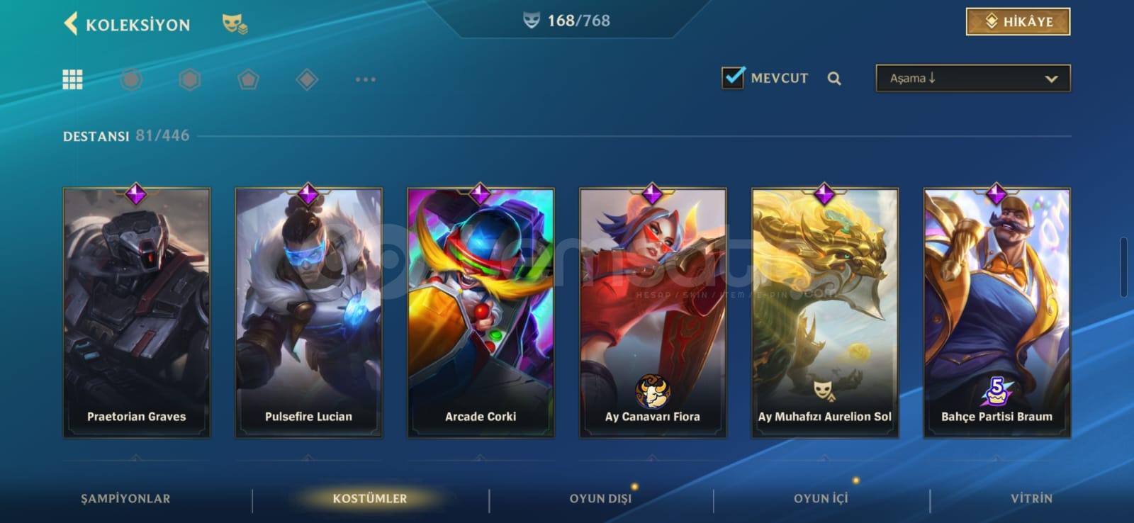 hesapta özel olarak nadir kostümler var(ay canavarı miss fortune/fiora, kaligraf viego/yasuo/sona, kristal gül ahri/ezreal/lux/viego/yone/sett/xayah/rakan/vlademir,havai fişek tristana/xin zhao,iblis katili varus/swain,semavi nakış irelia/rakan)