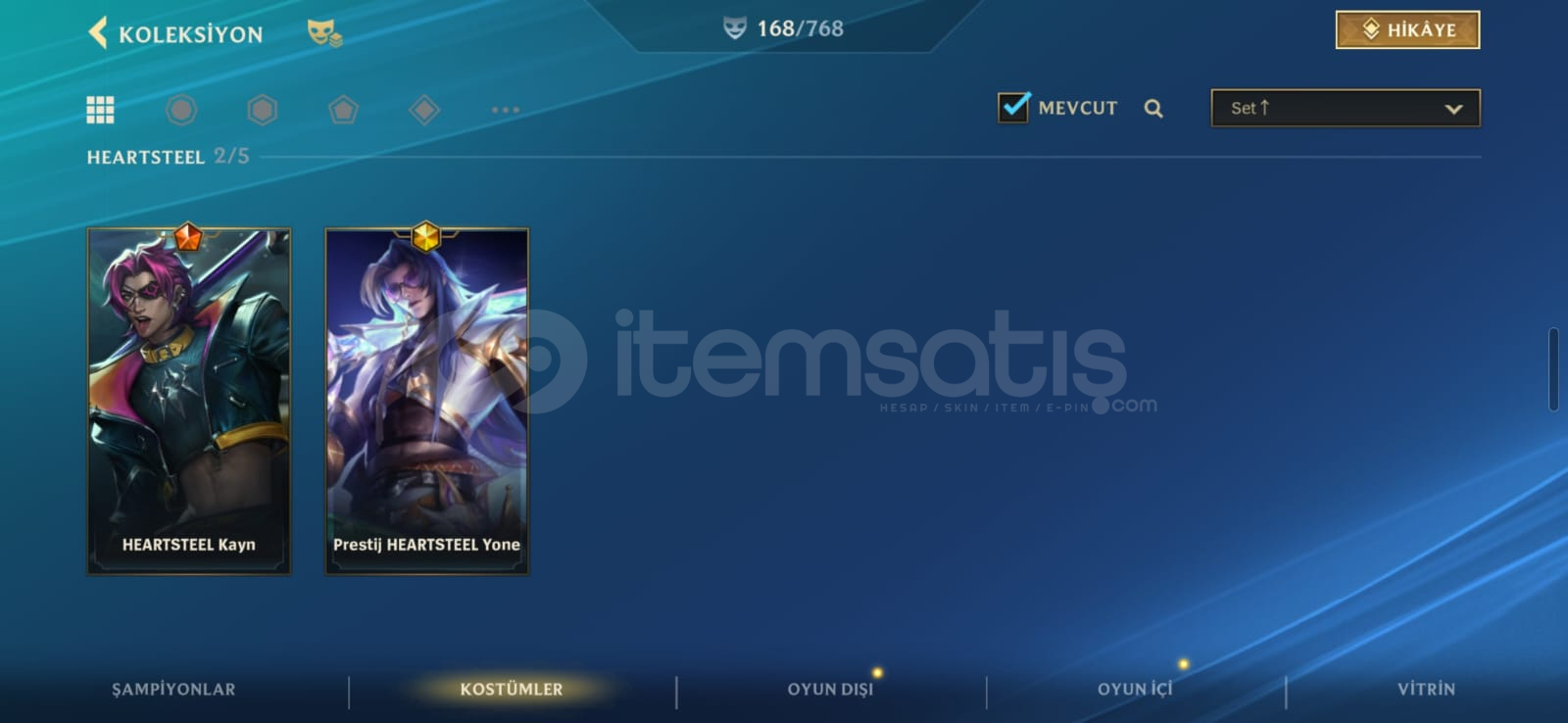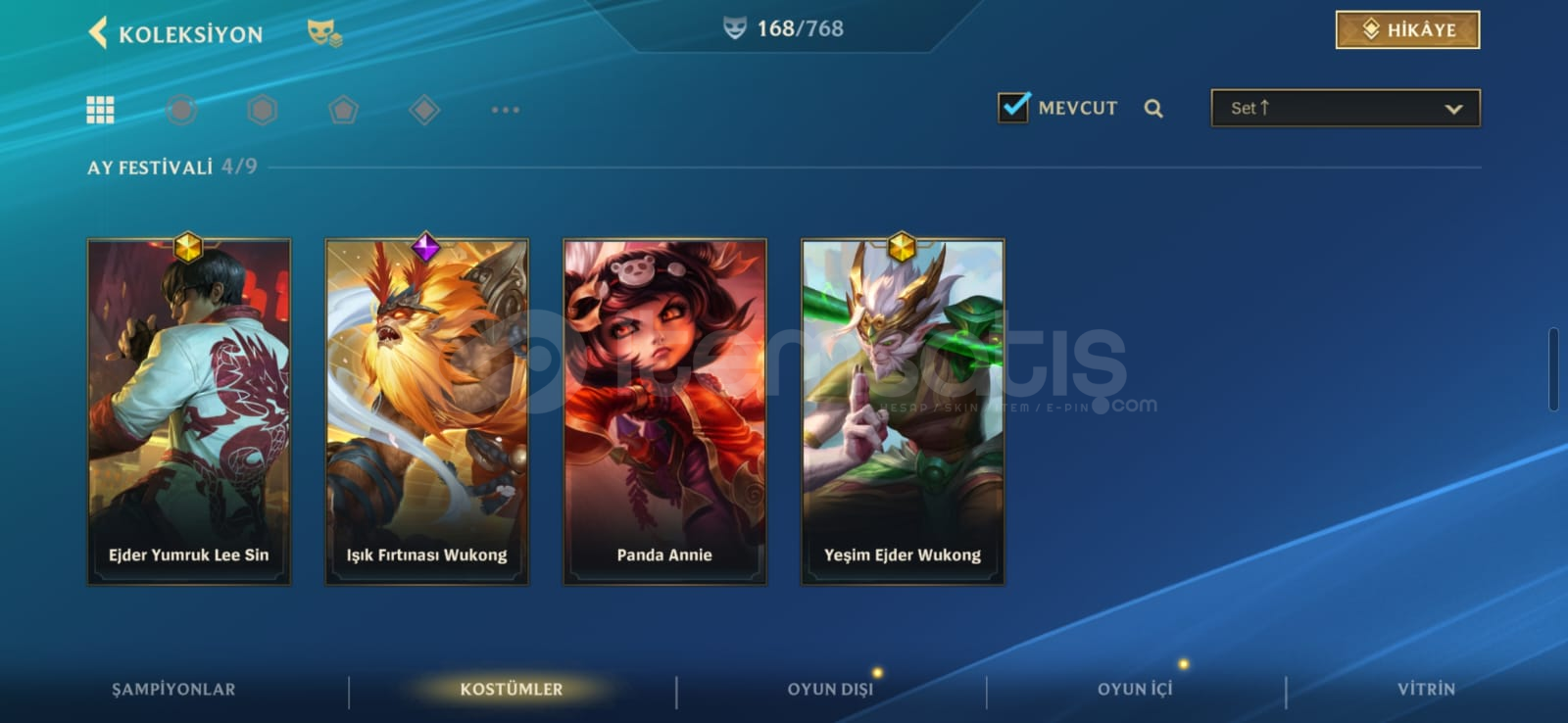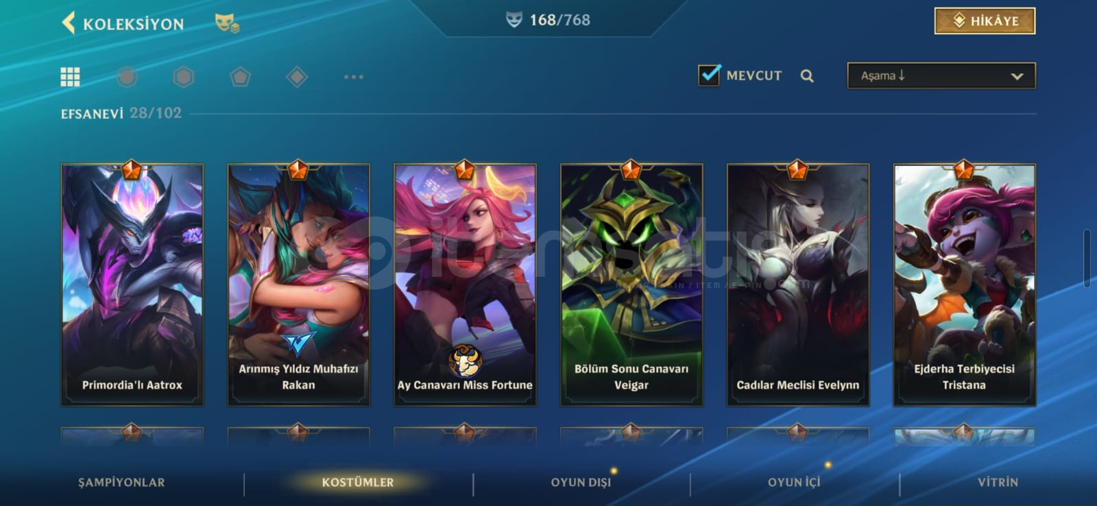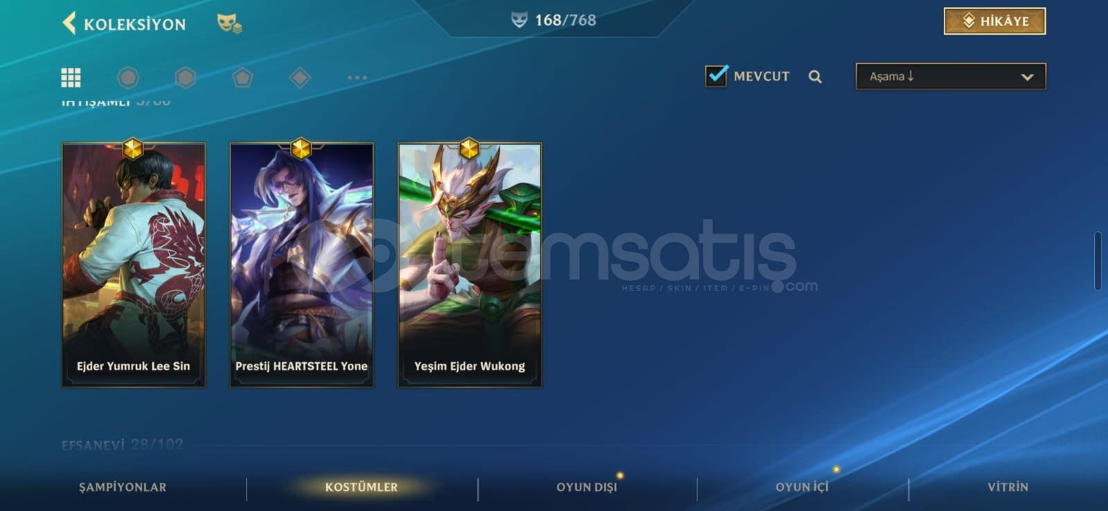 -Ejder Yumrul Lee-Prestij Heartsteel Yone-Yeşim Ejder Wukong132 Karakter / 168 kostüm(3 ihtişamlı, 28 efsanevi, 81 destansı,56 yaygın)22 yükleme çerçevesi26 özel dönüş135 ifade169 simge1 savaş arması35 renk seçeneğihesapta özel olarak nadir kostümler var(ay canavarı miss fortune/fiora, kaligraf viego/yasuo/sona, kristal gül ahri/ezreal/lux/viego/yone/sett/xayah/rakan/vlademir,havai fi&#...
