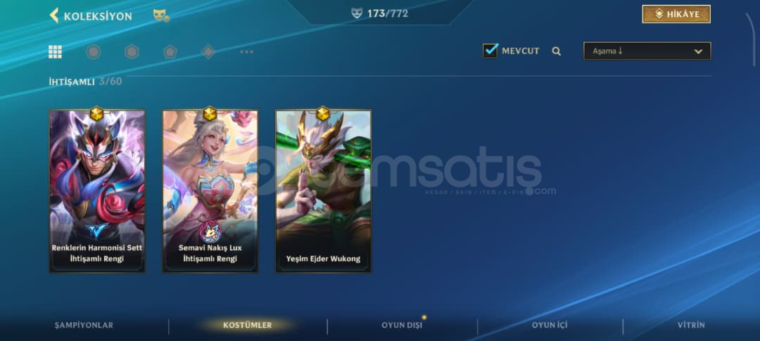 MAİL DEĞİŞİMİ YAPILACAKTIR.Wild rift hesabında resimlerde de görüldüğü üzere 173 kostüm vardır.Hesap Challenger görmüştür.3 İhtişamlı (Sarı)28 Efsanevi (Turuncu)86 Destansı (Mor)117 level lol hesabı vardır, içinde 36 adet skin bulunmaktadır.Hesap derecesiz ve takdiri 3. seviyedir.2 İhtişamlı, 3 Efsanevi, 17 DestansıHesaptan yana hi&cced...