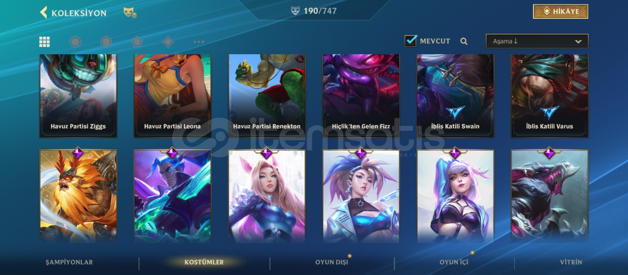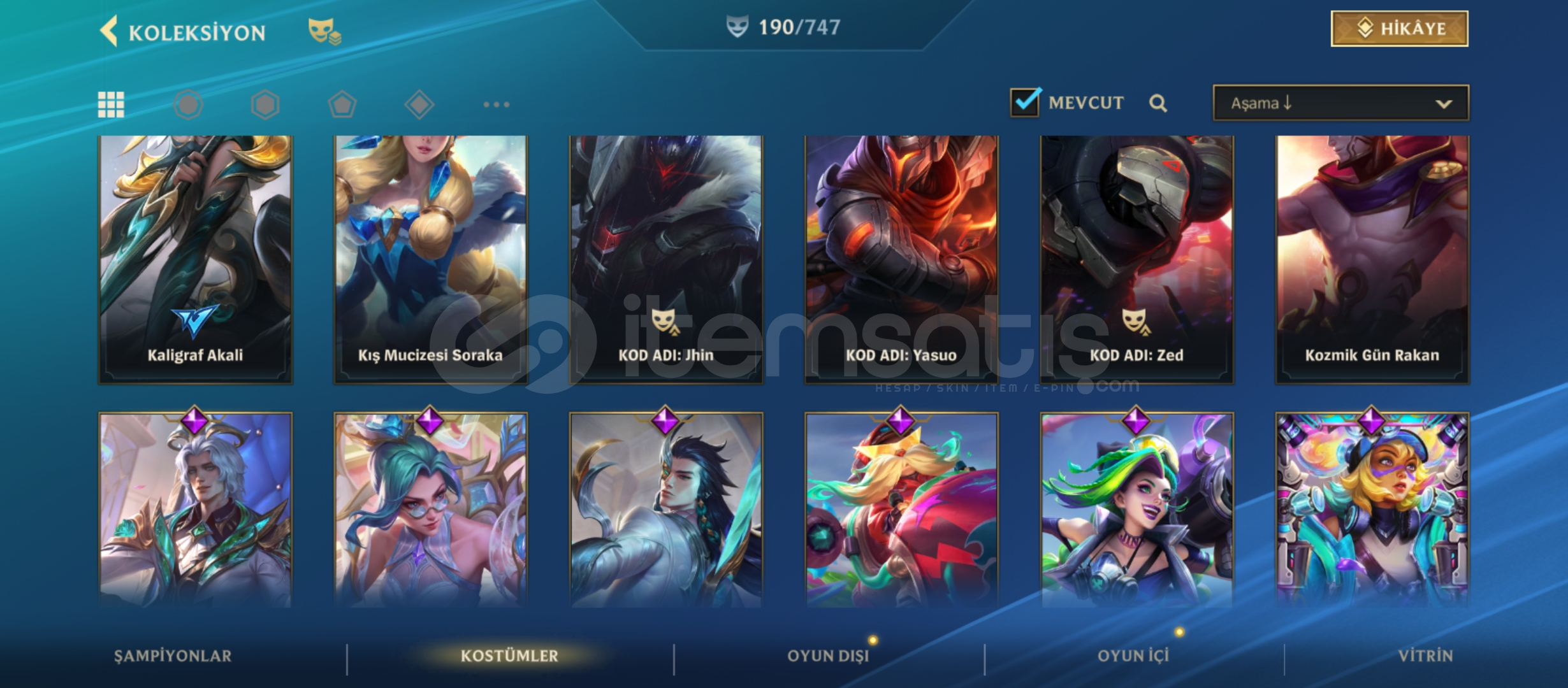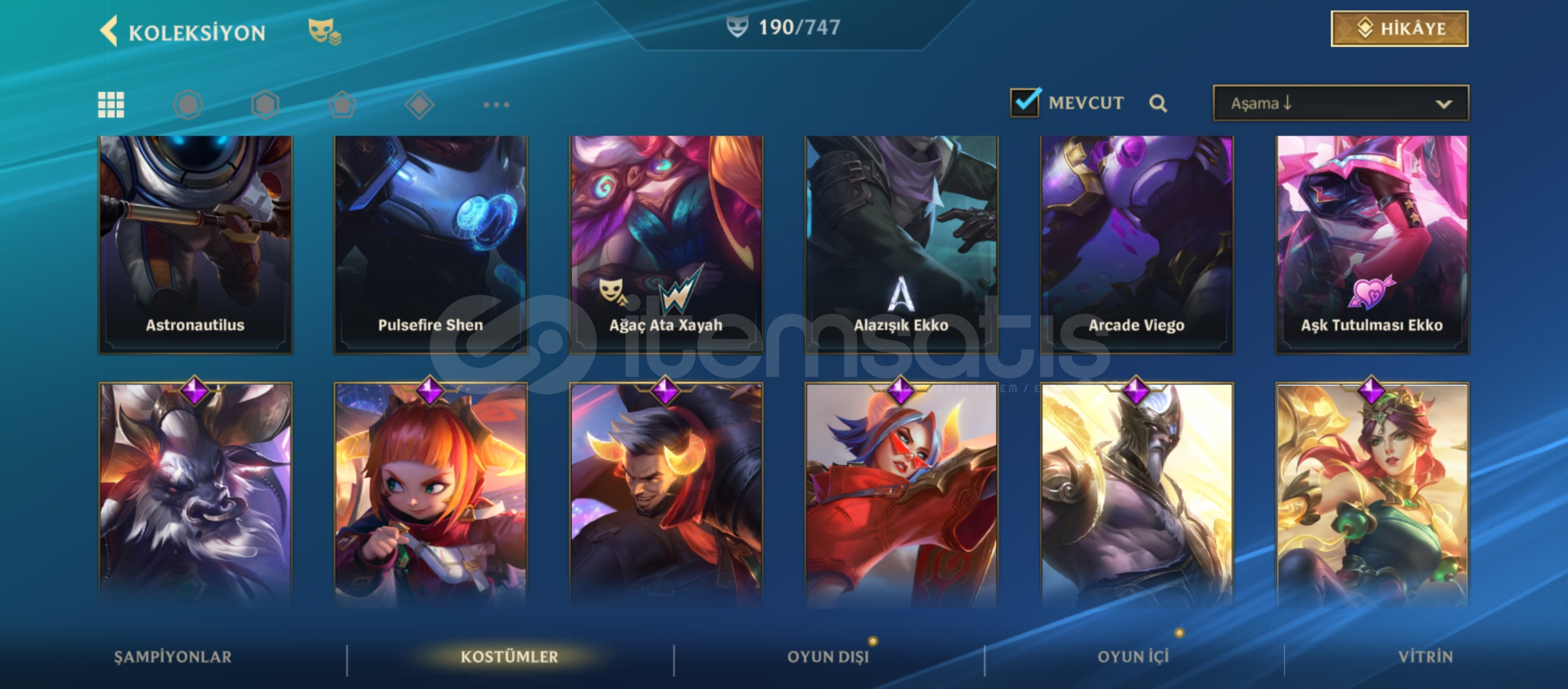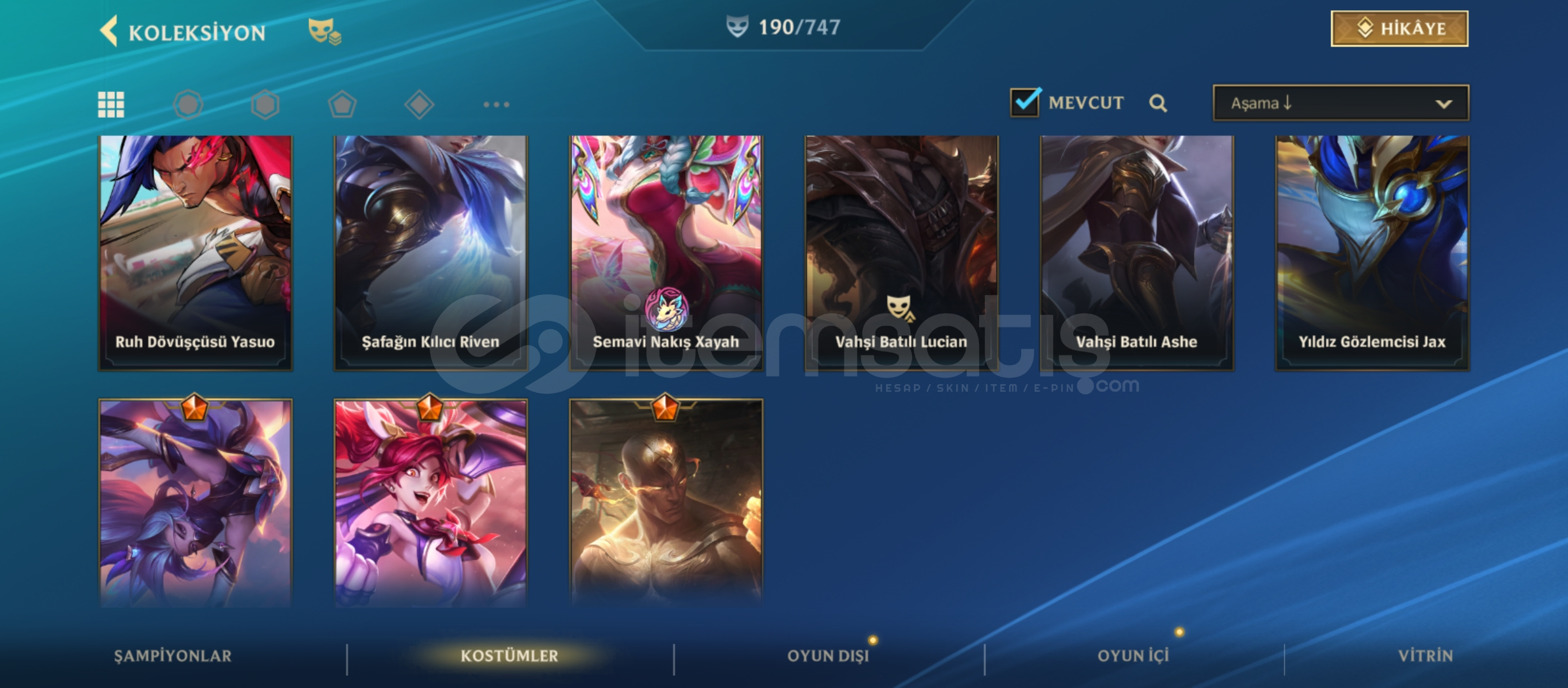 *İçinde birbirinden değerli tam 190 kostüm bulunmaktadır.*İlk maili bulunmaktadır ve ilk sahibiyim*Ekko ve Evelynn full kostüm (renk paketleri dahil)*İçinde animasyonlu 3 ifade 1 simge ve 1 çerçeve vardır.*Çoğu özel kostümlerin pozları da vardır.Alıcısına hayırlı olsun ilan 2 gün kalacaktır 2 gün içinde para bulmam gerekiyor çünkü...