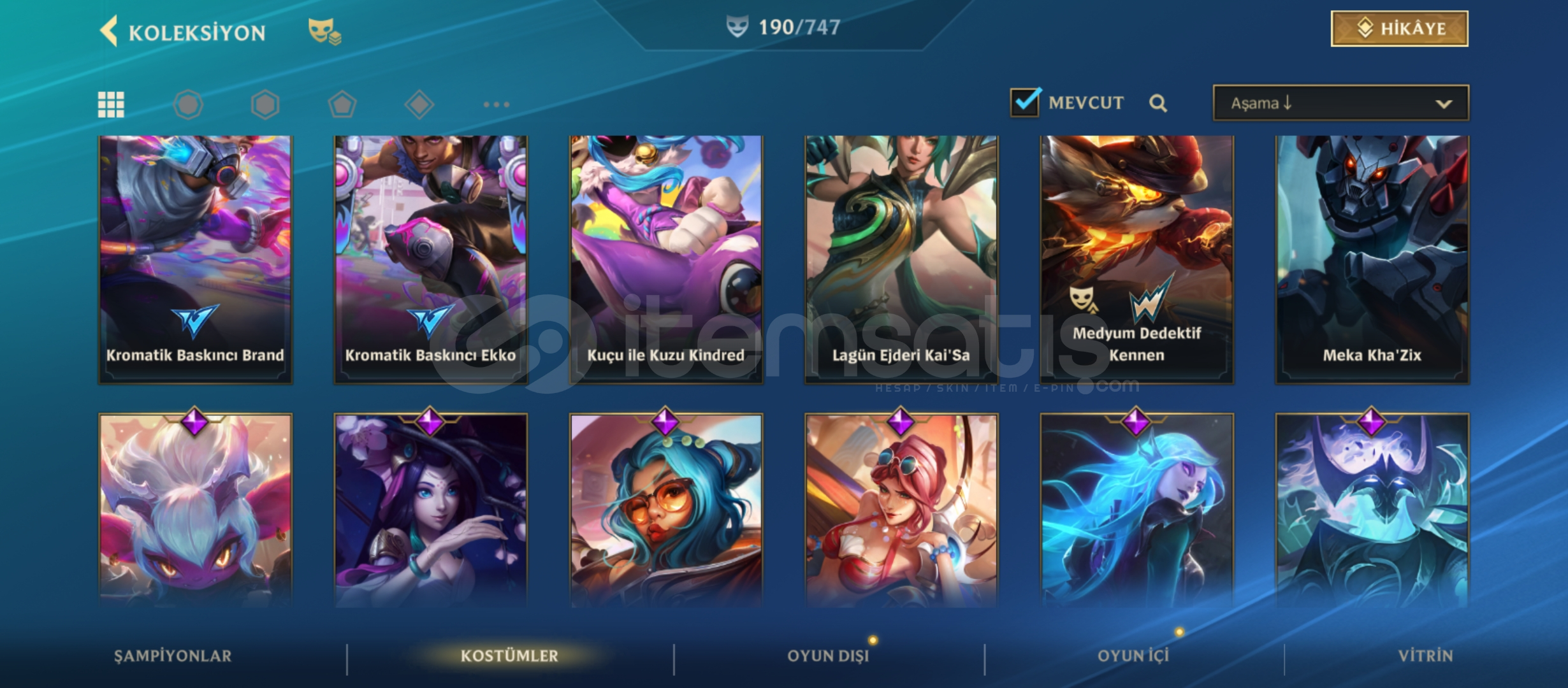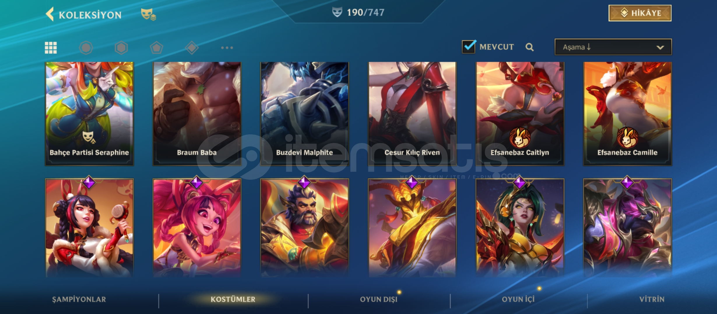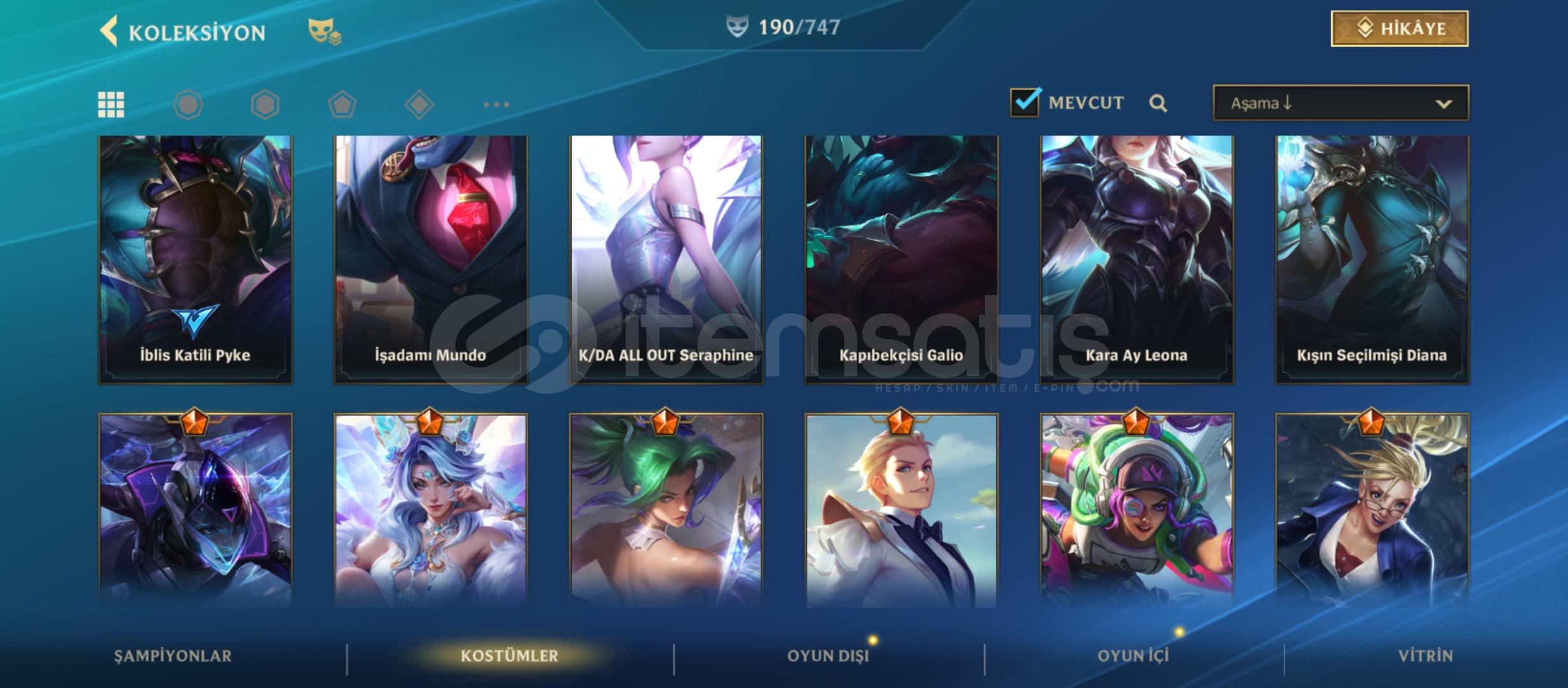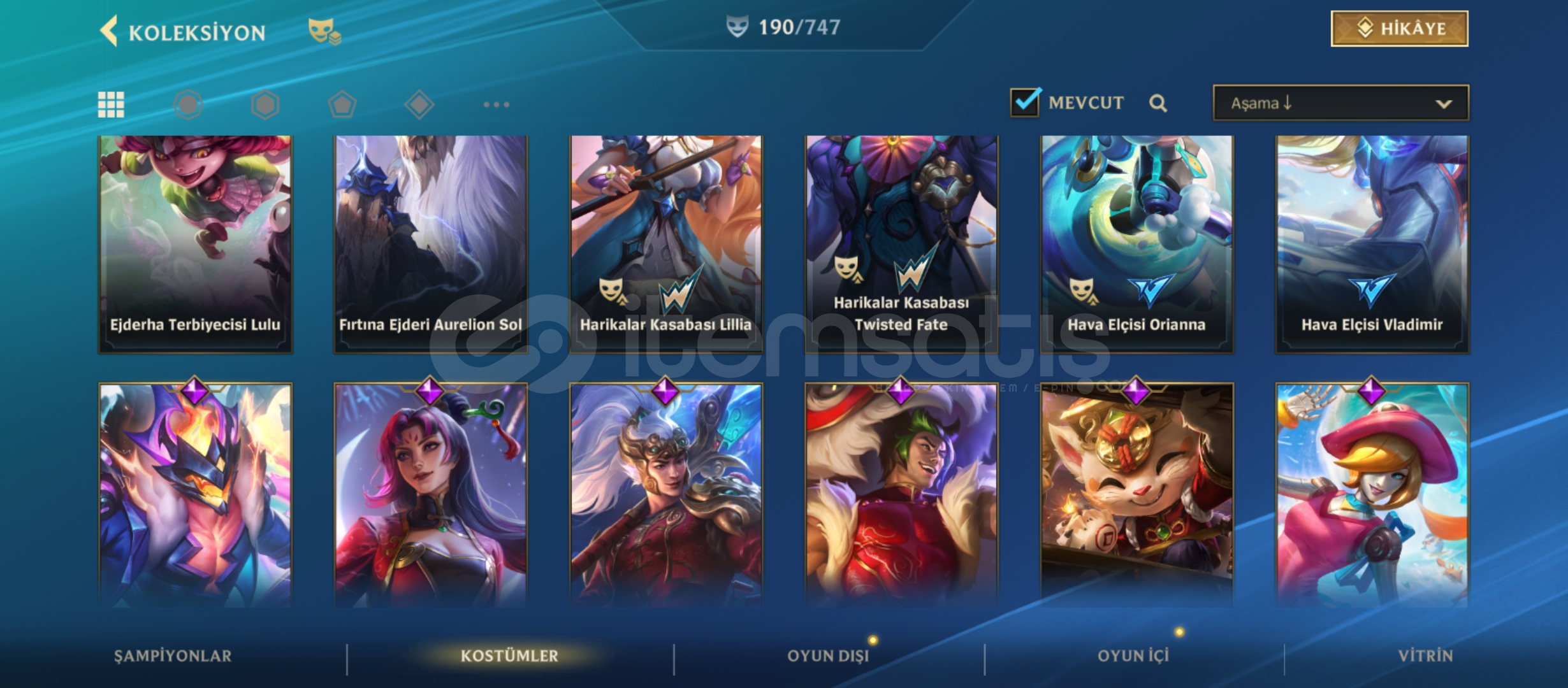 *İçinde birbirinden değerli tam 190 kostüm bulunmaktadır.*İlk maili bulunmaktadır ve ilk sahibiyim*Ekko ve Evelynn full kostüm (renk paketleri dahil)*İçinde animasyonlu 3 ifade 1 simge ve 1 çerçeve vardır.*Çoğu özel kostümlerin pozları da vardır.Alıcısına hayırlı olsun ilan 2 gün kalacaktır 2 gün içinde para bulmam gerekiyor çünkü...