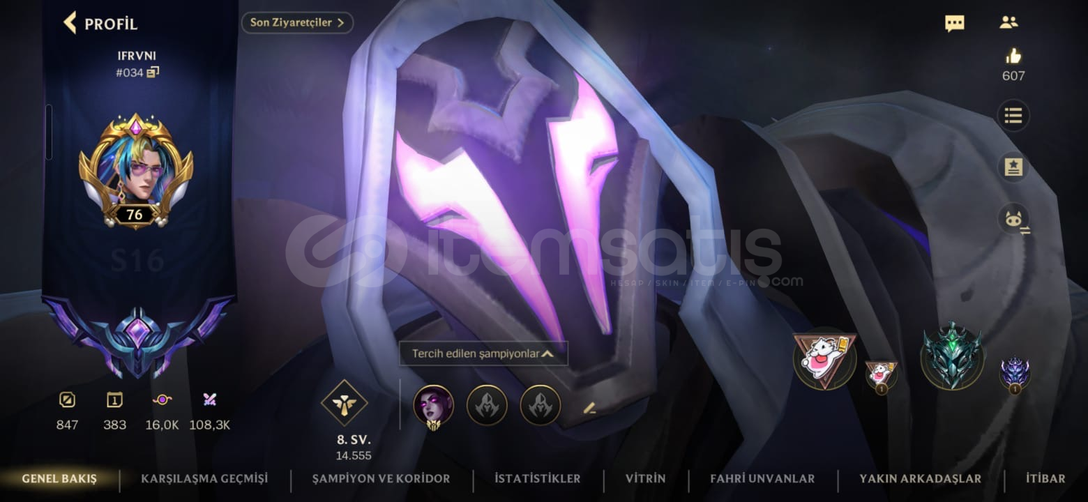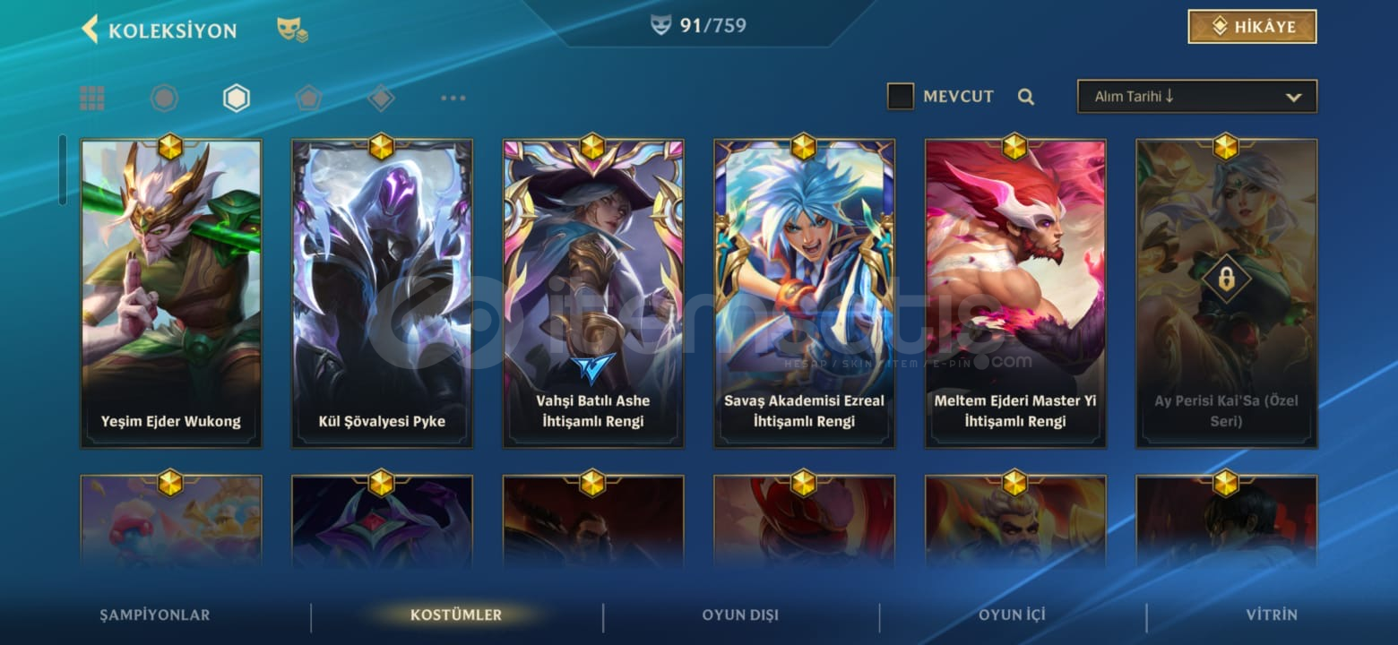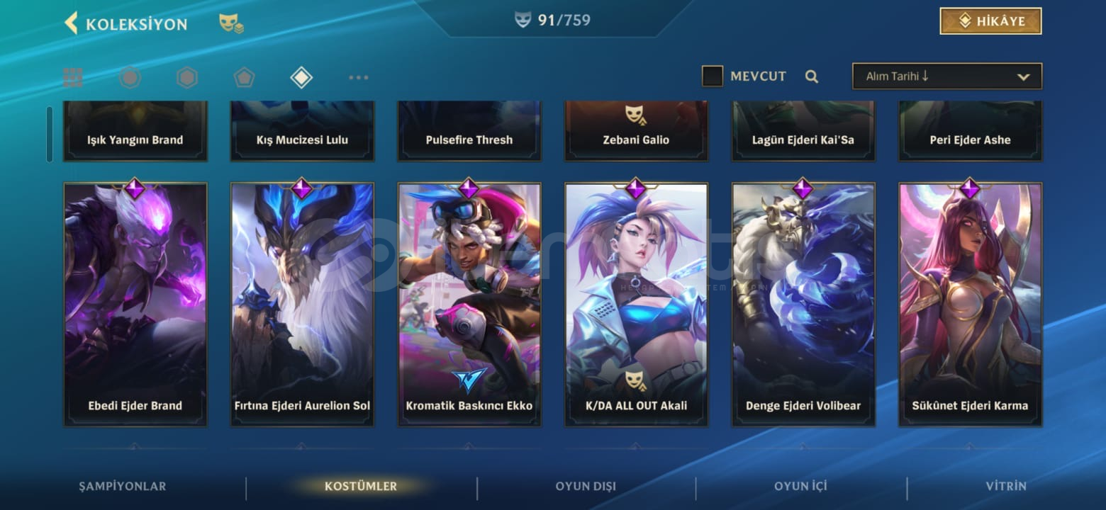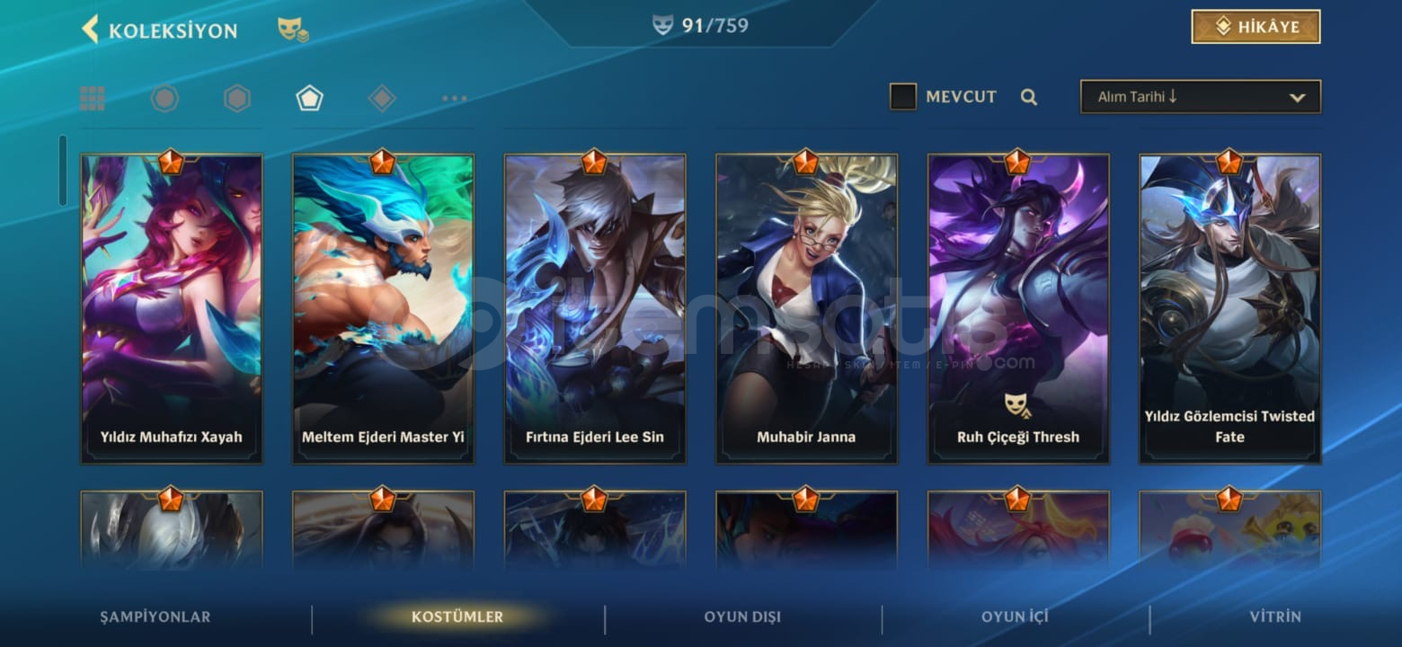 Hesap supportlara özel hataha morgana özeli bir hesaptır.genelde suppoart karakterler barındırır. Yüksek elolarda sabit oyuncular tarafından tanınır.hesapta skil kostümler aktiftir.bir çok kostüm koleksiyonu tamamlanmıştırkül şovalye pyke set animasyonlupresjtij ashe set animasyonluVe oyunda satılmayan bir çok kostümleri mevcuttur hesaba kendim 35.000 tl yatırım gerçekle&...