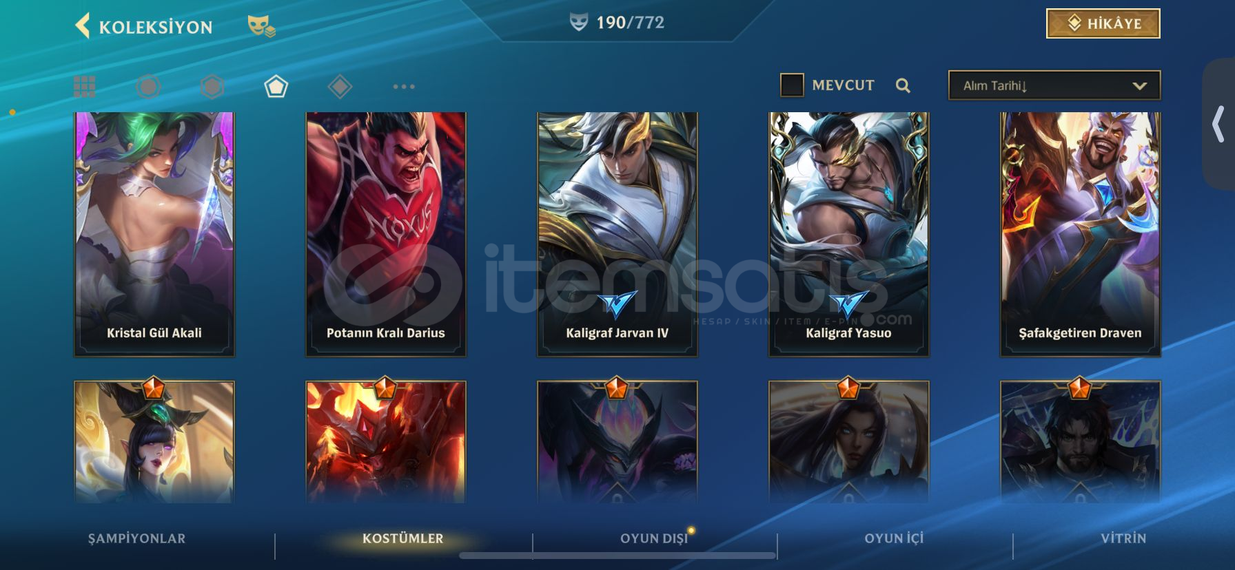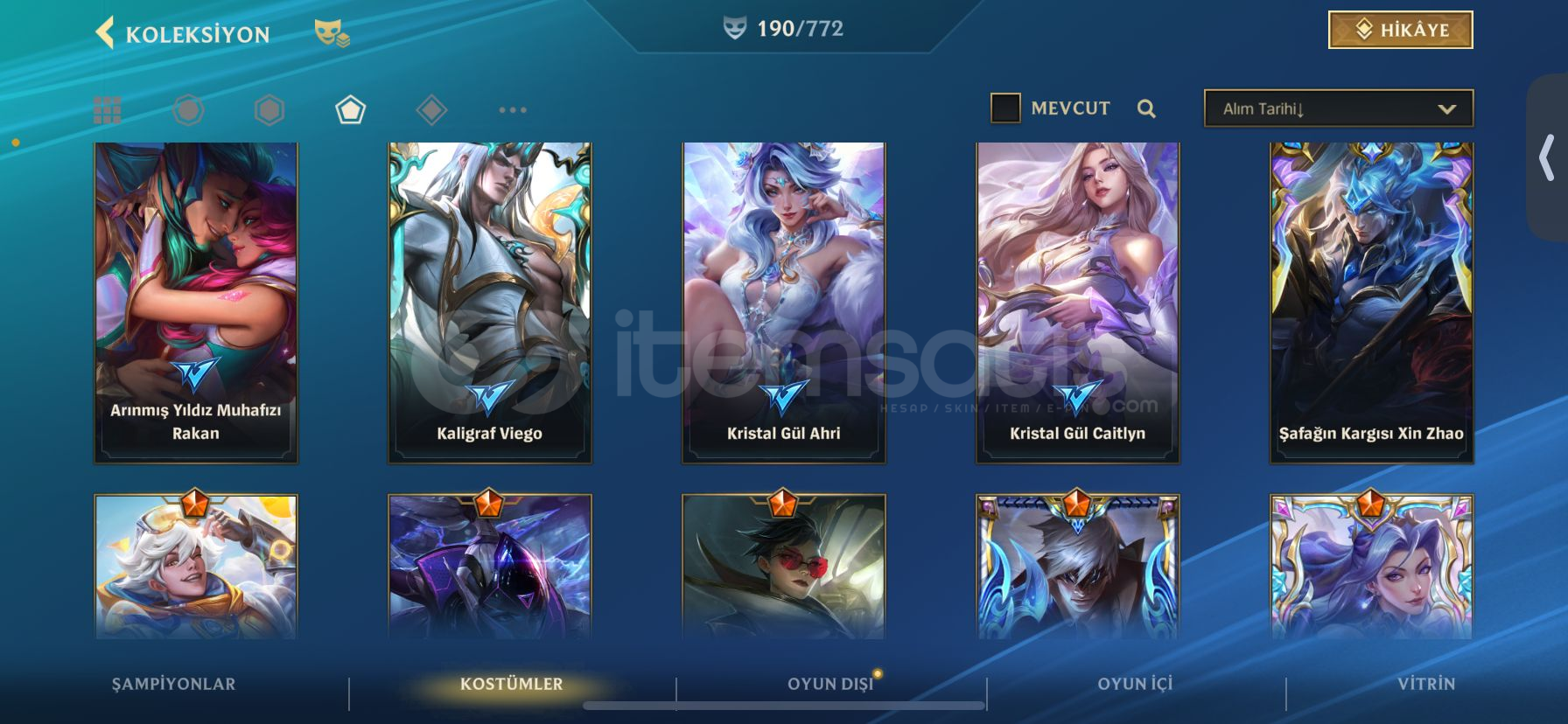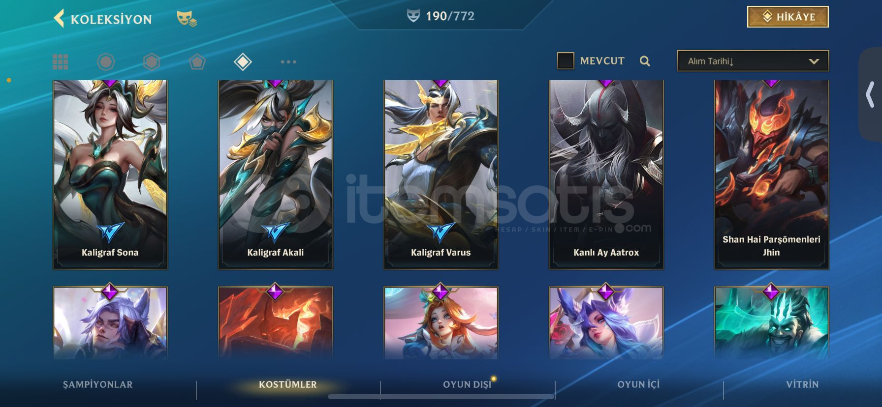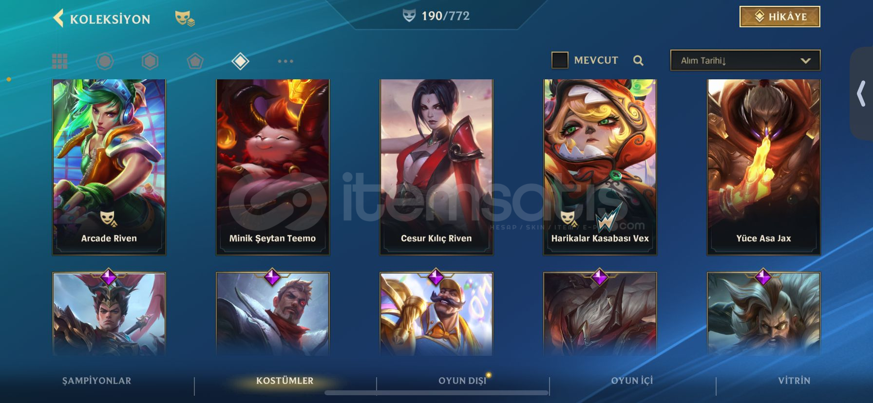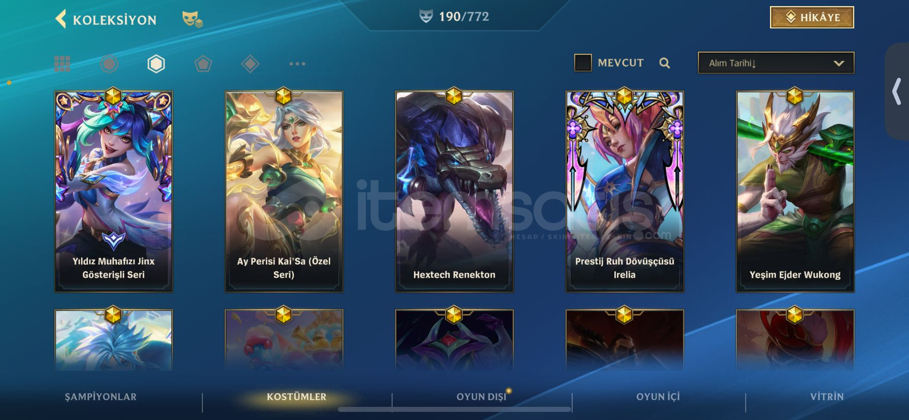 Hesapta 190 kostüm, 40.000 koleksiyon puanı ve 3 kez İMPARATOR OLMUŞTUR BU SEZONDA İMPARATOR BİTİRİCEK. Kostüm pozları, çerçeveler dahil birçok paketli içerik mevcut. İçinde 200 turuncu öz vardır. Wild Rift kartlarının tamamı neredeyse açılmıştır. Her çarın kostümü neredeyse mevcuttur ve artık alınamayan özel kostümler vardır.
