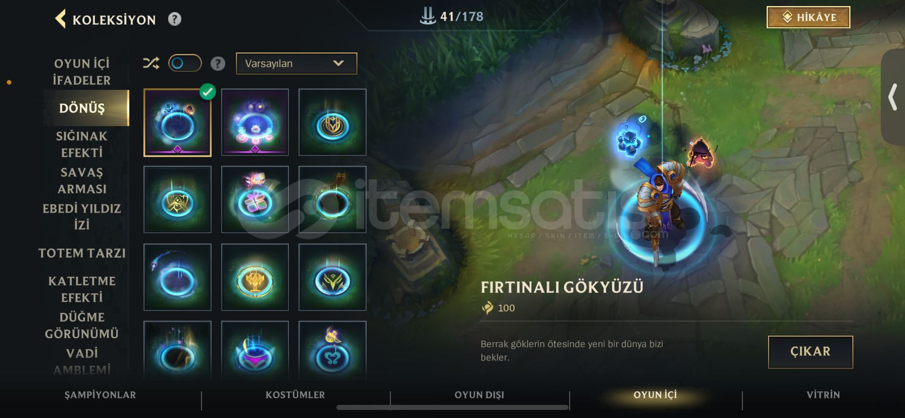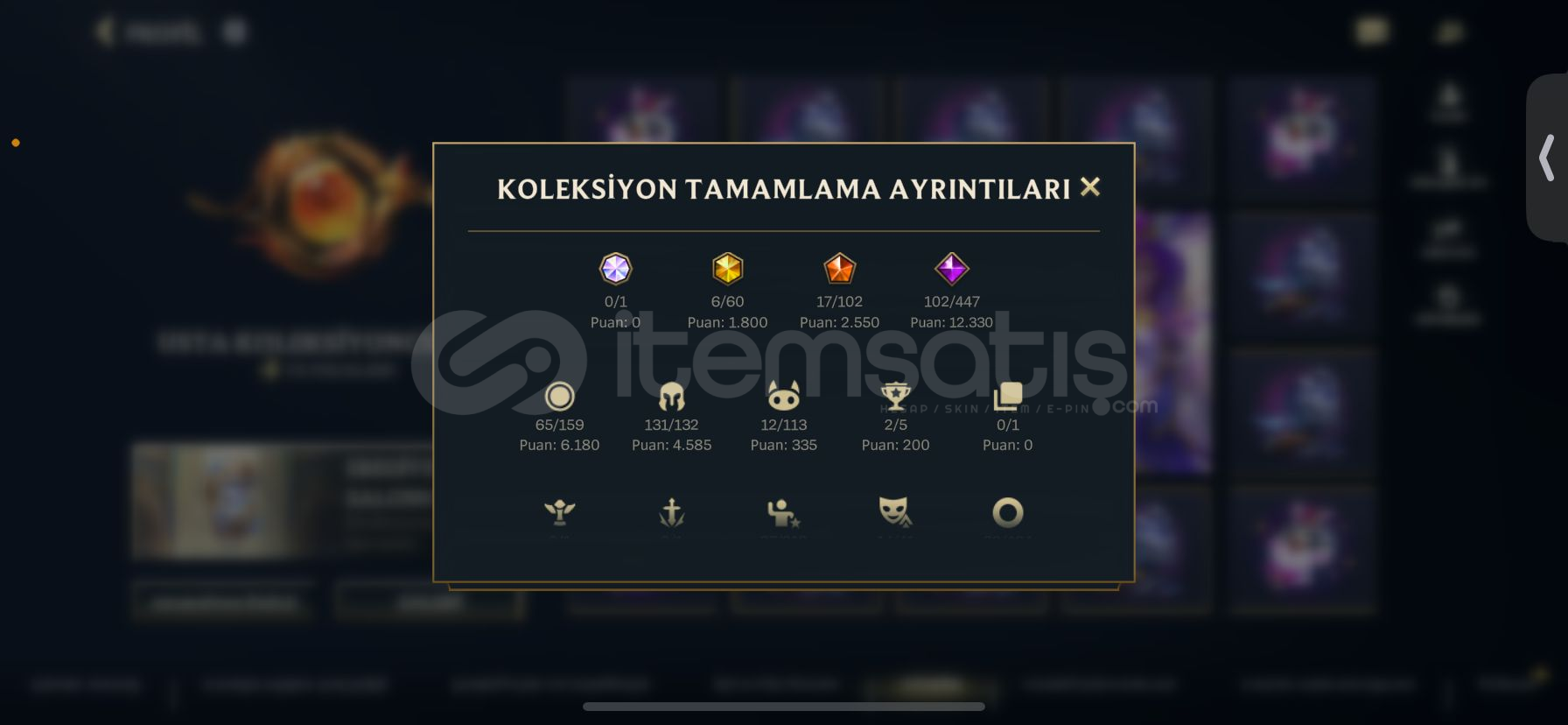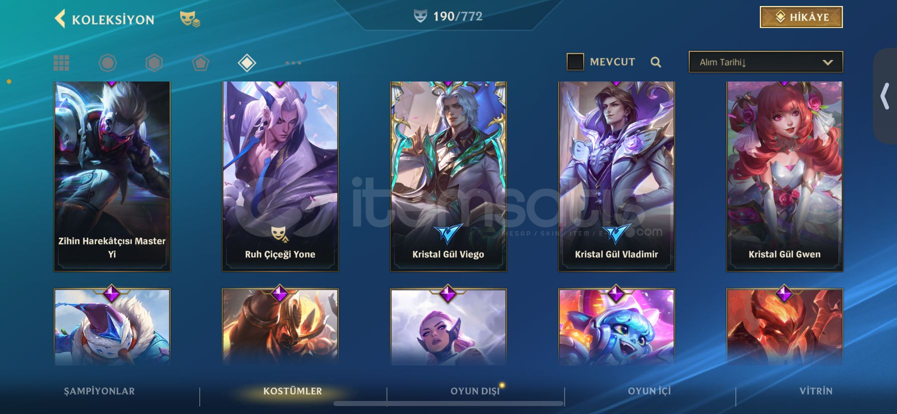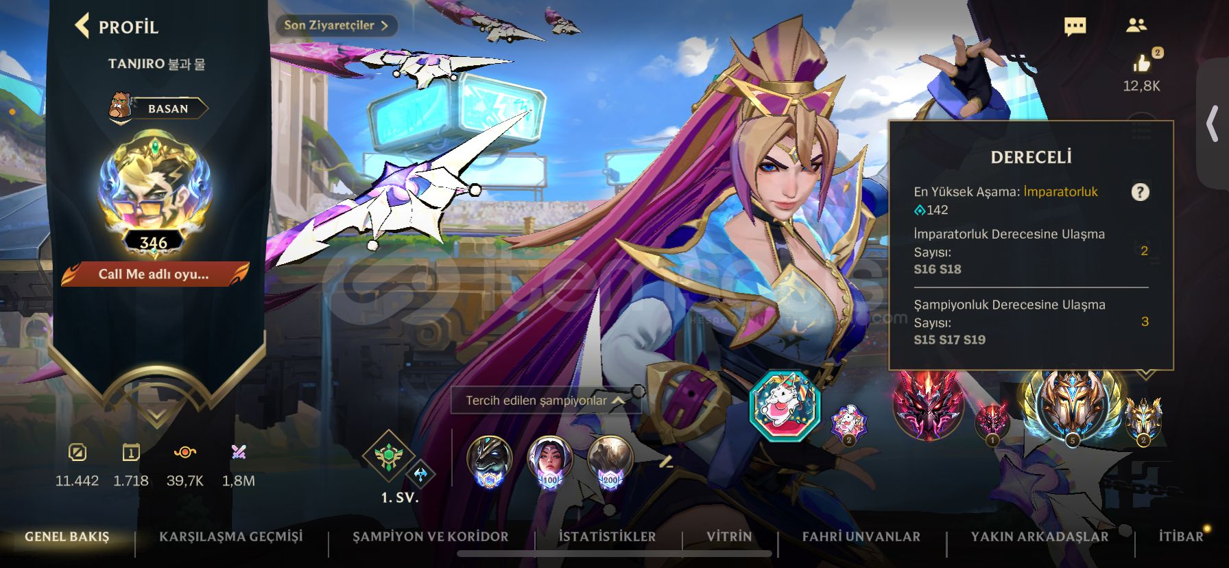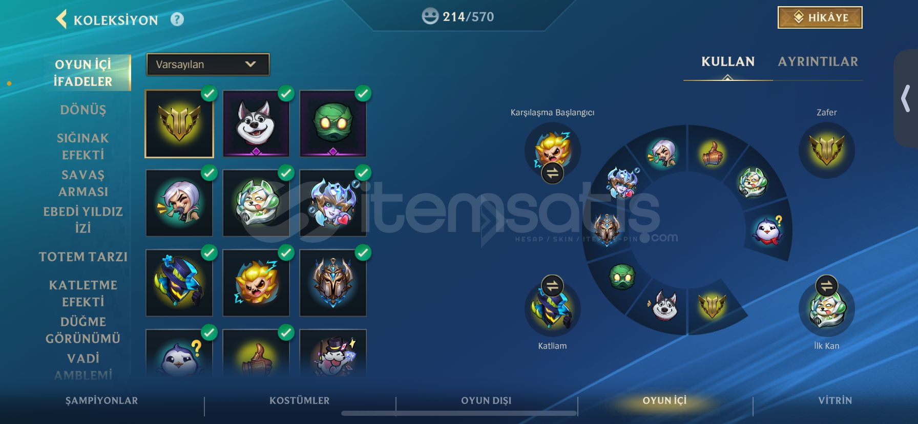 Hesapta 190 kostüm, 40.000 koleksiyon puanı ve 3 kez İMPARATOR OLMUŞTUR BU SEZONDA İMPARATOR BİTİRİCEK. Kostüm pozları, çerçeveler dahil birçok paketli içerik mevcut. İçinde 200 turuncu öz vardır. Wild Rift kartlarının tamamı neredeyse açılmıştır. Her çarın kostümü neredeyse mevcuttur ve artık alınamayan özel kostümler vardır.