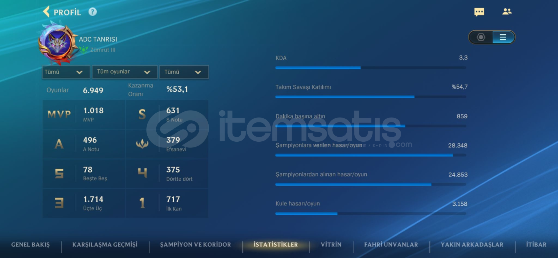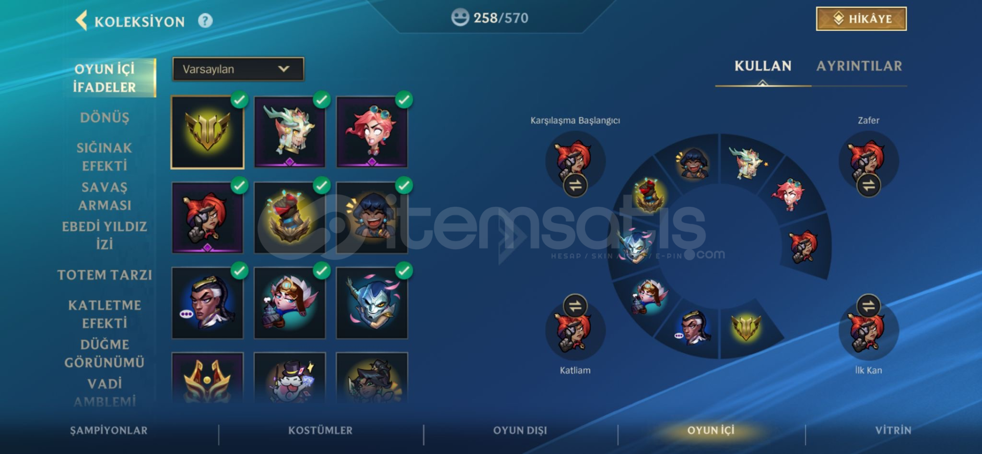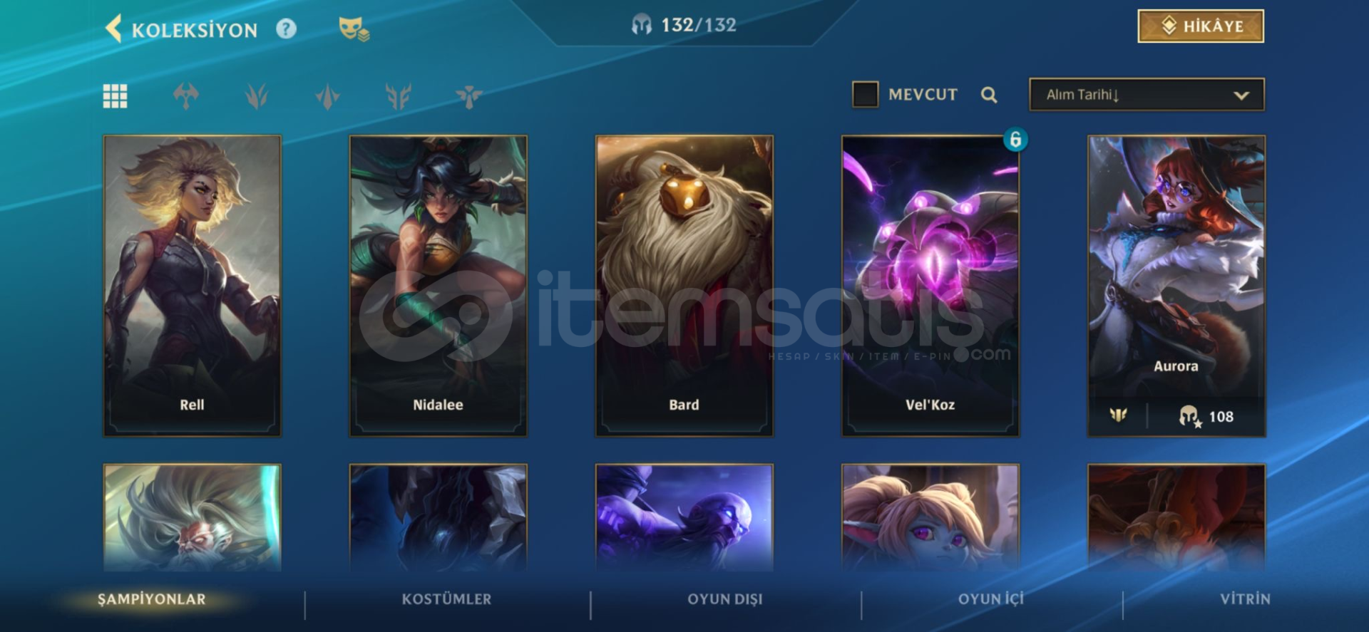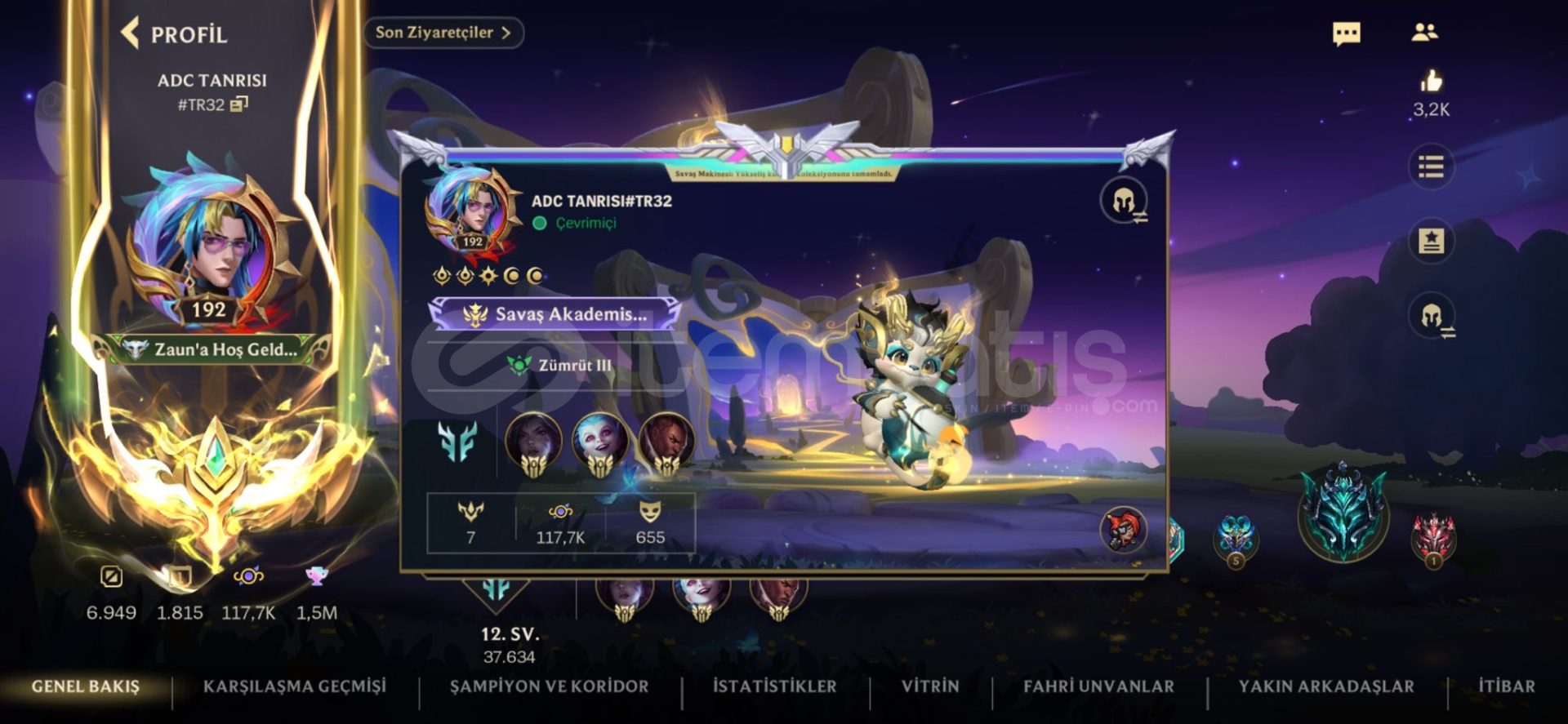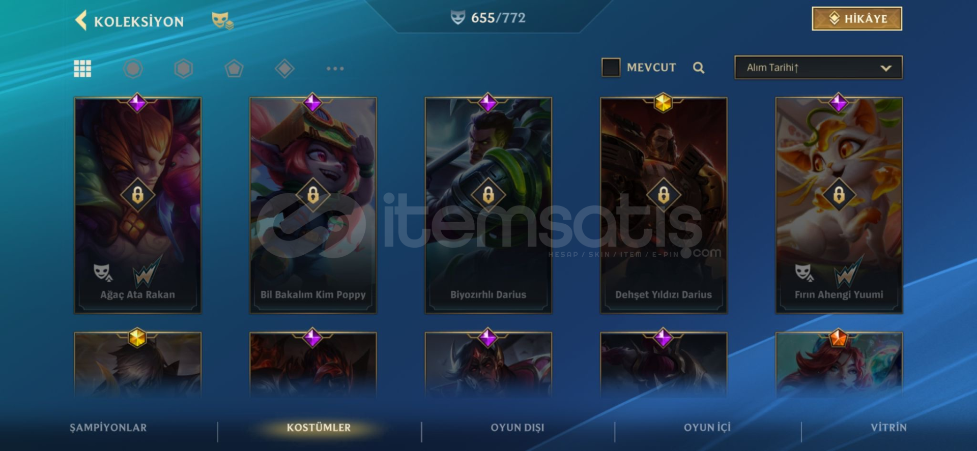 655 kostümlü 192 lvl 117.7K koleksiyon puanı var. Tüm şampiyonları açık. 2020 den beri oynuyorum. Borç...