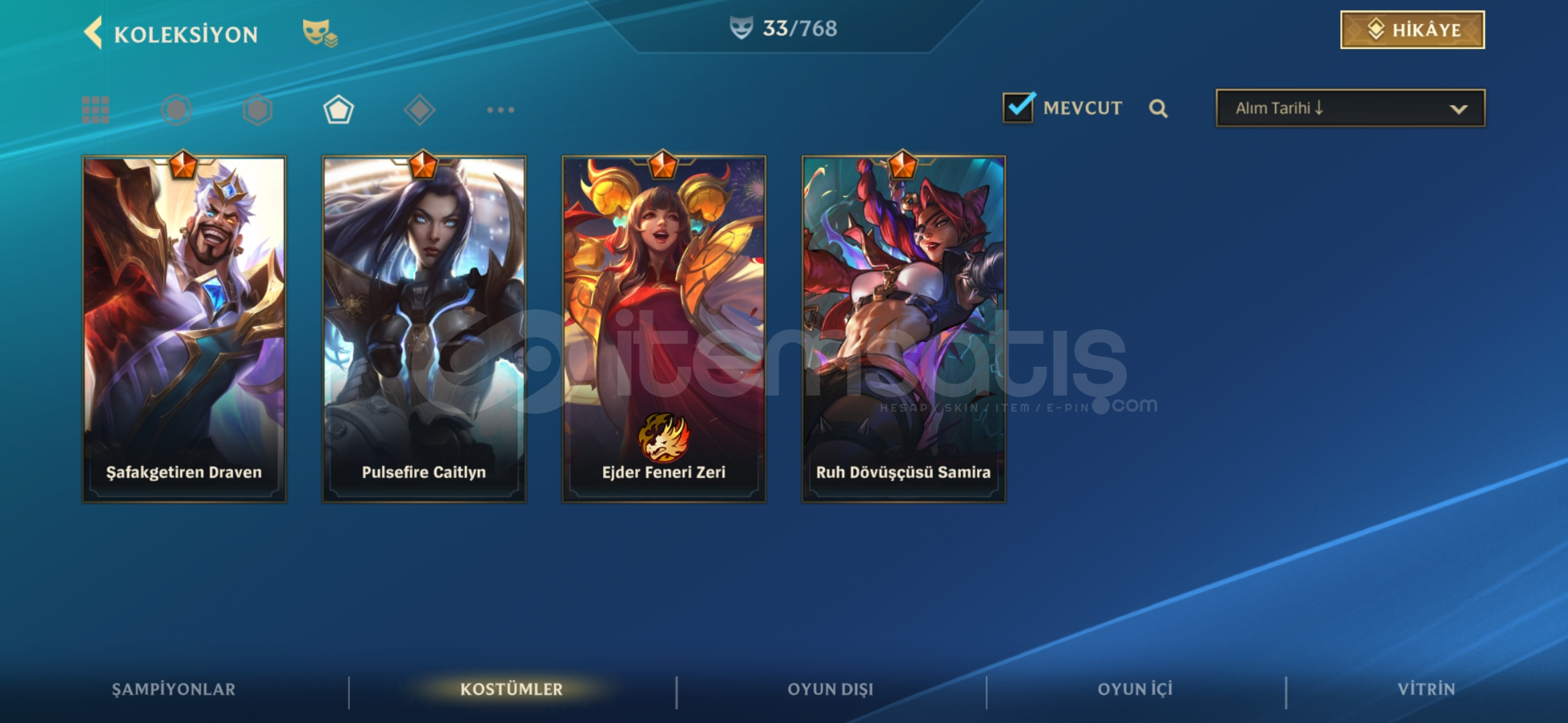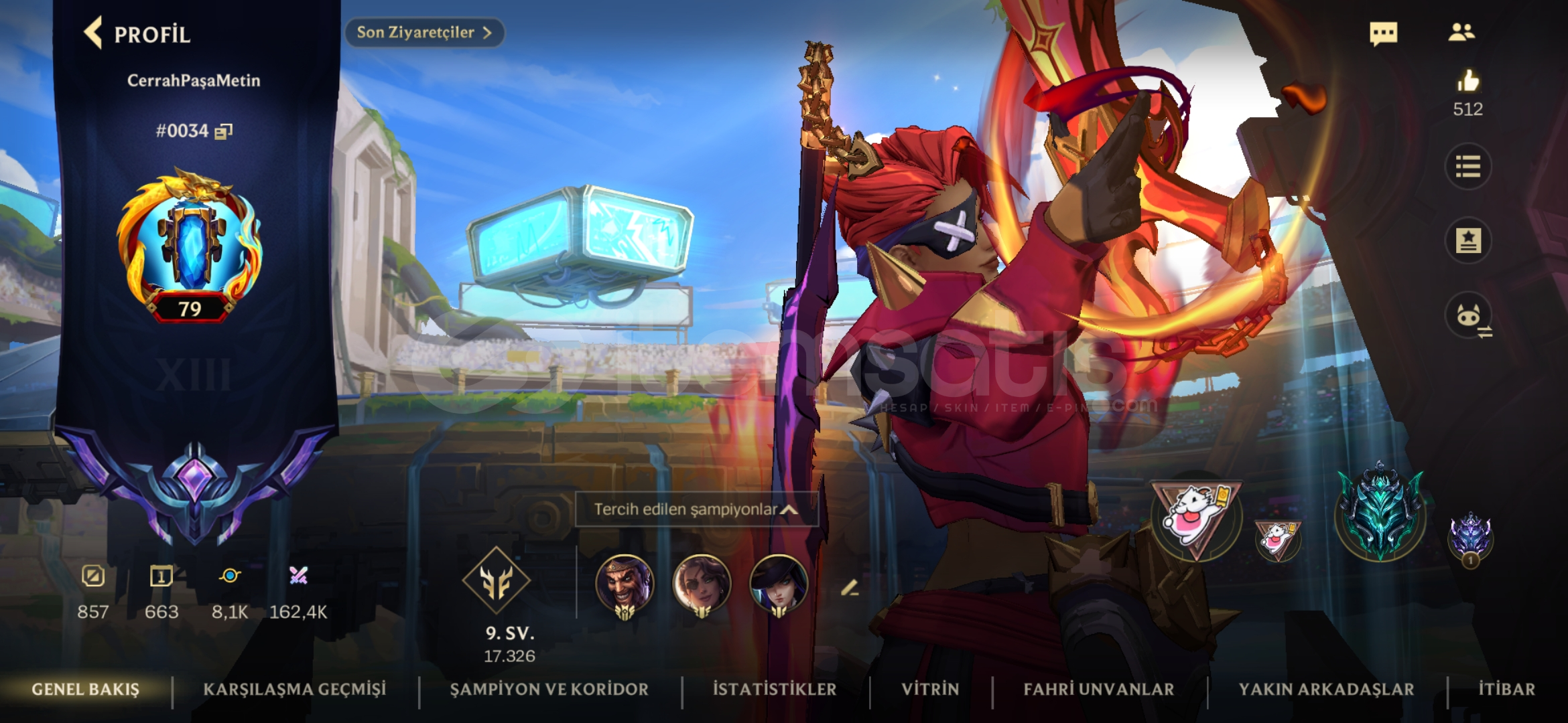 Hesap max diamond 2 görmüş adc main hesaptır.Draven Samirq Caitlyn Zeri gibi çarların ihtişamlı güzel kostümleri vardır.200 turuncu cevheri vardır.4688 yogunlasmis özüt vardır.Sorular için dm.Pazarlık olur abartmadan