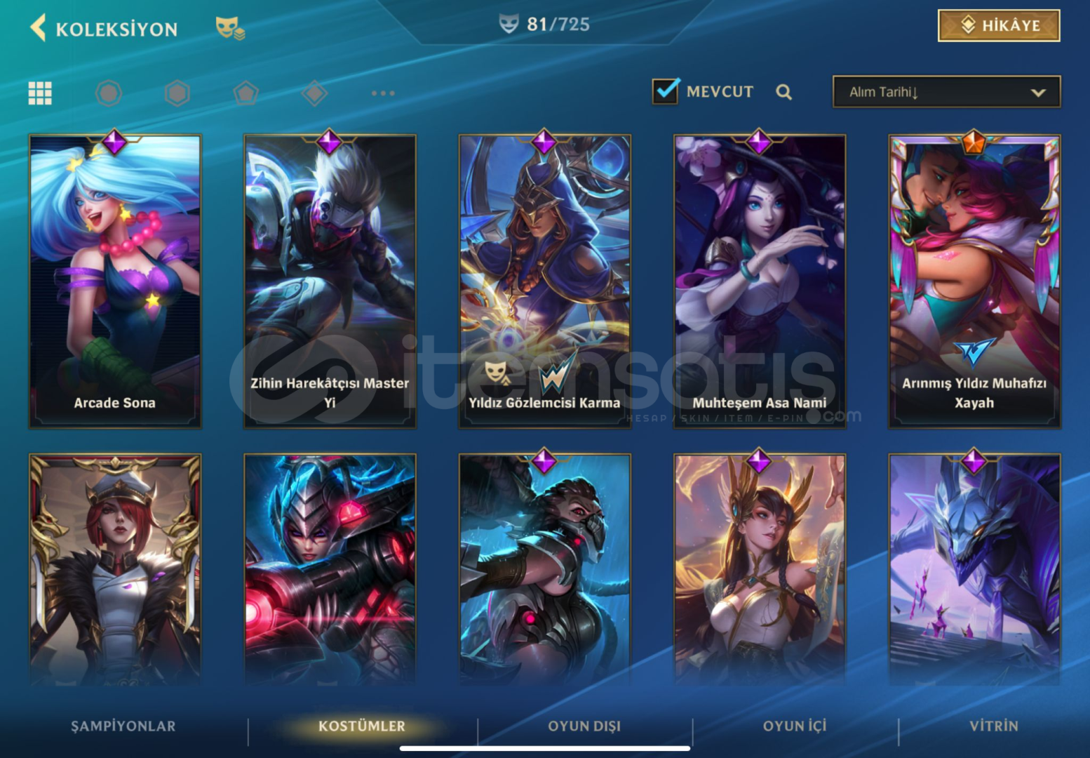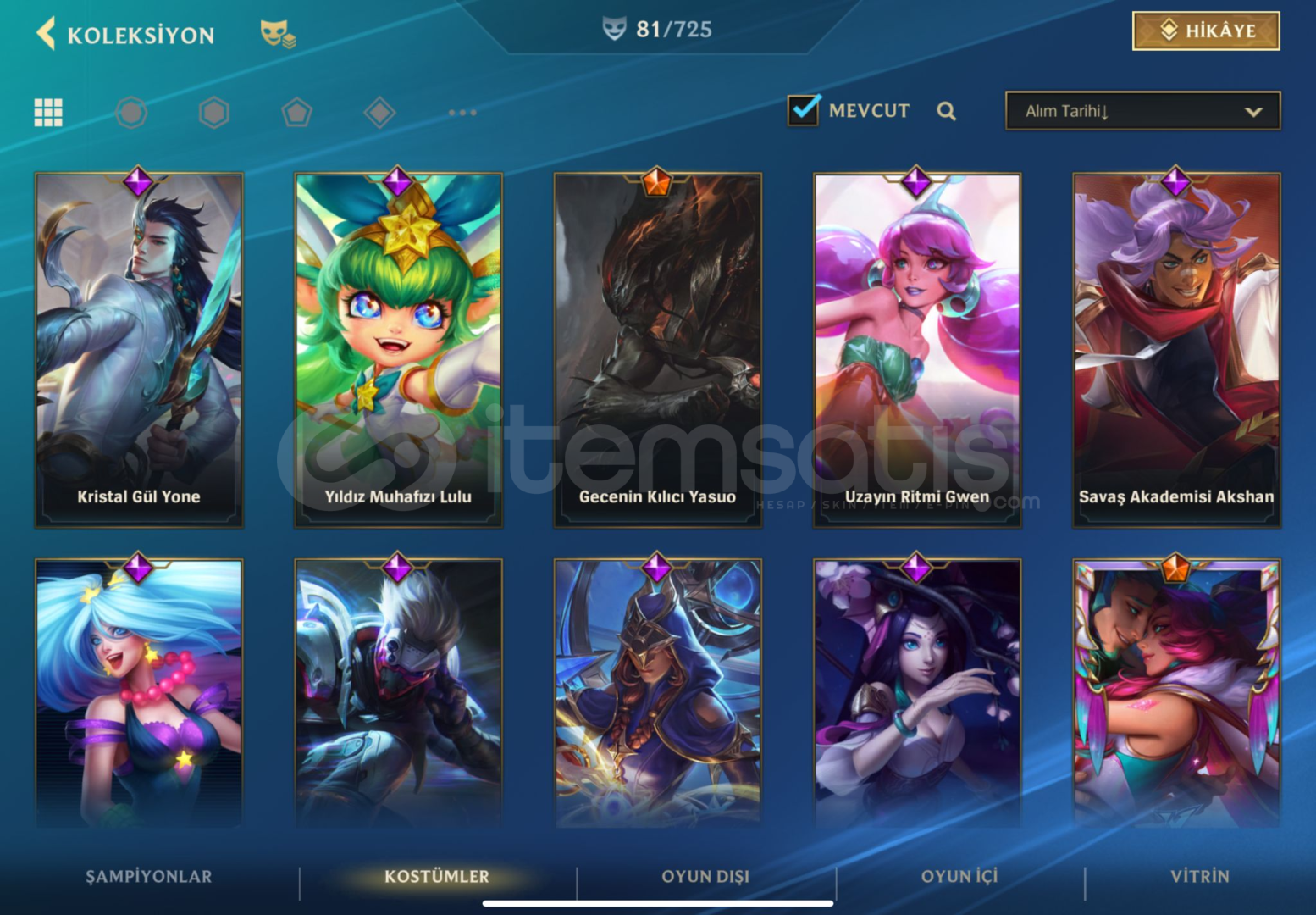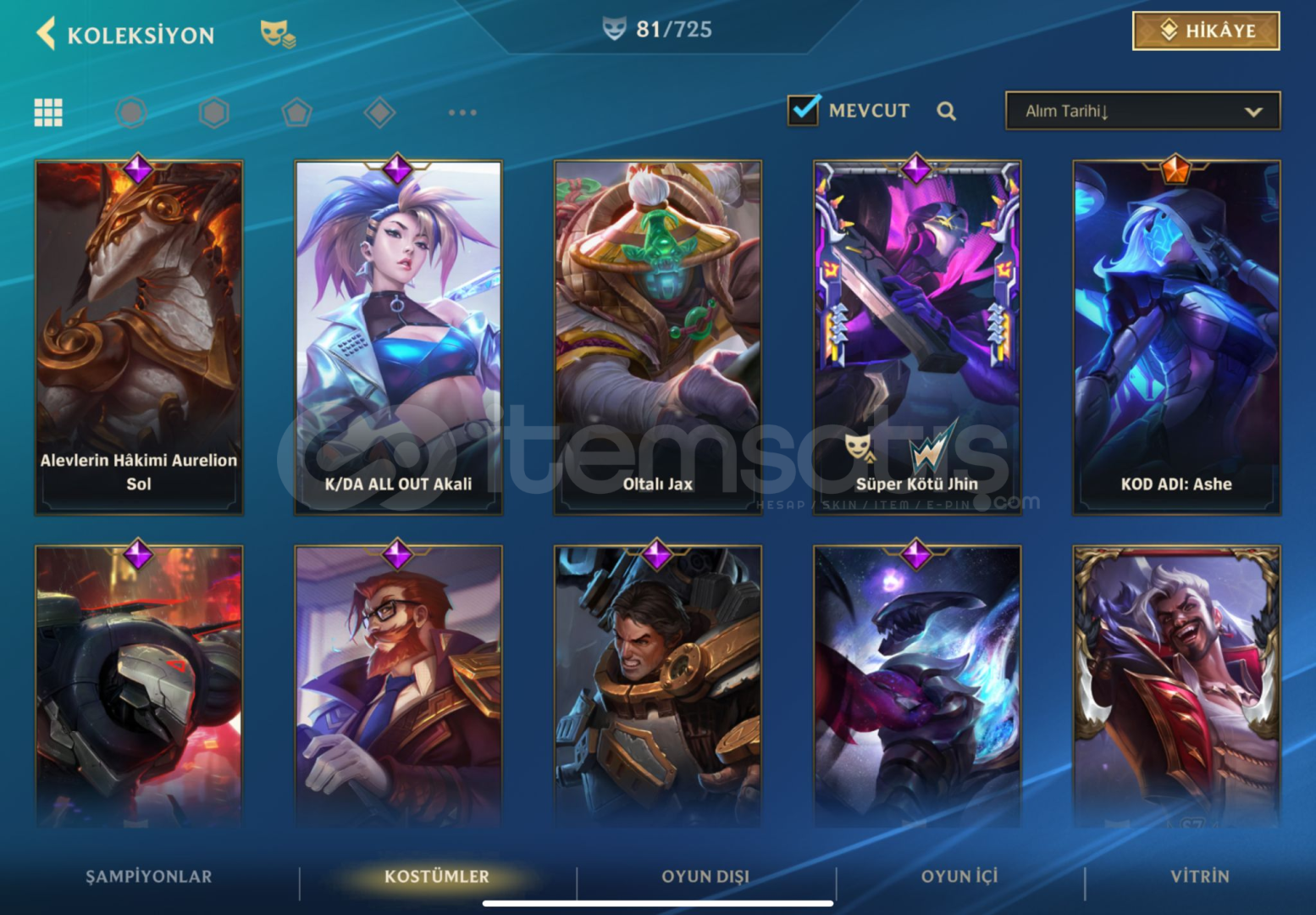 Siteye maksimum 10 tane fotoğraf yüklendiği için hepsini koyamadım, HESABIN TAMAMI : https://streamable.com/pp9jmhHesapta el emeğidir ve tertemizdir hiç bir sorun yaşamazsınız.Hesapta 81 Adet kostüm mevcuttur.Gecenin Kılıcı Yasuo, KDA ALL OUT Akali, Galaksi Katili Zed, Meltem Ejderi Master Yi gibi en güzel skinler hesapta mevcuttur.HESAPTA 8 TANE EFSANEVI KOSTUM BULUNMAKTADIRHesapta 120 adet şampiyon mevcutturHes...
