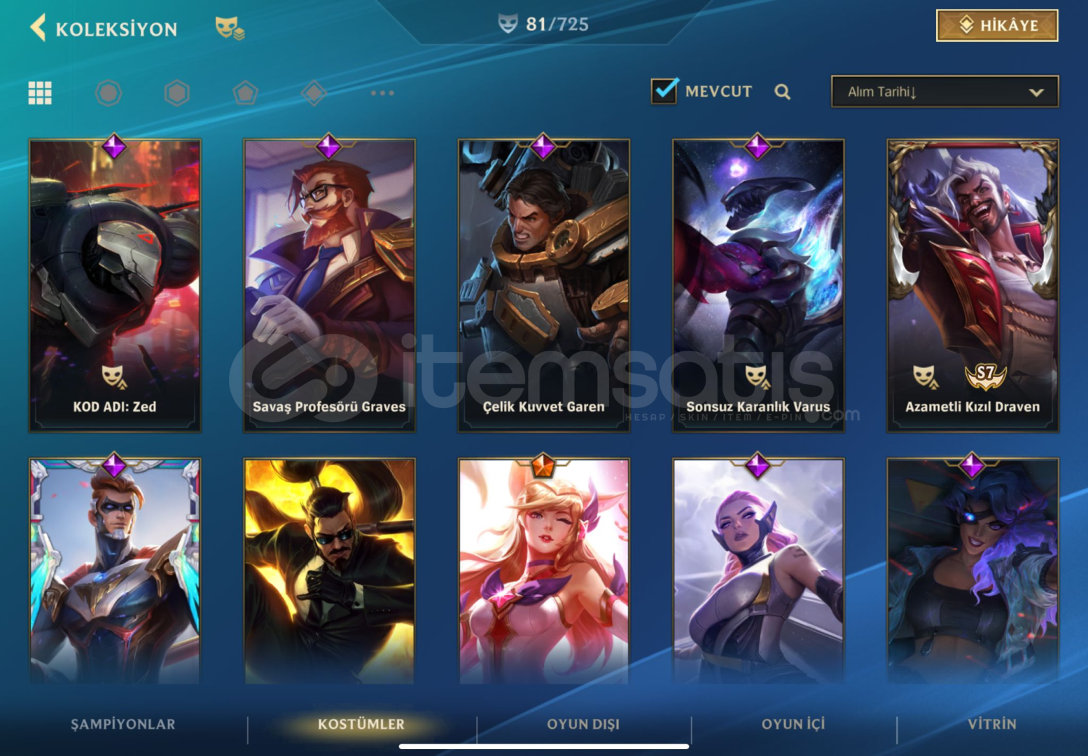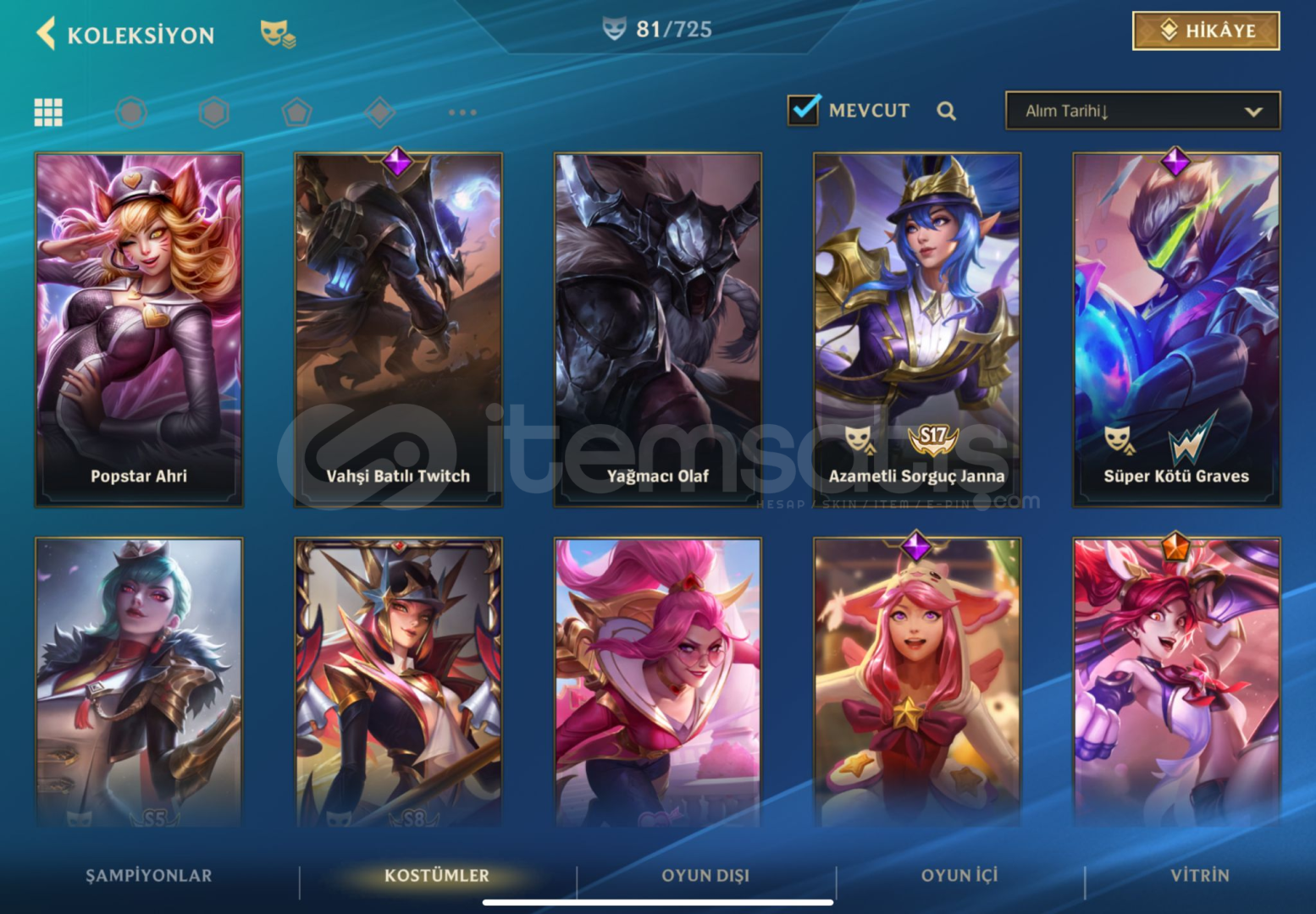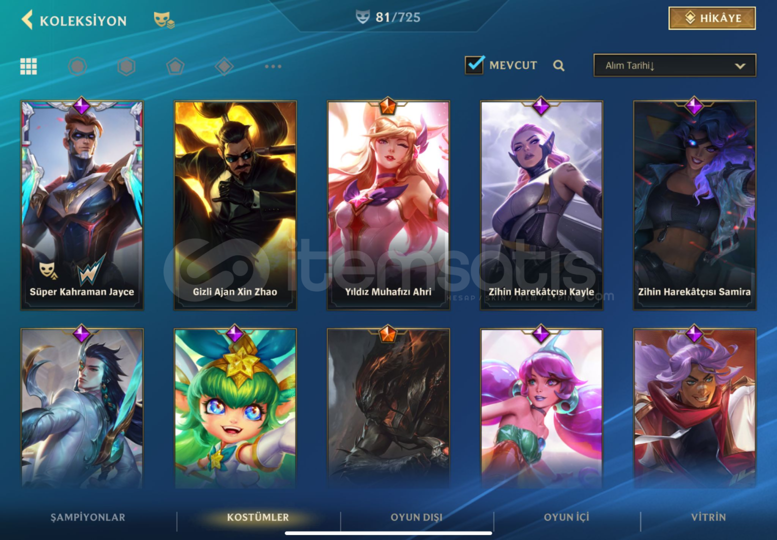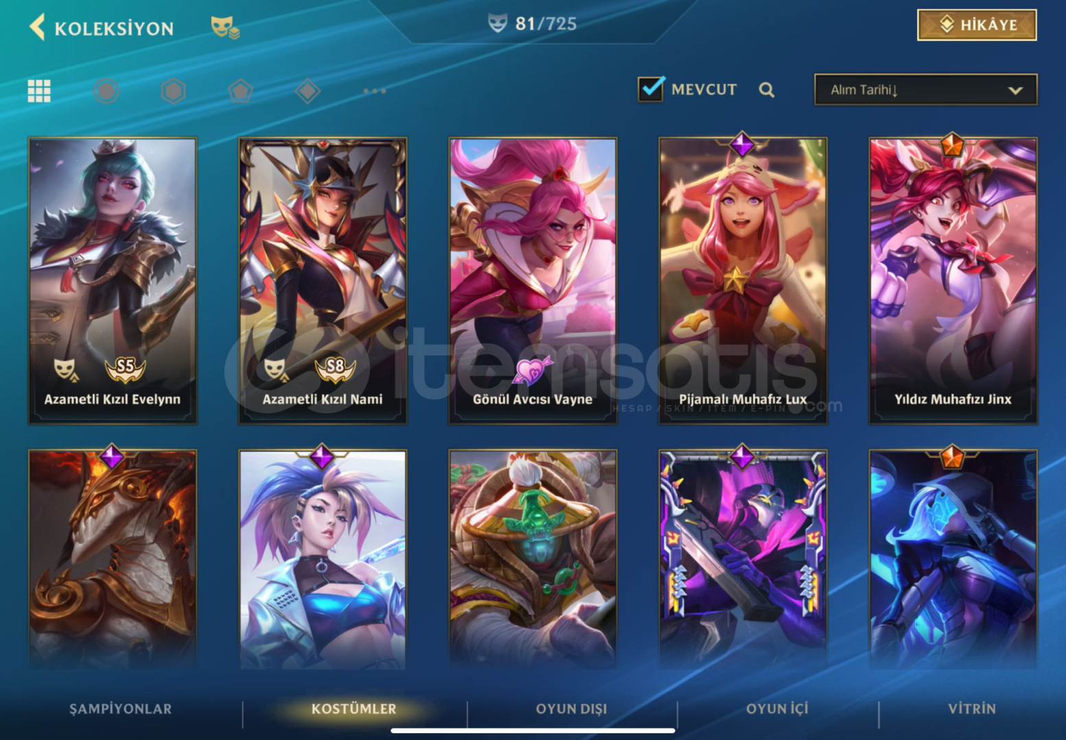 Siteye maksimum 10 tane fotoğraf yüklendiği için hepsini koyamadım, HESABIN TAMAMI : https://streamable.com/pp9jmhHesapta el emeğidir ve tertemizdir hiç bir sorun yaşamazsınız.Hesapta 81 Adet kostüm mevcuttur.Gecenin Kılıcı Yasuo, KDA ALL OUT Akali, Galaksi Katili Zed, Meltem Ejderi Master Yi gibi en güzel skinler hesapta mevcuttur.HESAPTA 8 TANE EFSANEVI KOSTUM BULUNMAKTADIRHesapta 120 adet şampiyon mevcutturHes...
