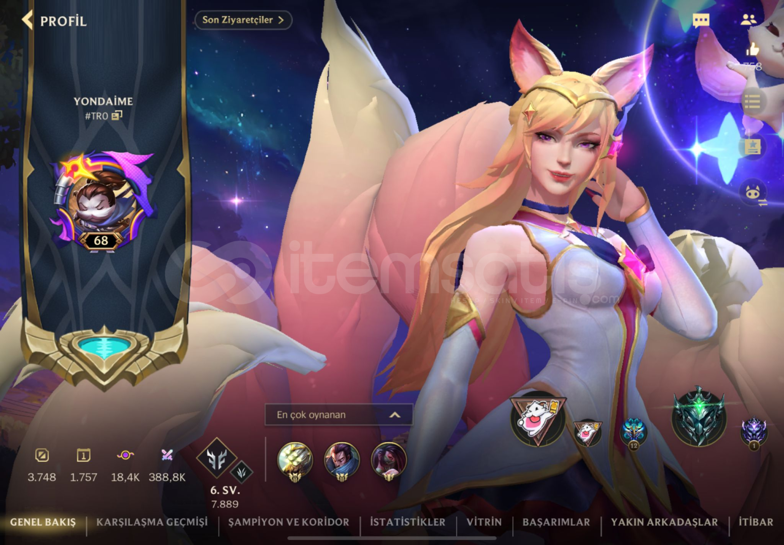 Gecenin Kılıcı Yasuo, KDA ALL OUT Akali, Galaksi Katili Zed, Meltem Ejderi Master Yi gibi en güzel skinler hesapta mevcuttur.