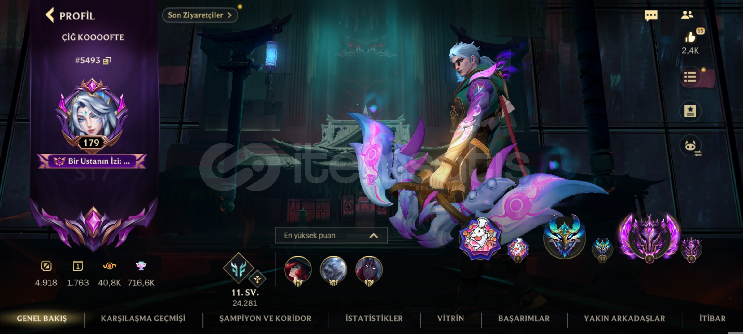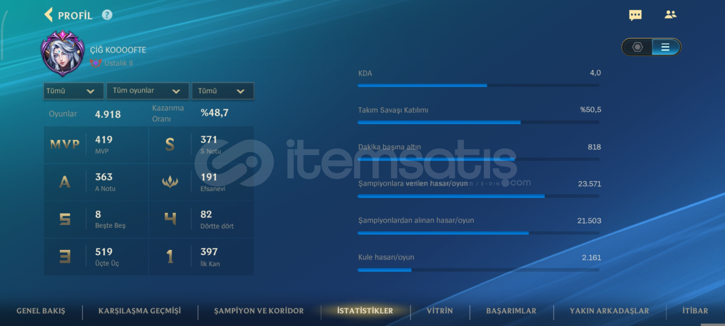 Merhabalar öncelikle. Hesabın ilk sahibiyim ve 1. Sezondan beri oynuyorum. Bu zamana kadar hesaba güncel olarak 16.000 lira para harcanmıştır. Tüm şampiyonlar açık olup toplamda 206 kostüm mevcuttur.Vitrin puanı 40.000 civarındadır.Bu ilanı paylaştığım gün ligi Master III'dür.Küçük bebeğim olduğu için oynayamıyorum ve bu yüzden satılıkt&...