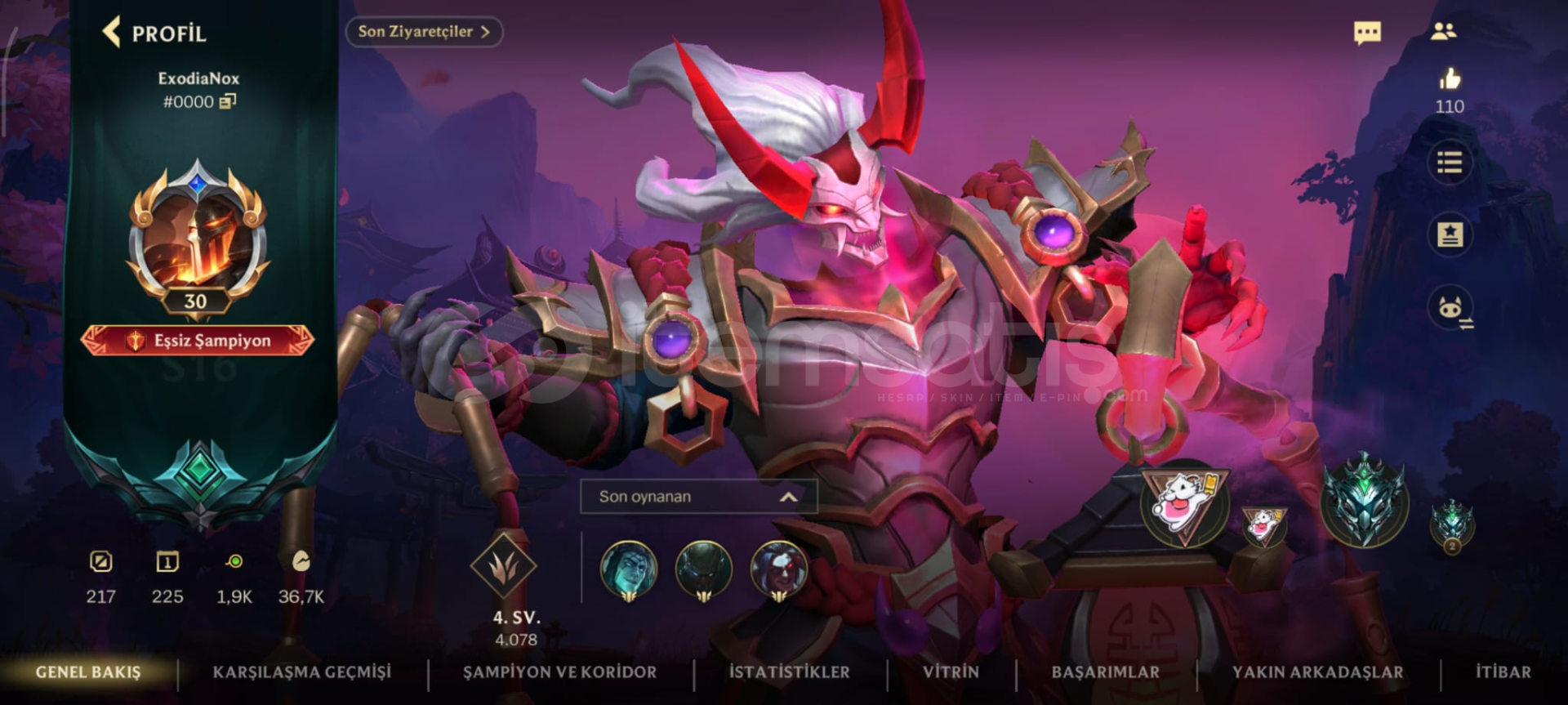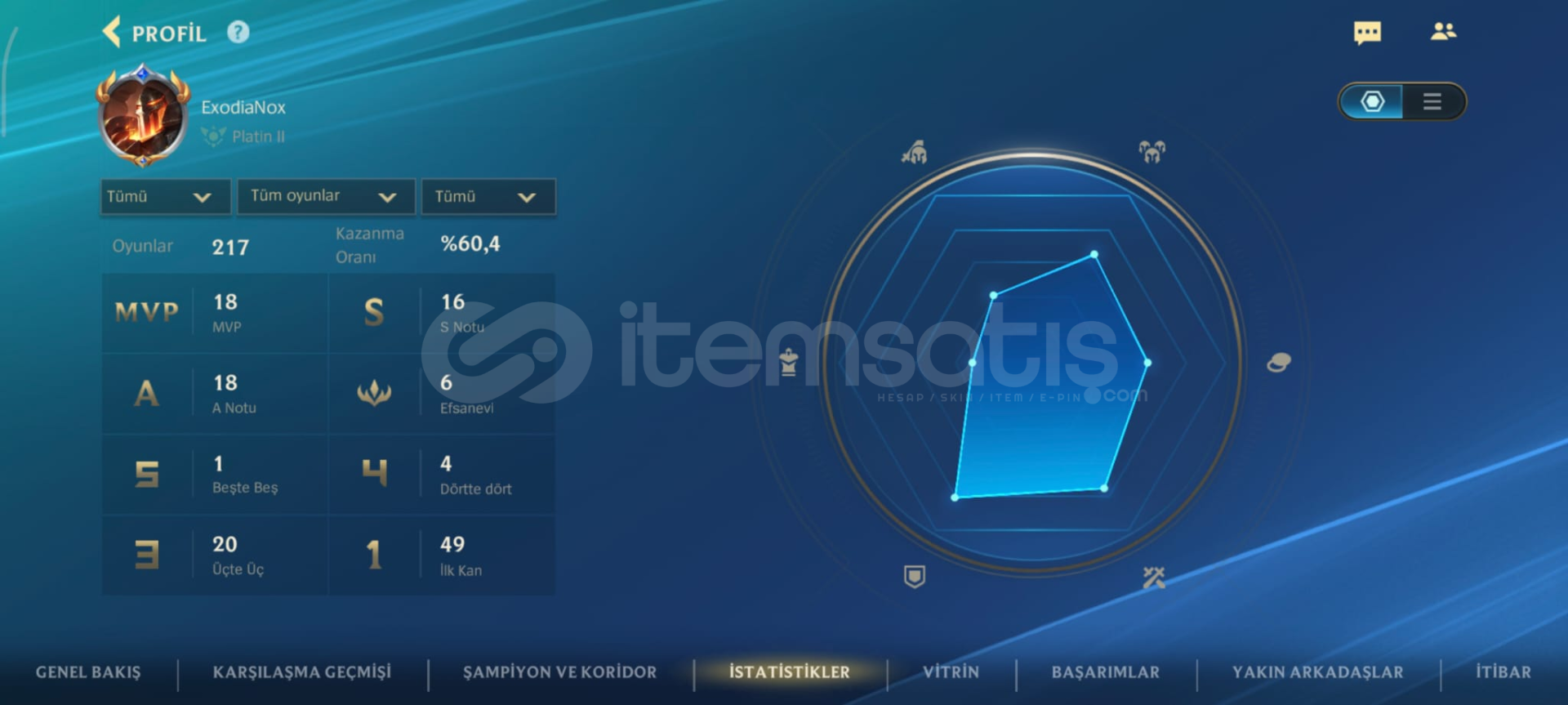 Rezil olan karşılaşma sistemi sebebiyle Master olmam gereken eloda random eşleşme ile plat stuck kaldım toplam 217 oyun oynanan hesapta oyunda geçirilen gün 225 diğer detaylar için ilan fotoğraflarına bakıp, yetmediği yerde yazabilirsiniz