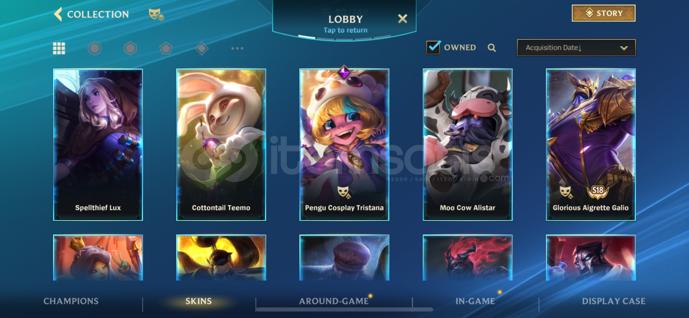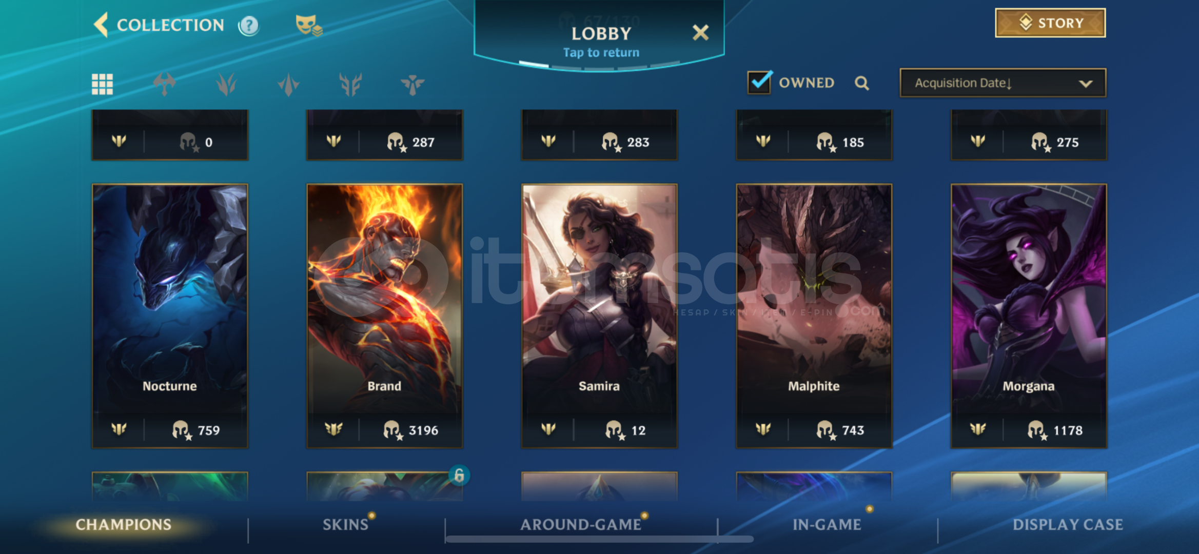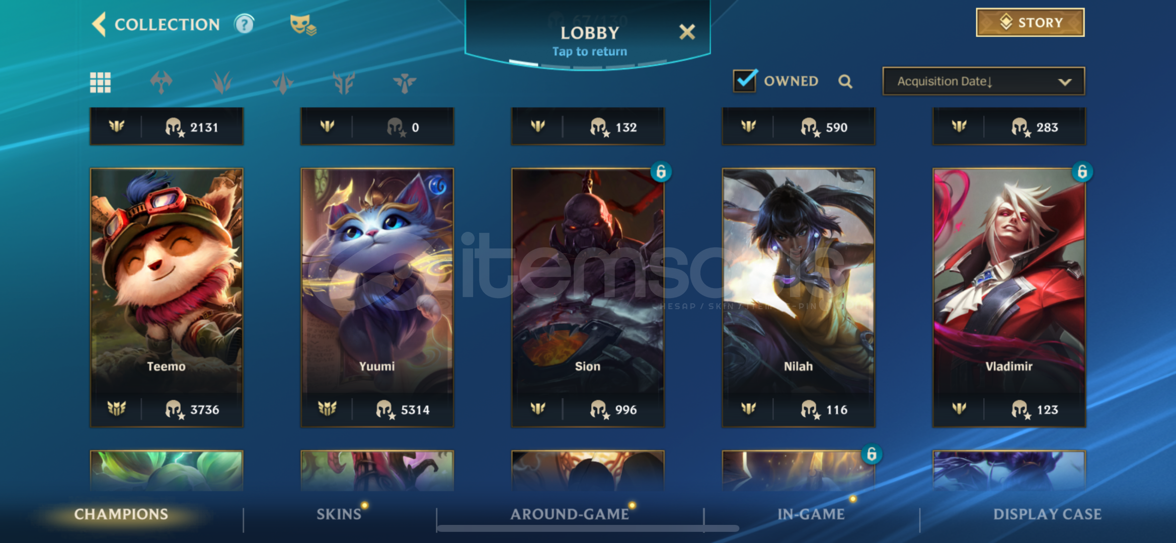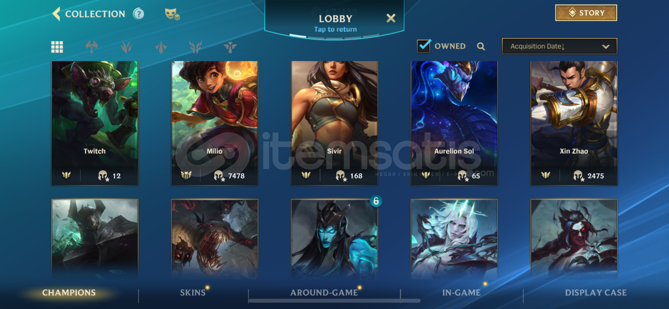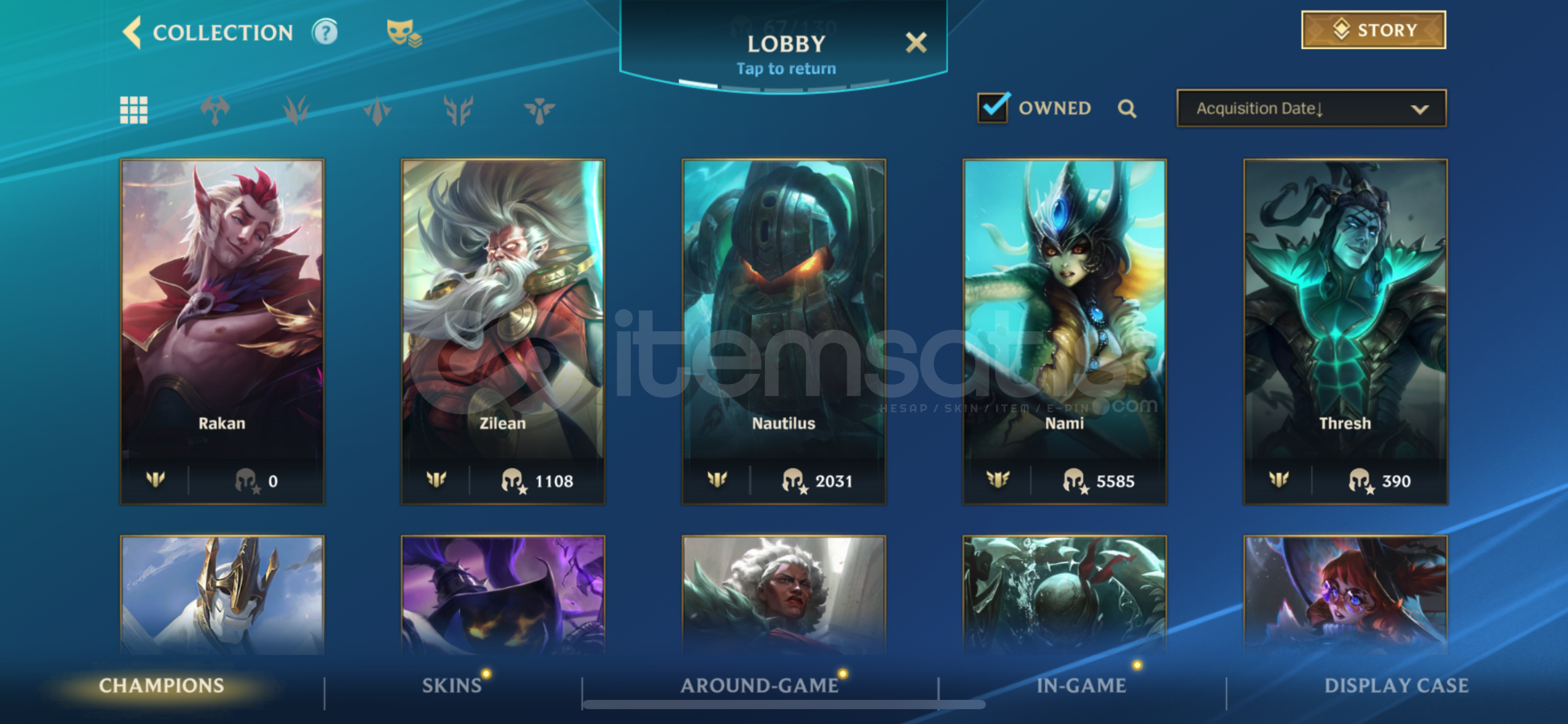 hesap s18 itibariyle suan 89 damgadir.peak90 damga67 sampiyon 20 kostum6k koleksiyon skoru750 silverdustlootda 2 legendary 1 epic skin (ashe vayne legendary, fizz epic)ilk mailiyle verilecektirstellar bonds uyeligi vardir 10 günü kaldi 550 tl degerinde aylik üyelik.
