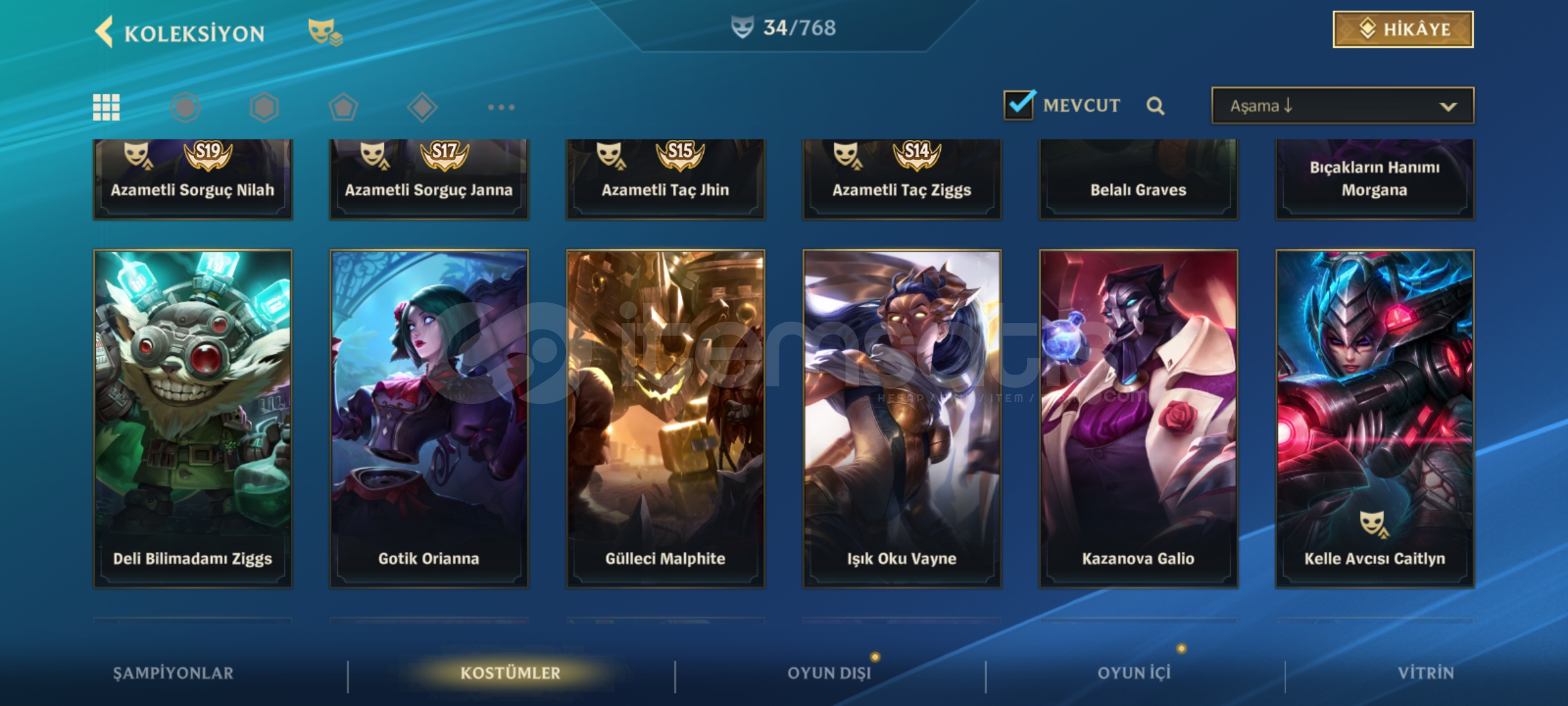 Jeton Düşmanı Yasuo, Ejderha Terbiyesicisi Lulu, Vızzmo Teemo, Ejder Katili Xin Zhao, Ay Canavarı Fiora, Bahçe Partisi Braum, Işık Muhafızı Olaf, Vahşi Batılı Jhin, Kelle Avcısı Caitlyn, Ejder Katili Vayne, Silahşör Lucian, Seri Ok Varus, Yağmacı Ashe, Işık Oku Vayne, Magma Renekton, Oyuncakton, Belalı Graves, Bıçakların Hanımı Morgana, Deli Bilim Adamı Ziggs, Manati Nami, Kazanova Galio, Gotik Orianna, Savaş Ustası Katarina, Şok Bıçak ZED, Gülleci Malphite ve Azametli kostümleri...