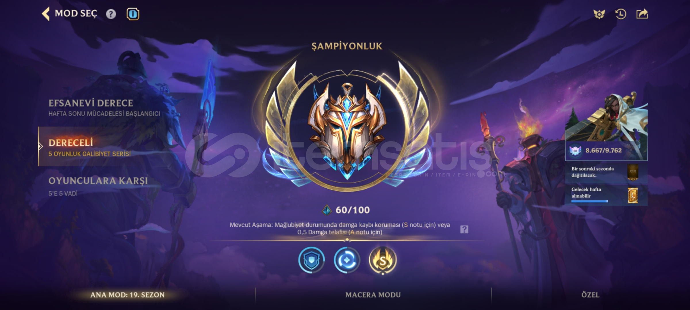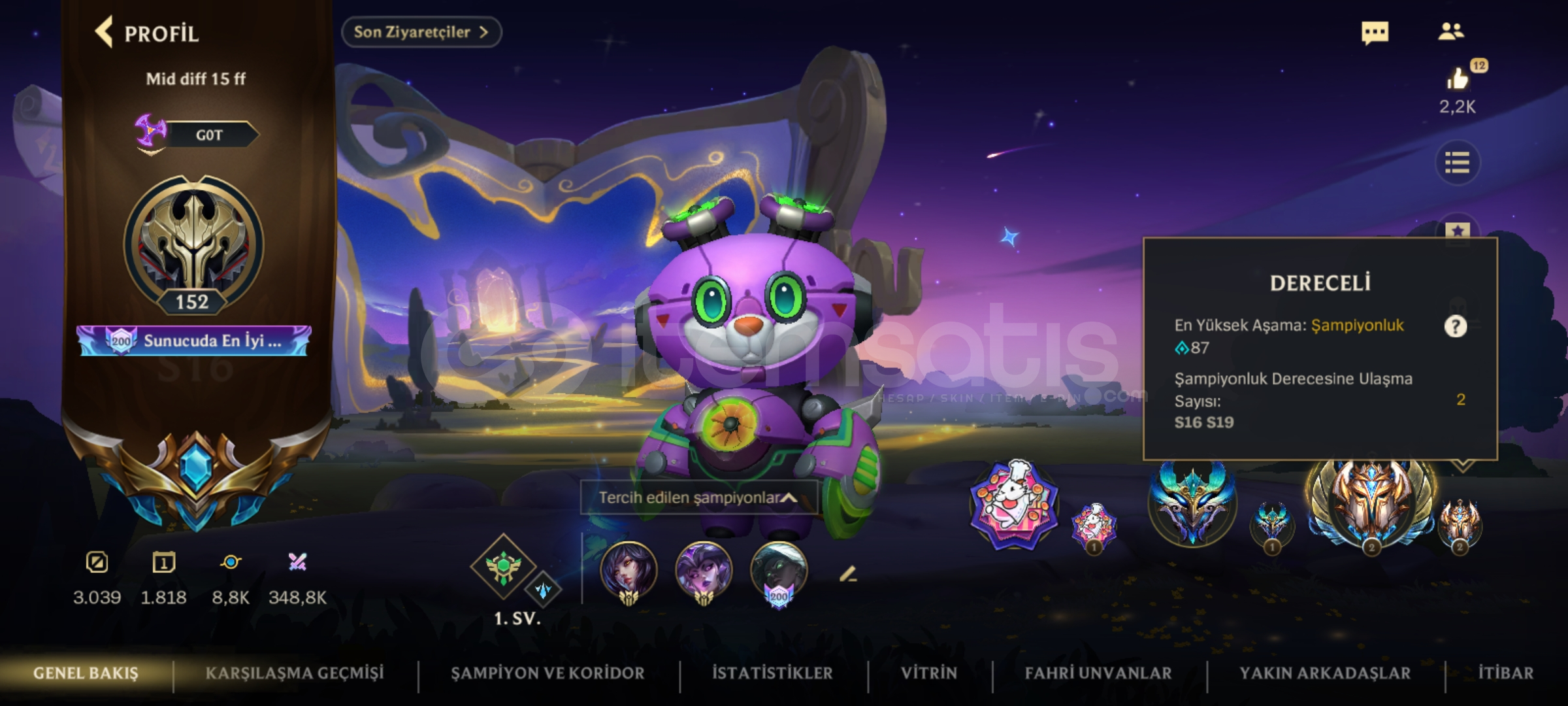 Anlık Challenger (Şampiyonluk 60DAMGA) elodadır. 150 LEVEL 80 şampiyon - 35 kostüm 46k MAVİ ÖZ bulunmaktadır. İlk sezon açılmış Challenger (87 damga) peak hesaptır. 3 koridoru 10 level üstü olduğu için lobilere girince isim yanında çok yönlü ustası etiketi vardır. Görsellerde tüm bilgiler mevcuttur bakabilirsiniz. Senna'da anlık olarak ilk 100'de dir.