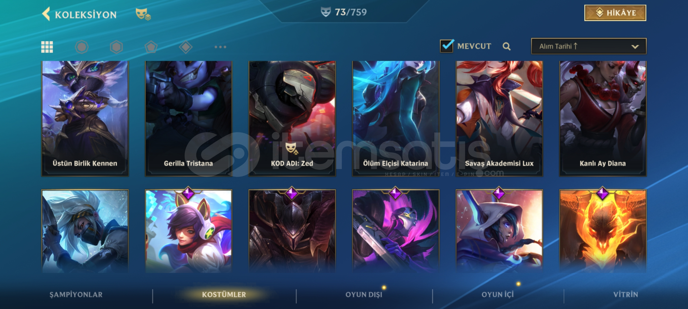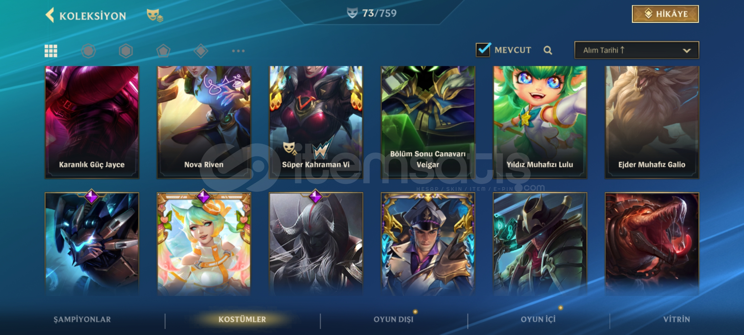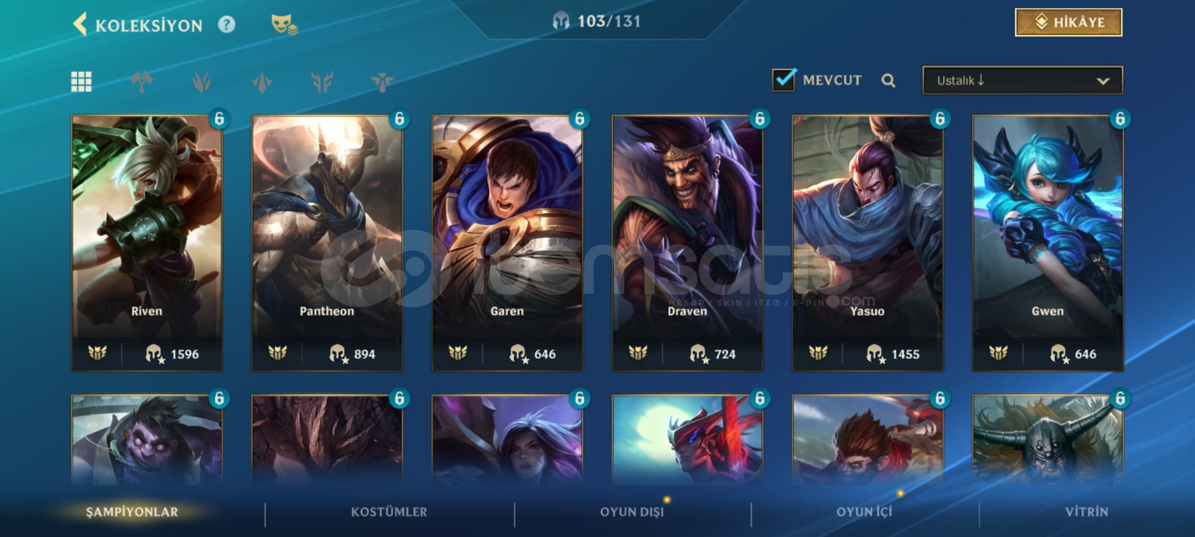 DETAYLI BİLGİ İÇİN ÖZELDEN YAZABİLİRSİNİZ*Pazarlık Olur.- Hesapta 73 Kostüm Vardır - Hesapta 103 Tane Şampiyon Vardır.-Hesapta 19.400 Mavi Öz Vardır.-40 ADET DESTANSI KOSTÜMEFSANE KOSTÜMLER!!-YEŞİM EJDER WUKONG-ŞAFAĞIN KILICI RİVEN-YÜCE KRAL GAREN-BÖLÜM SONU CANAVARI VEİGAR-KOD ADI RENEKTON-ŞAFAĞIN RUHU YONE-VAHŞİ BATILI LUCİAN - H...