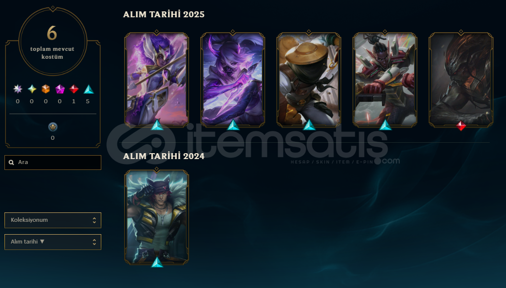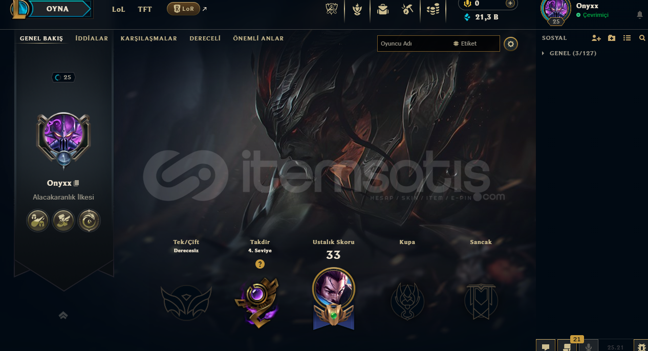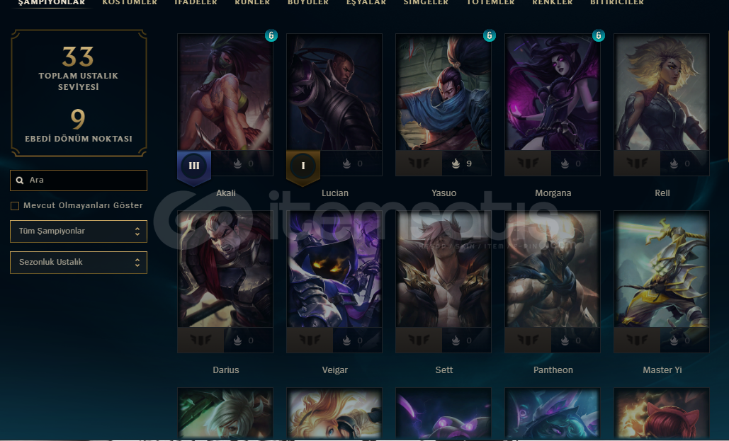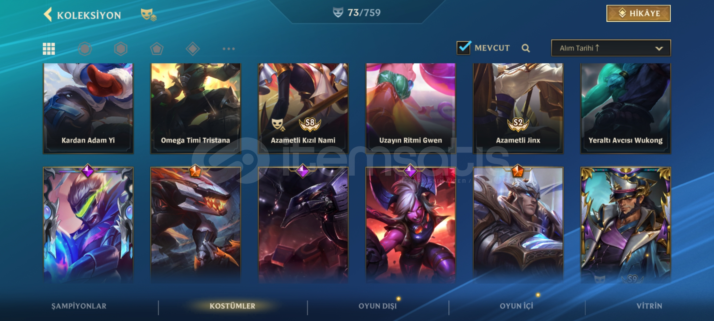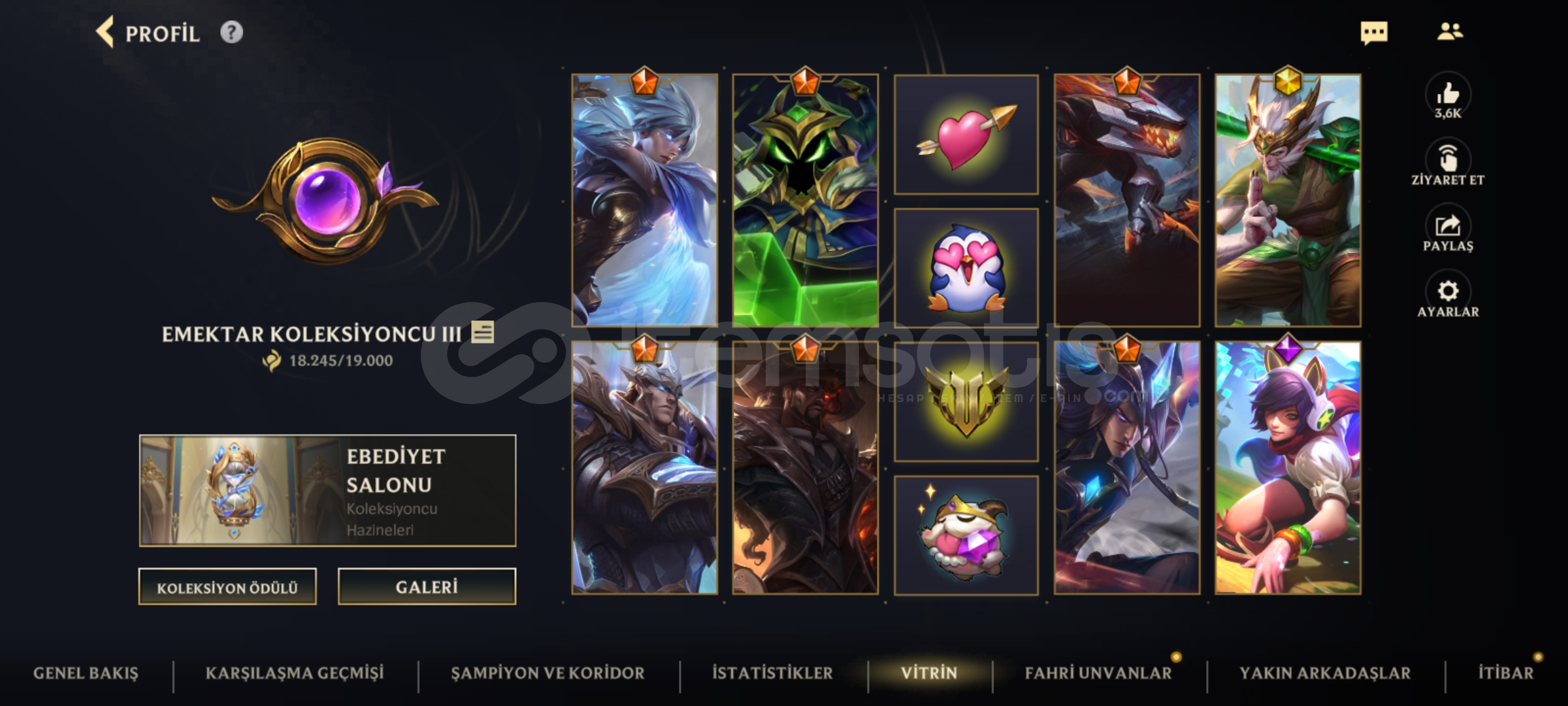 DETAYLI BİLGİ İÇİN ÖZELDEN YAZABİLİRSİNİZ*Pazarlık Olur.- Hesapta 73 Kostüm Vardır - Hesapta 103 Tane Şampiyon Vardır.-Hesapta 19.400 Mavi Öz Vardır.-40 ADET DESTANSI KOSTÜMEFSANE KOSTÜMLER!!-YEŞİM EJDER WUKONG-ŞAFAĞIN KILICI RİVEN-YÜCE KRAL GAREN-BÖLÜM SONU CANAVARI VEİGAR-KOD ADI RENEKTON-ŞAFAĞIN RUHU YONE-VAHŞİ BATILI LUCİAN - H...