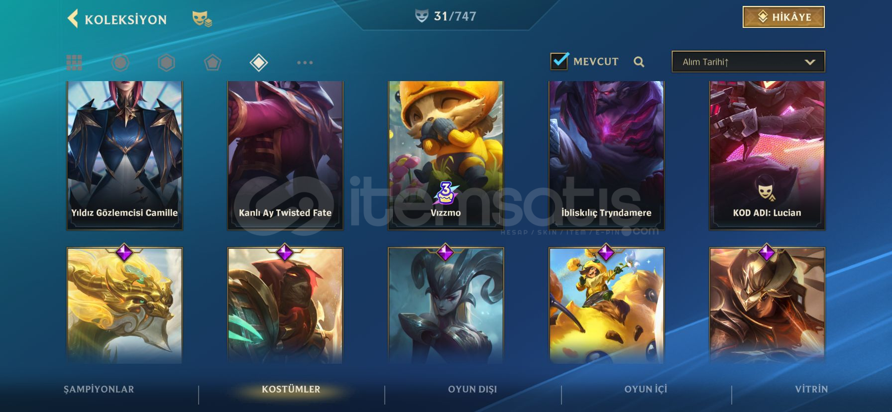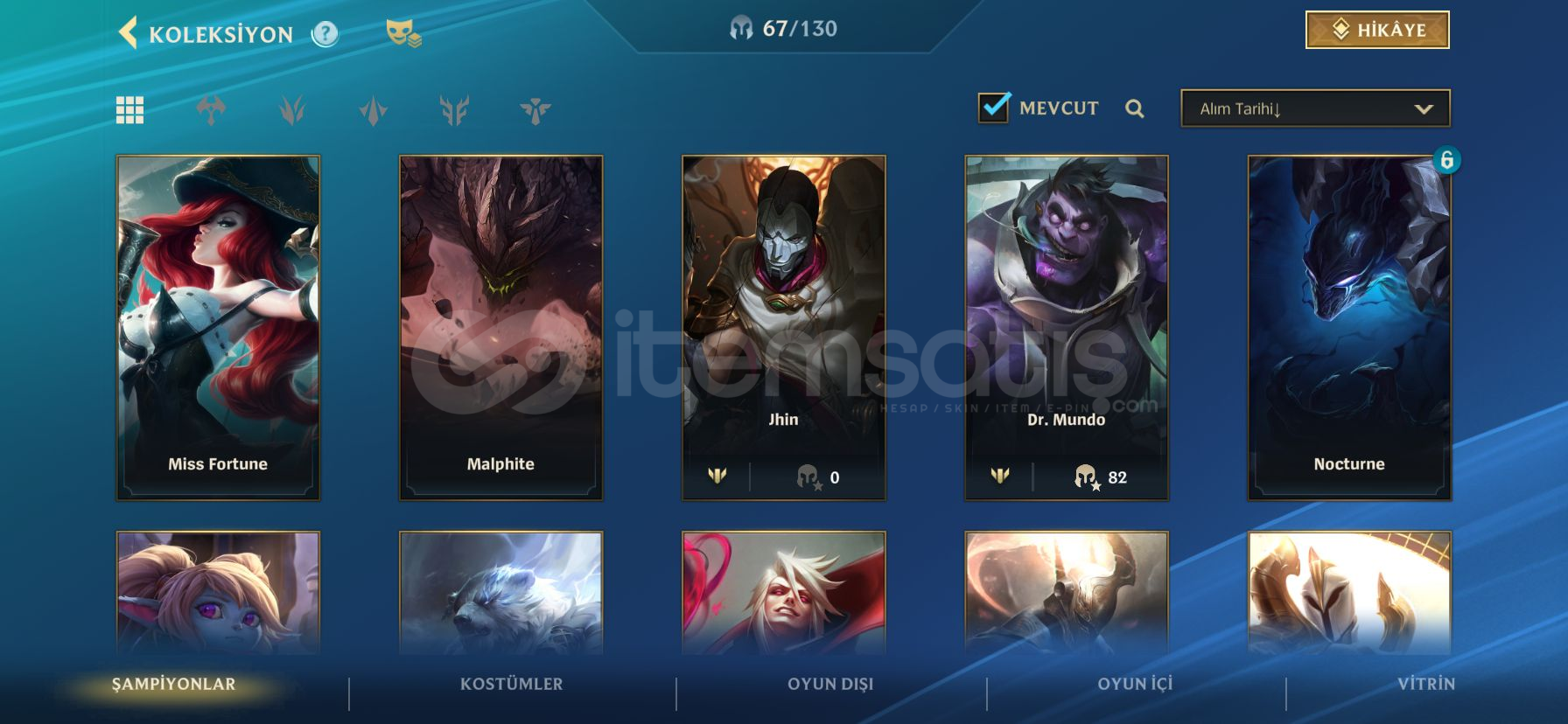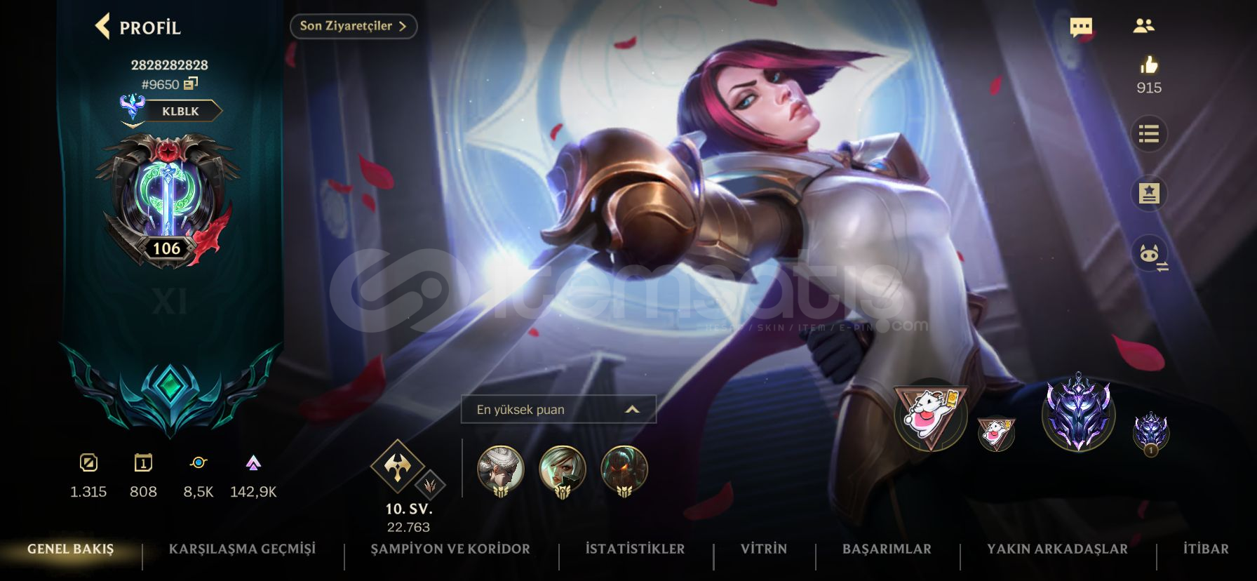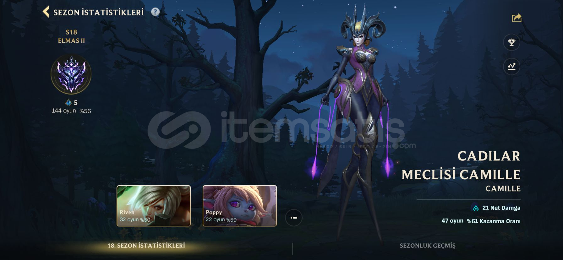-106 LEVEL-67 ŞAMPİYON-ELMAS 2 KÜME 6-31 KOSTÜM ( 1 EFSANEVİ / 15 DESTANSI)-KULLANICI ADI DEĞİŞTİRİLEBİLİR-MAİL DEĞİŞTİRİLEBİLİR-10 LEVEL BARON / 4 LEVEL ORMAN KORİDORU-CAMILLE & RIVEN & JAX & IRELIA & FIORA & NAUTILUS & SHEN & POPPY +5LVL USTALIK