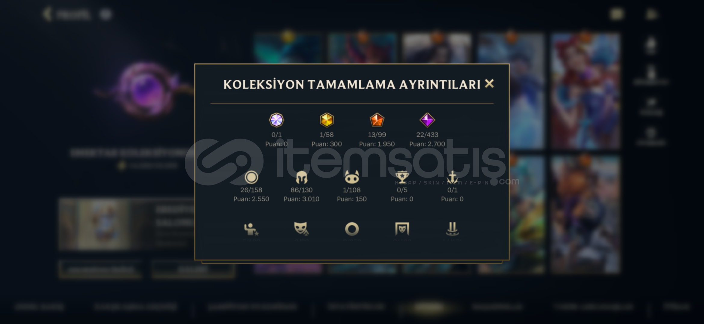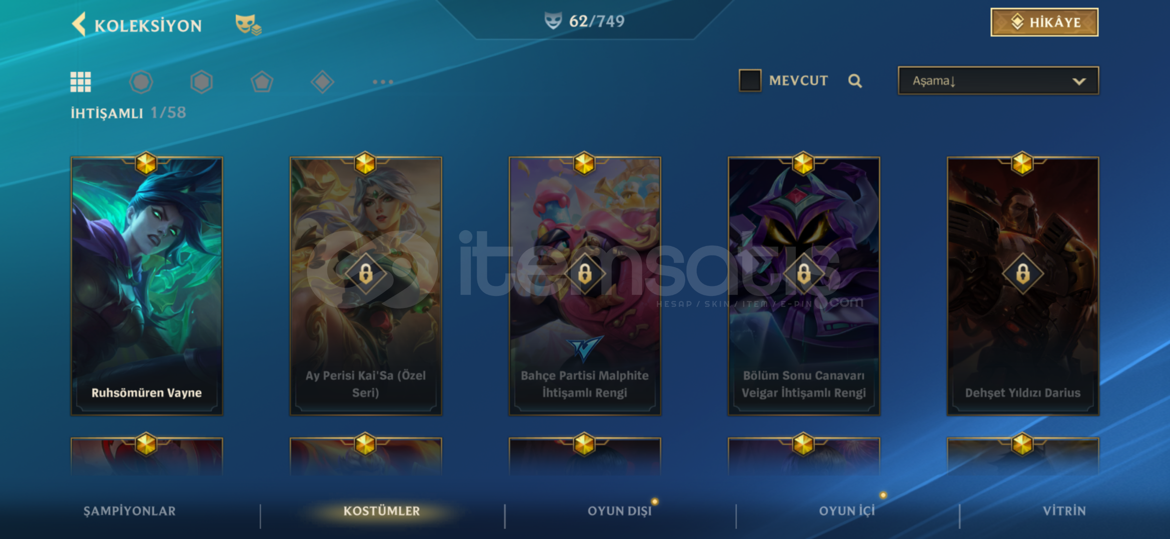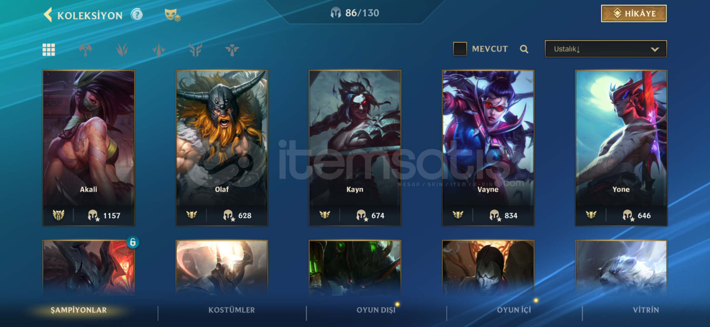 AKALİ , VAYNE , KATHARİNA MAİN HESAPÖNCEKİ SEZON TOP 50 AKALİ130 KARAKTERDEN 86 TANESİ AÇIK62 KOSTÜM2 YOLDAŞNAİDE BULUNAN TEKRAR SATIŞA ÇIKMİCAK OLAN HAVAİ FİŞEK JINXELMAZ 1MİD - ADC KORİDOR MAİNHESAB BAĞLI VALORANT MEVCUT