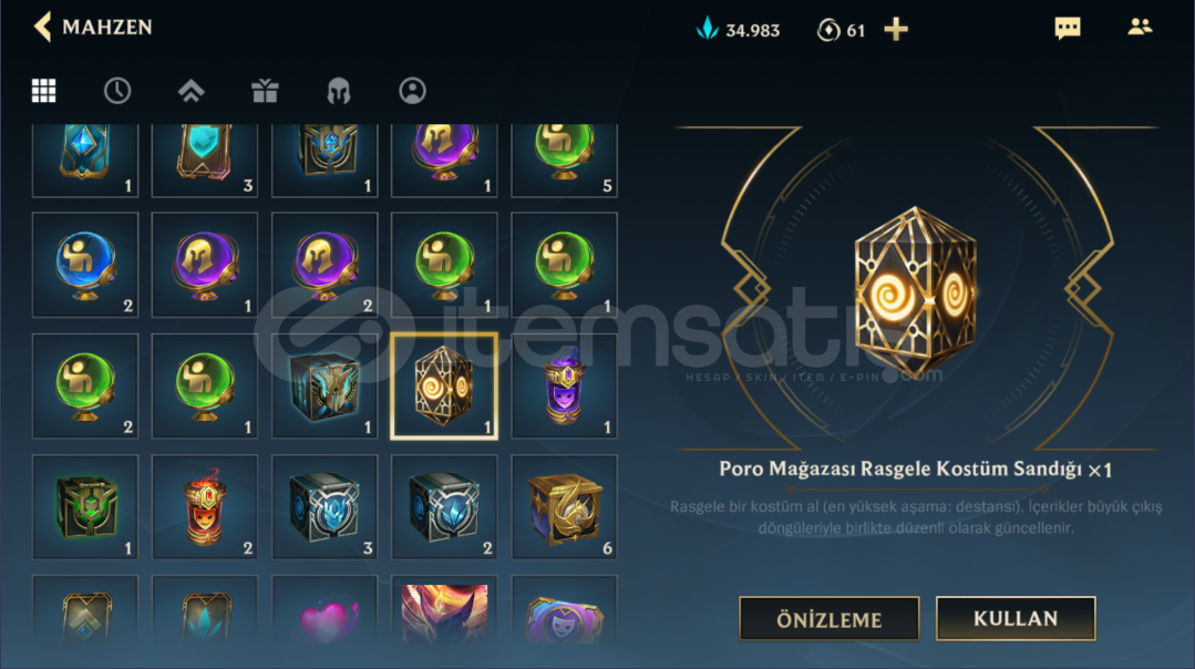 95 LevelMaster Düşmesi Altın34982 Mavi öz 61vç12 Çerçeve 54 Simge6 Profil Çerçevesi120 Poro Enerjisi1x Poro Mağzası Rasgele Kostüm Sandığı1x Rasgele Kostüm Sandığı2x Ay Festivali Rasgele Kostüm Sandığı48 Şampiyon 32 KostümEnvanter Resimlerde MevcutturEposta Şifre Değiştirebilirsiniz