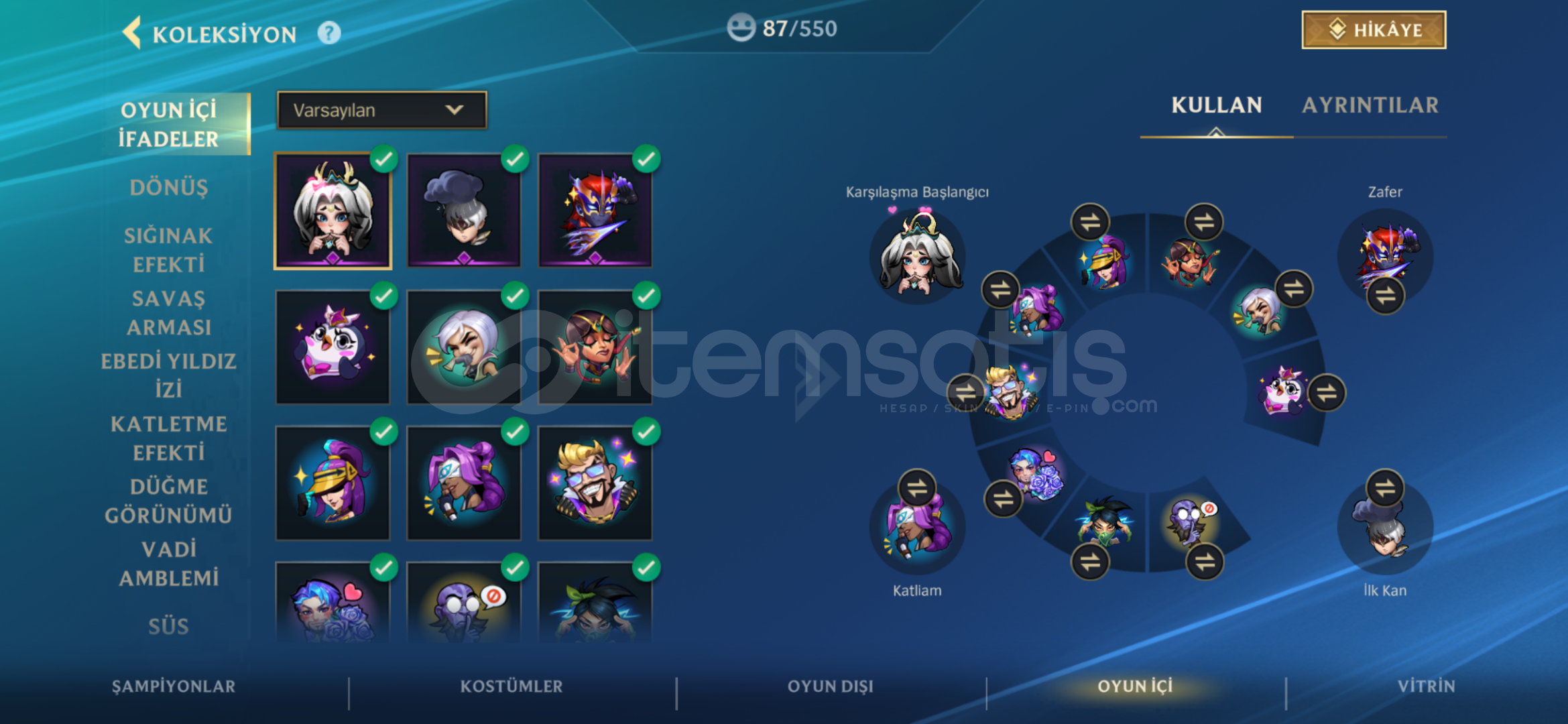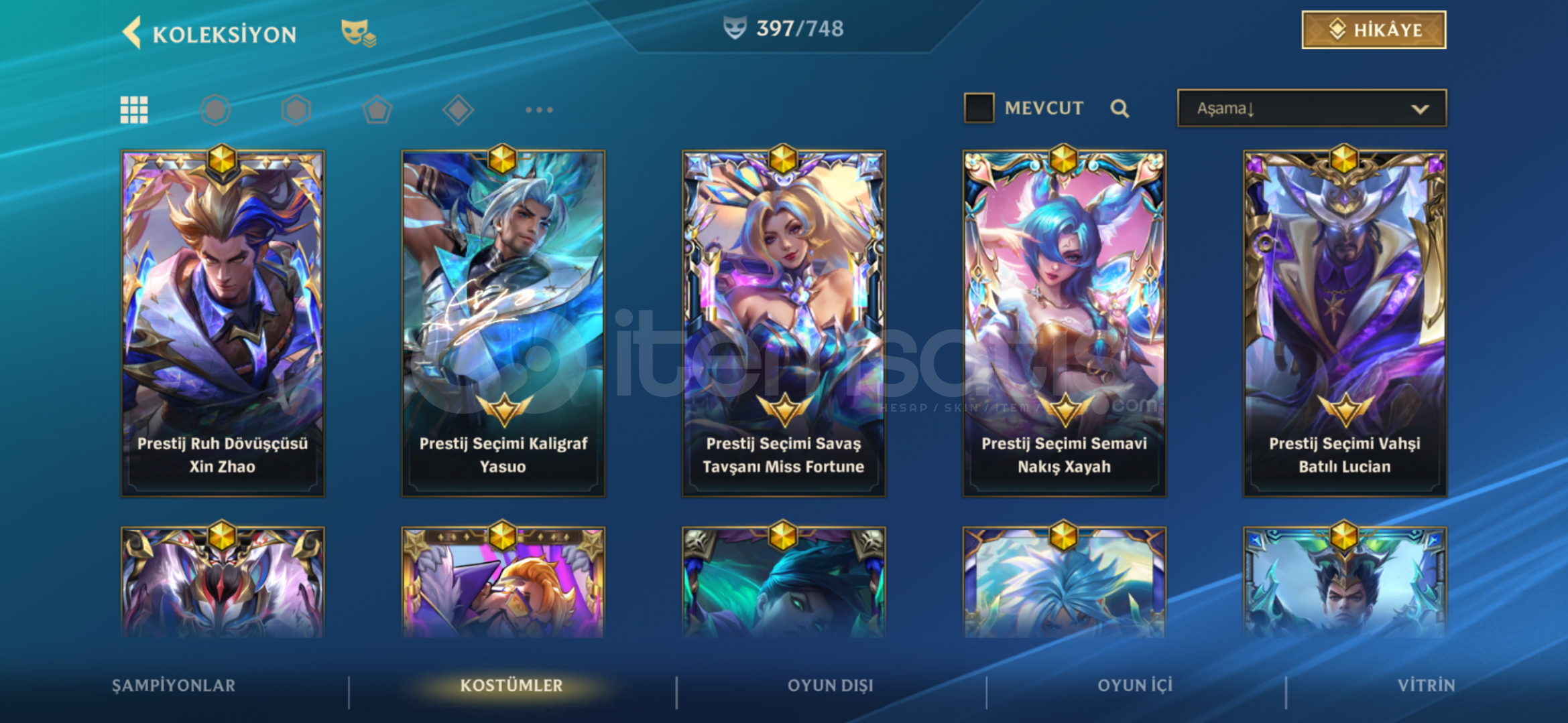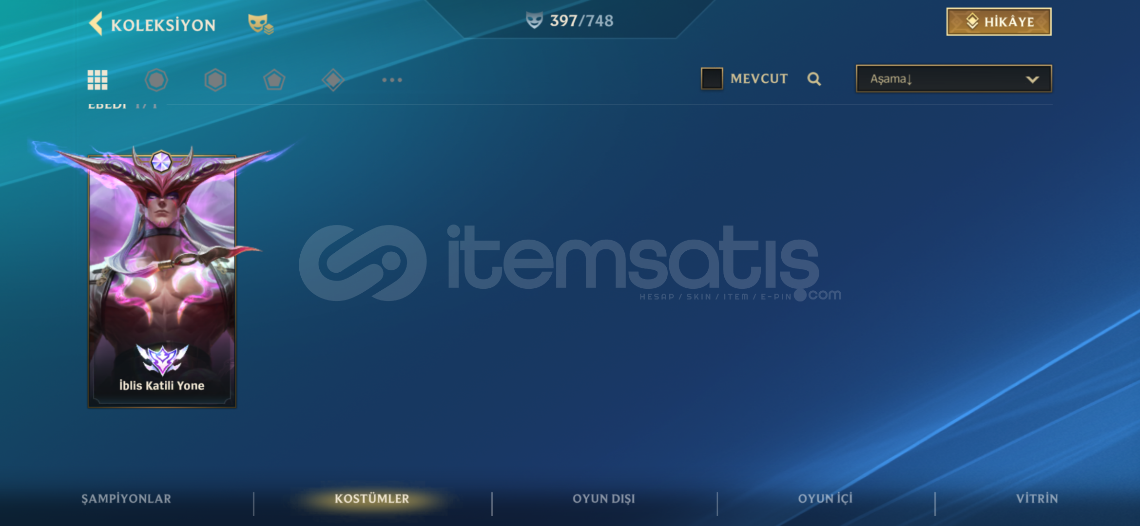 Hesabım doludur emek ve para harcanmıştır. Yayıncılığı bıraktığım için satıyorum.İblis katili Yone mevcuttur.23 adet ihtişamlı kostüm63 adet efsanevi kostüm239 adet destansı kostüm71 adet diğer kostümve daha fazlası detayları fotoğraflara ekledim
