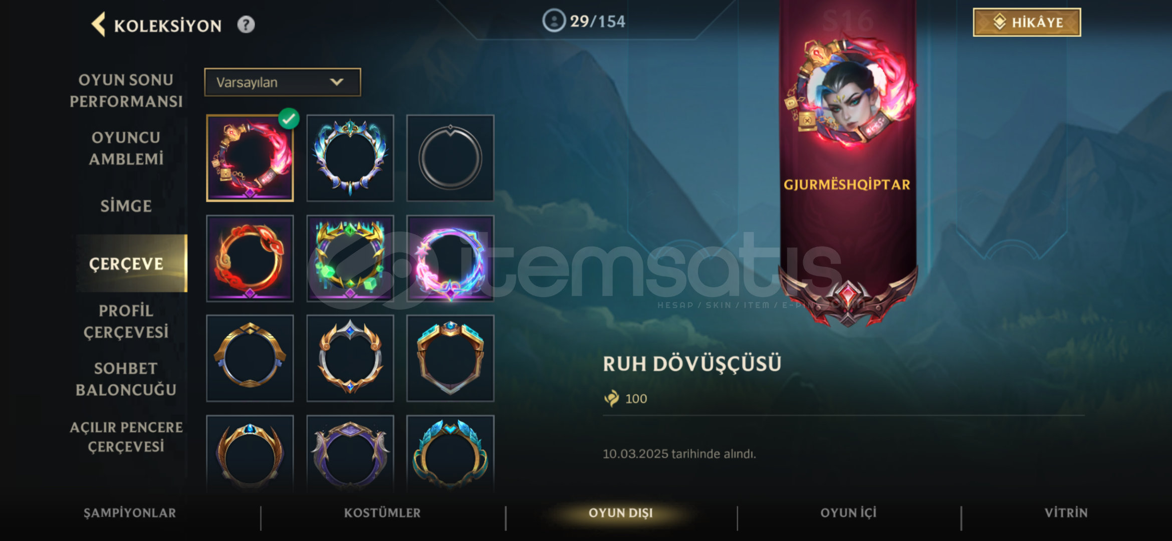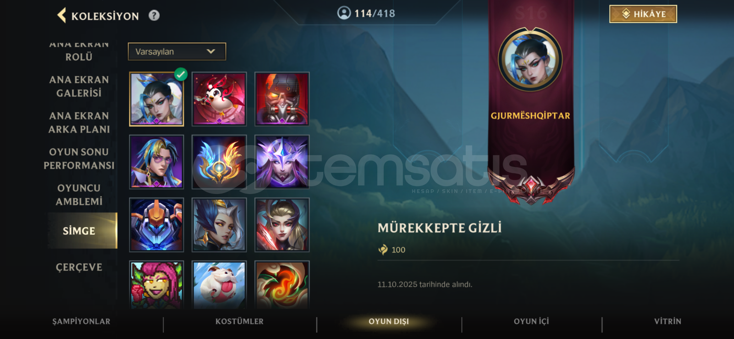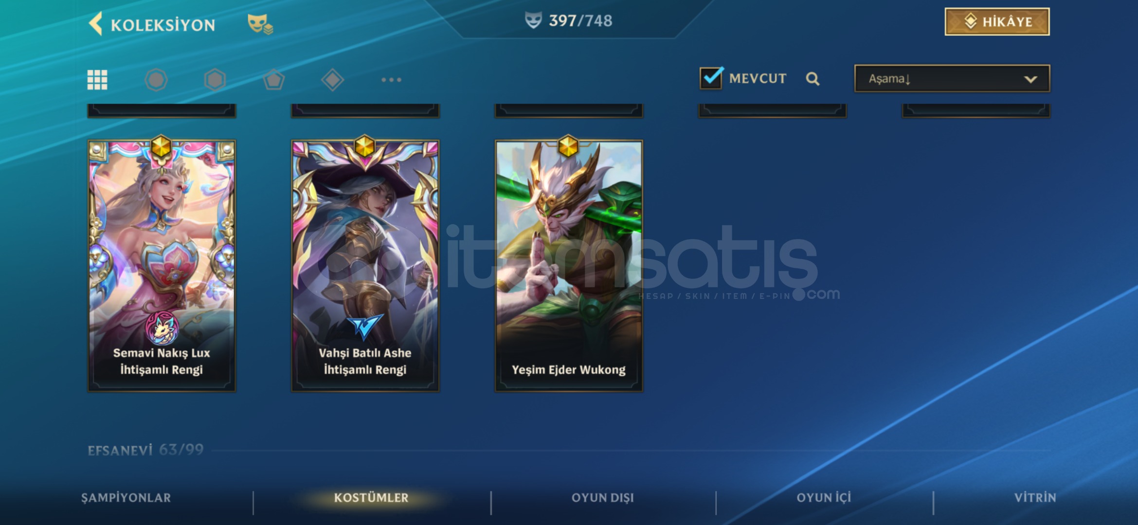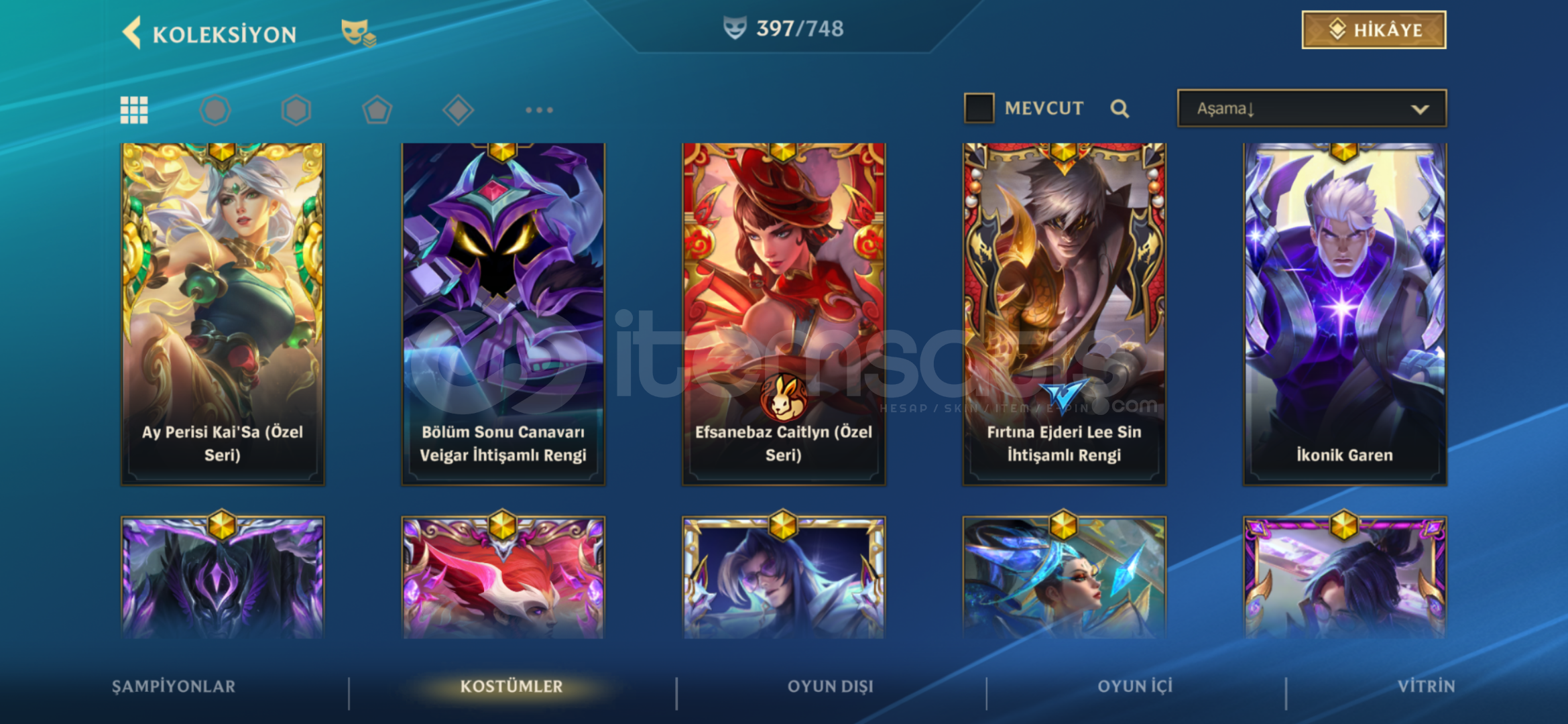 Hesabım doludur emek ve para harcanmıştır. Yayıncılığı bıraktığım için satıyorum.İblis katili Yone mevcuttur.23 adet ihtişamlı kostüm63 adet efsanevi kostüm239 adet destansı kostüm71 adet diğer kostümve daha fazlası detayları fotoğraflara ekledim