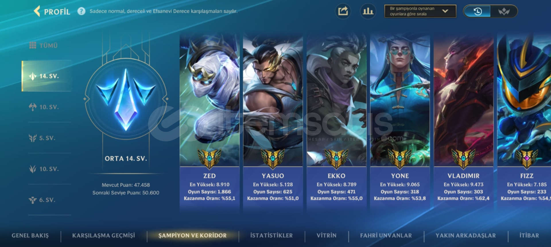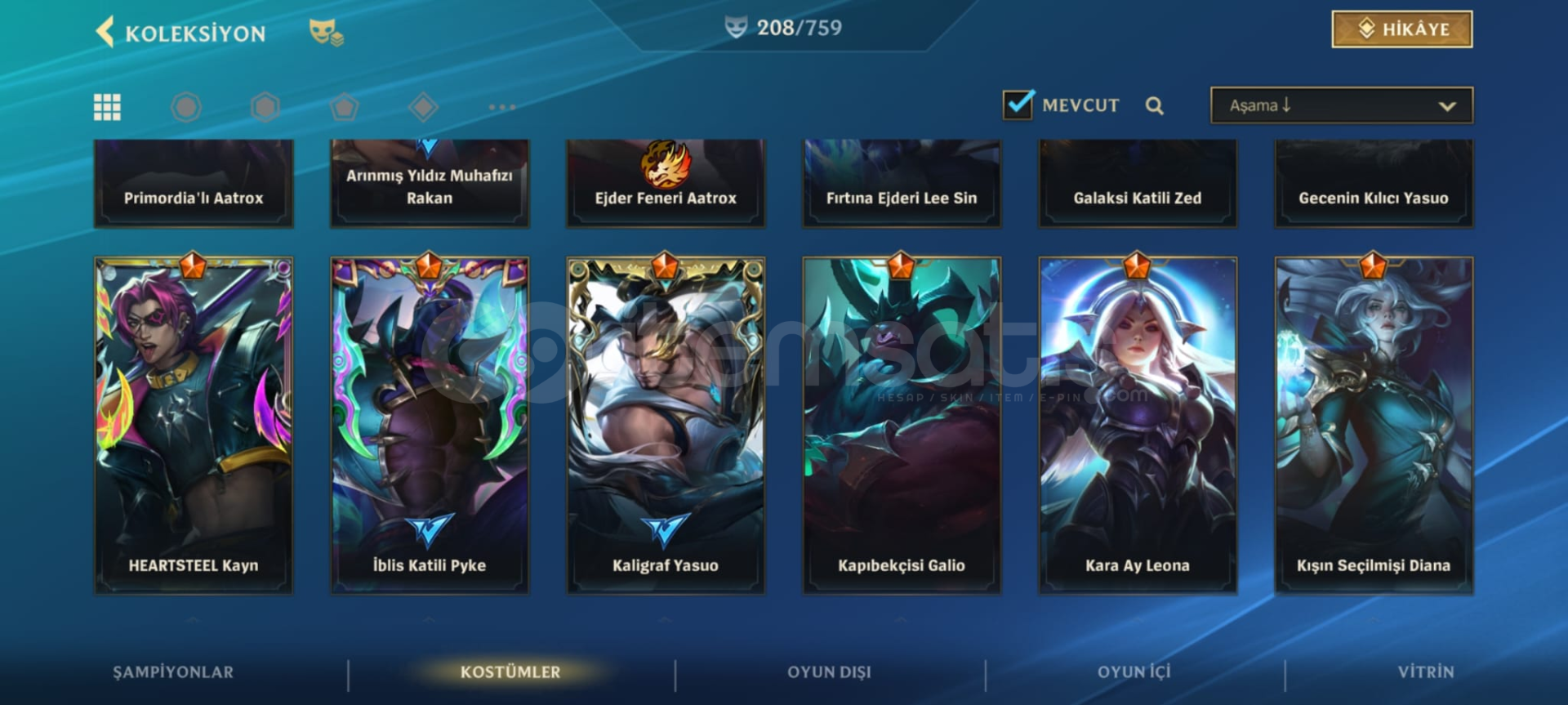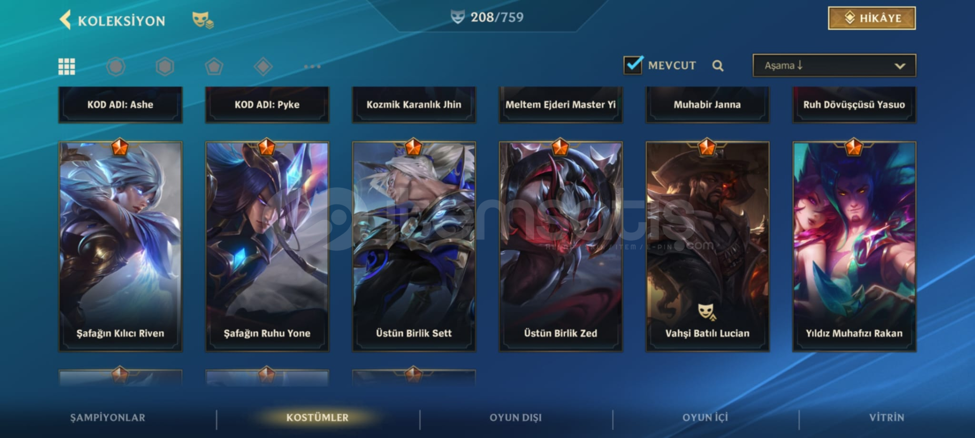 5 yıllık hesabımı satıyorum. içerisinde 208 adet kostüm vardır. bunların içerisinde;İBLİS KATİLİ YONE EBEDİKÜL ŞOVALYESİ PYKEKALİGRAF YASUOÜSTÜN BİRLİK: SETT, ZED(zed kostümleri full'dür)gibi koleksiyonluk kostümler mevcuttur. diğer kostümler; 27 LEGENDERY99 DESTANSIhesap şampiyonluk derecesini görmüş olup, çoğu sezonda da...
