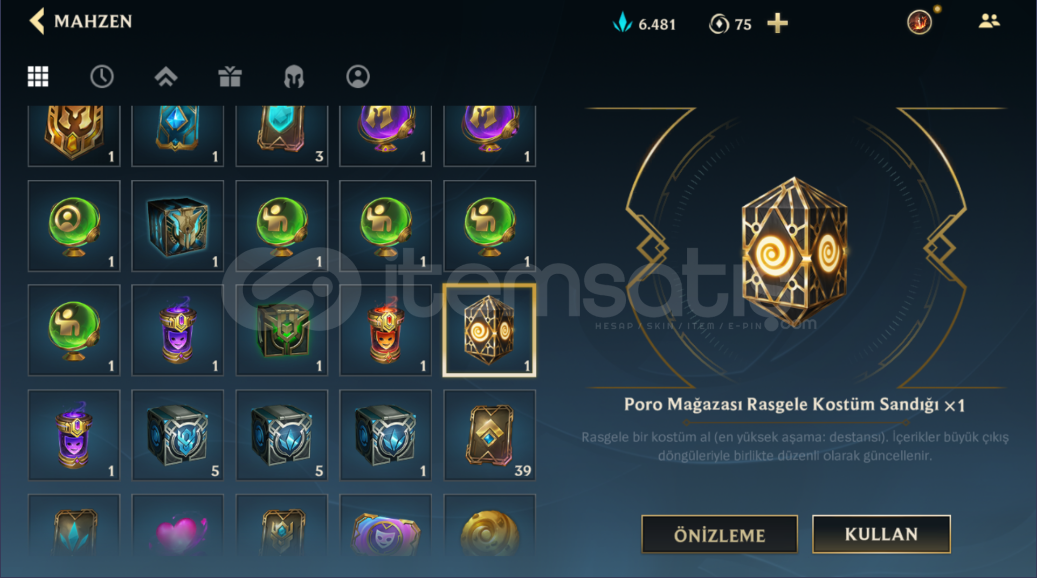 31 level6k mavi öz 75 vçMaster Düşmesi Altın 42x şampiyon sandığı1x Rasgele Kostüm Sandığı1x Vadi Rasgele Kostüm Sandığı1x Ay Festivali Rasgele Kostüm Sandığı1x Poro Mağzası Rasgele Kostüm Sandığı19 simge 7 çerçeve4620 poro enerjisi60 şampiyon 47 kostümEposta Şifre Değiştirebilirsiniz