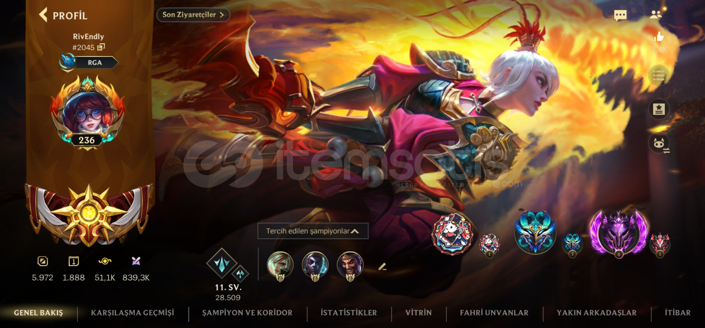 Oyunu bırakıyorum o yüzden satıyorum pc lol hesabı ile bağlantılı pc lol 349 lvl 100den fazla kostüm 50 den fazla 7 lvl sampiyon var ve 2022den beri hiç oyun atılmadı ve hesap mail değiştirme mevcut wild rift hesabı 236 lvl ilk sezondan beri oynanıyor en yüksek üstatlık görmüş hesap güncel ligi usta